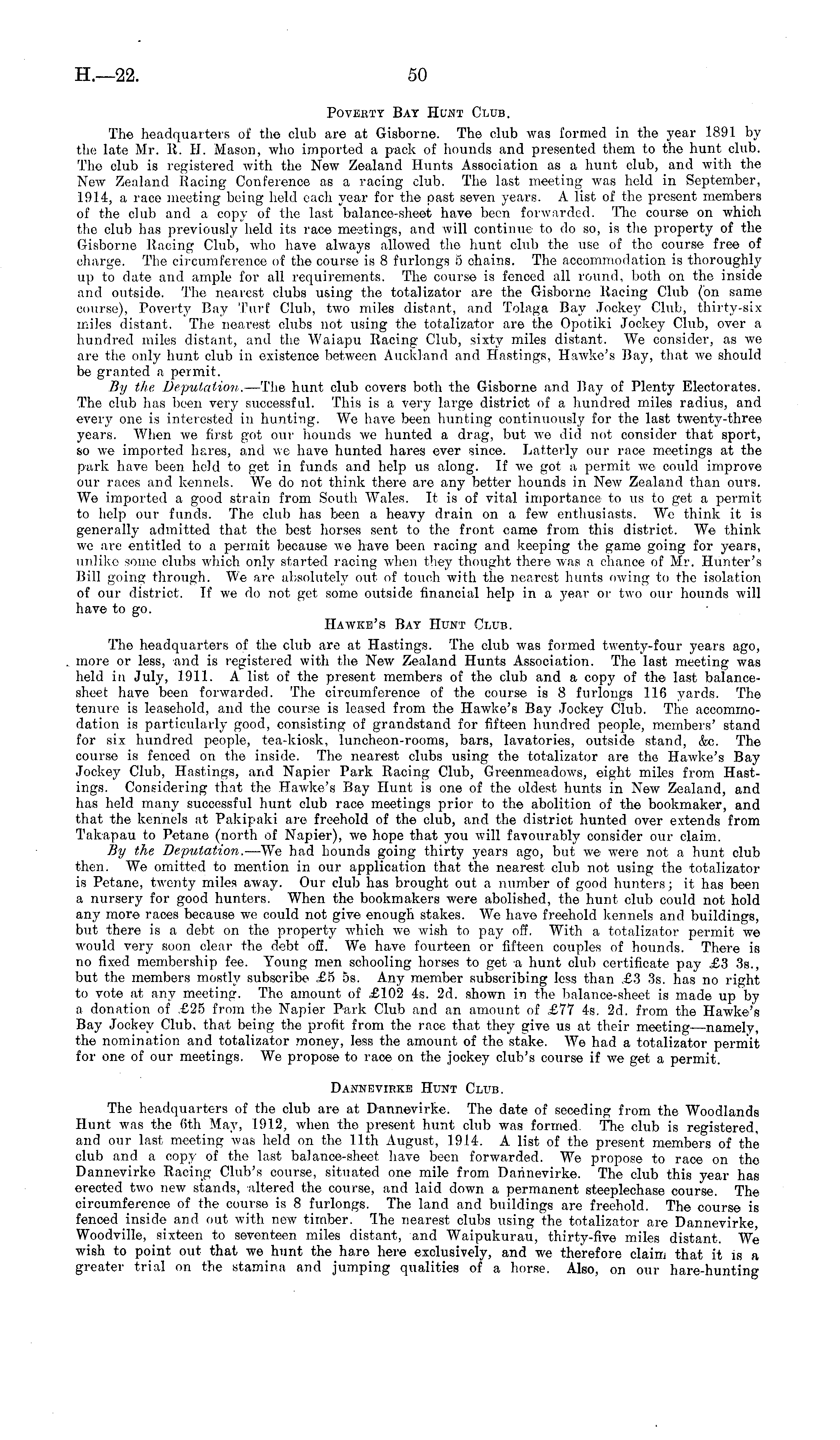 Poverty Bay Hunt Club. The headquarters of the club are at Gisborne. The club was formed in the year 1891 by the late Mr. R. H. Mason, who imported a pack of hounds and presented them to the hunt club. The club is registered with the New Zealand Hunts Association as a hunt club, and with the New Zealand Racing Conference as a racing club. The last meeting was held in September, 191.4, a race meeting being held each year for the past seven years. A list of the present members of the club and a copy of the last balance-sheet have been forwarded. The course on which the club has previously held its race meetings, and will continue to do so, is the property of the Gisborne Racing Club, who have always allowed the hunt club the use of the course free of charge. The circumference of the course is 8 furlongs 5 chains. The accommodation is thoroughly up to date and ample for all requirements. The course is fenced all round, both on the inside and outside. The nearest clubs using the totalizator are the Gisborne Racing Club (on same course), Poverty Bay Turf Club, two miles distant, and Tolaga Bay Jockey Club, thirty-six miles distant. The nearest clubs not using the totalizator are the Opotiki Jockey Club, over a hundred miles distant, and the Waiapu Racing Club, sixty miles distant. We consider, as we are the only hunt club in existence between Auckland and Hastings, Hawke's Bay, that we should be granted a permit. By the Deputation. —The hunt club covers both the Gisborne and Ray of Plenty Electorates. The club has been very successful. This is a very large district of a hundred miles radius, and every one is interested in hunting. We have been hunting continuously for the last twenty-three years. When we first got our hounds we hunted a drag, but we did not consider that sport, so we imported hares, and we have hunted hares ever since. Latterly our race meetings at the park have been held to get in funds and help us along. If we got a permit we could improve our races and kennels. We do not think there are any better hounds in New Zealand than ours. We imported a good strain from South Wales. It is of vital importance to us to get a permit to help our funds. The club has been a heavy drain on a few enthusiasts. We think it is generally admitted that the best horses sent to the front came from this district. We think we are entitled to a permit because we have been racing and keeping the game going for years, unlike some clubs which only started racing when they thought there was a chance of Mr. Hunter's Bill going through. We are absolutely out of touch with the nearest hunts owing to the isolation of our district. If we do not get some outside financial help in a year or two our hounds will have to go. Hawke's Bay Hunt Club. The headquarters of the club are at Hastings. The club was formed twenty-four years ago, more or less, and is registered with the New Zealand Hunts Association. The last meeting was held in July, 1911. A list of the present members of the club and a copy of the last balancesheet have been forwarded. The circumference of the course is 8 furlongs 116 yards. The tenure is leasehold, and the course is leased from the Hawke's Bay Jockey Club. The accommodation is particularly good, consisting of grandstand for fifteen hundred people, members' stand for six hundred people, tea-kiosk, luncheon-rooms, bars, lavatories, outside stand, &c. The course is fenced on the inside. The nearest clubs using the totalizator are the Hawke's Bay Jockey Club, Hastings, and Napier Park Racing Club, Grcenmeadows, eight miles from Hastings. Considering that the Hawke's Bay Hunt is one of the oldest hunts in New Zealand, and has held many successful hunt club race meetings prior to the abolition of the bookmaker, and that the kennels at Pakipaki are freehold of the club, and the district hunted over extends from Takapau to Petane (north of Napier), we hope that you will favourably consider our claim. By the Deputation. —We had hounds going thirty years ago, but we were not a hunt club then. We omitted to mention in our application that the nearest club not using the totalizator is Petane, twenty miles away. Our club has brought out a number of good hunters; it has been a nursery for good hunters. When the bookmakers were abolished, the hunt club could not hold any more races because we could not give enough stakes. We have freehold kennels and buildings, but there is a debt on the property which we wish to pay off. With a totalizator permit we would very soon clear the debt off. We have fourteen or fifteen couples of hounds. There is no fixed membership fee. Young men schooling horses to get a hunt club certificate pay £3 35., but the members mostly subscribe £5 ss. Any member subscribing less than £3 3s. has no right to vote at any meeting. The amount of £102 4s. 2d. shown in the balance-sheet is made up by a donation of £25 from the Napier Park Club and an amount of £77 4s. 2d. from the Hawke's Bay Jockey Club, that being the profit from the race that they give us at their meeting—namely, the nomination and totalizator money, less the amount of the stake. We had a totalizator permit for one of our meetings. We propose to race on the jockey club's course if we get a permit. Dannevirke Hunt Club. The headquarters of the club are at Dannevirke. The date of seceding from the Woodlands Hunt was the 6th May, 1912, when the present hunt club was formed. The club is registered, and our last meeting was held on the 11th August, 1914. A list of the present members of the club and a copy of the last balance-sheet have been forwarded. We propose to race on the Dannevirke Racing Club's course, situated one mile from Dannevirke. The club this year has erected two new stands, altered the course, and laid down a permanent steeplechase course. The circumference of the course is 8 furlongs. The land and buildings are freehold. The course is fenced inside and out with new timber. Ihe nearest clubs usin
