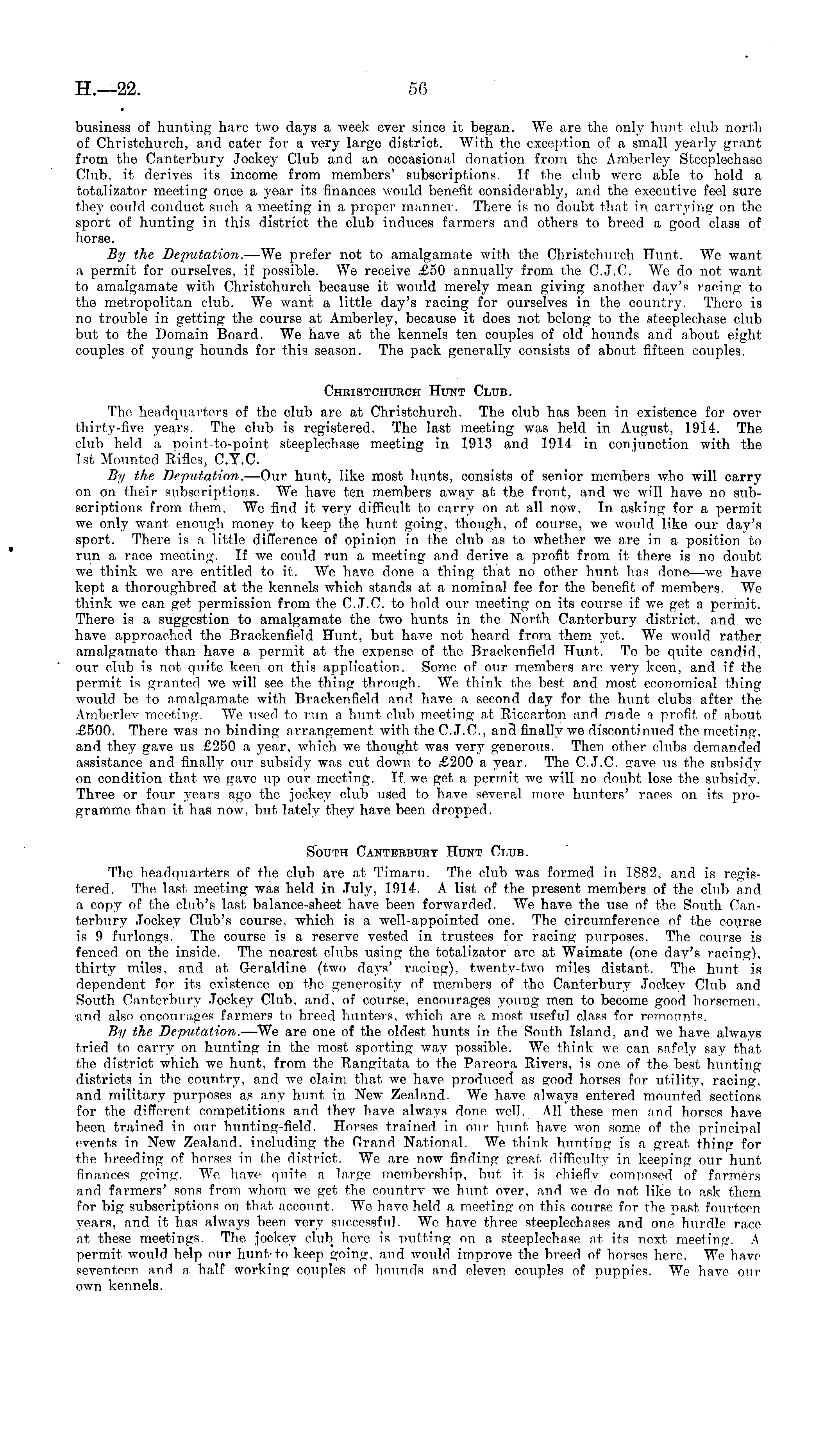 business of hunting hare two days a week ever since it began. We are the only hunt club north of Christchurch, and cater for a very large district. With the exception of a small yearly grant from the Canterbury Jockey Club and an occasional donation from the Amberley Steeplechase Club, it derives its income from members' subscriptions. If the club were able to hold a totalizator meeting once a year its finances would benefit considerably, and the executive feel sure they could conduct such a meeting in a proper manner. There is no doubt that in carrying on the sport of hunting in this district the club induces farmers and others to breed a good class of horse. By the Deputation. —We prefer not to amalgamate with the Christchurch Hunt. We want a permit for ourselves, if possible. We receive £50 annually from the C.J.C. We do not want to amalgamate with Christchurch because it would merely mean giving another day's racing to the metropolitan club. We want a little day's racing for ourselves in the country. There is no trouble in getting the course at Amberley, because it does not belong to the steeplechase club but to the Domain Board. We have at the kennels ten couples of old hounds and about eight couples of young hounds for this season. The pack generally consists of about fifteen couples. Christchurch Hunt Club. The headquarters of the club are at Christchurch. The club has been in. existence for over thirty-five years. The club is registered. The last meeting was held in August, 1914. The club held a point-to-point steeplechase meeting in 1913 and 1914 in conjunction with the Ist Mounted Rifles, C.V.C. By the Deputation. —Our hunt, like most hunts, consists of senior members who will carry on on their subscriptions. We have ten members away at the front, and we will have no subscriptions from them. We find it very difficult to carry on at all now. In asking for a permit we only want enough money to keep the hunt going, though, of course, we would like our day's sport. There is a little difference of opinion in the club as to whether we are in a position to run a race meeting. If we could run a meeting and derive a profit from it there is no doubt we think wo are entitled to it. We have done a thing that no other hunt has done—we have kept a thoroughbred at the kennels which stands at a nominal fee for the benefit of members. We think we can get permission from the C.J.C. to hold our meeting on its course if we get a permit. There is a suggestion to amalgamate the two hunts in the North Canterbury district, and we have approached the Brackenfield Hunt, but have not heard from them yet, We would rather amalgamate than have a permit at the expense of the Brackenfield Hunt, To be quite candid, our club is not quite keen on this application. Some of our members are very keen, and if the permit is granted we will see the thing through. We think the best and most economical thing would be to amalgamate with Brackenfield and have a second day for the hunt clubs after the Amberlev meeting. We used to run a hunt club meeting at Riccarton and made a profit of about £500. There was no binding arrangement with the C.J.C, and finally we discontinued the meeting, and they gave us £250 a year, which we thought was very generous. Then other clubs demanded assistance and finally our subsidy was cut down to £200 a year. The C.J.C. gave us the subsidy on condition that we gave up our meeting. If. we get a permit we will no doubt lose the subsidy. Three or four years ago the jockey club used to have several more hunters' races on its programme than it has now, but lately they have been dropped. South Canterbury Hunt Club. The headquarters of the club are at Timaru. The club was formed in 1882, and is registered. The last meeting was held in July, 1914. A list of the present members of the club and a copy of the club's last balance-sheet have been forwarded. We have the use of the South Canterbury Jockey Club's course, which is a well-appointed one. The circumference of the course is 9 furlongs. The course is a reserve vested in trustees for racing purposes. The course is fenced on the inside. The nearest clubs using the totalizator arc at Waimate (one day's racing), thirty miles, and at Geraldine (two days' racing), twenty-two miles distant. The hunt is dependent for its existence on the generosity of members of the Canterbury Jockey Club and South Canterbury Jockey Club, and, of course, encourages young men to become good horsemen, and also encourages farmers to breed hunters, which are a most useful class for remounts. By ihe Deputation. —We are one of the oldest hunts in the South Island, and we have always tried to carry on hunting in the most sporting way possible. We think we can safely say that the district which we hunt, from the Rangitata to the Pareora Rivers, is one of the best hunting districts in the country, and we claim that we have produced as good horses for utility, racing, and military purposes as any hunt in New Zealand. We have always entered mounted sections for the different competitions and they have always done well. All these men and horses have been trained in our hunting-field. Horses trained in our hunt have won some of the principal events in New Zealand, including the Grand National. We think hunting is a great thing for the breeding of horses in the district, Wo are now finding great difficulty in keeping our hunt finances going. We have quite a large membership, but it is chiefly composed of farmers and farmers' sons from whom we get the country we hunt over, and we do not like to ask them for big subscriptions on that account. We have held a meeting on this course for the nast fourteen years, and it has always been very successful. We have three steeplechases and one hurdle race at these meetings. The jockey club here is putting on a steeplechase at its next meeting. A permit would help our hunt-to keep going, and would improve the breed of horses here. We hav