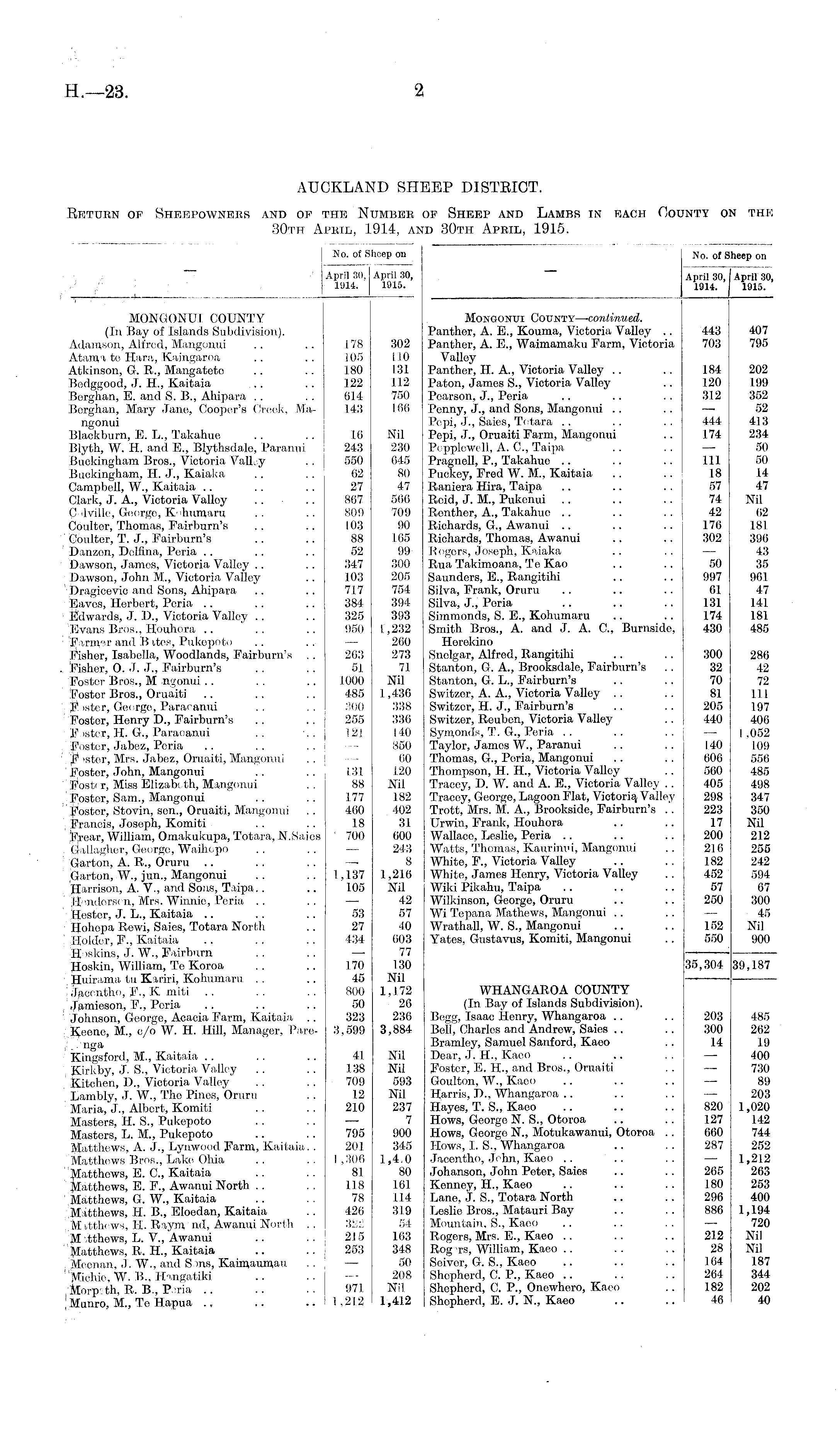 AUCKLAND SHEEP DISTRICT. Return of Sheepowners and of the Number of Sheep and Lambs in each County on the 30th April, 1914, and 30th April, 1915.