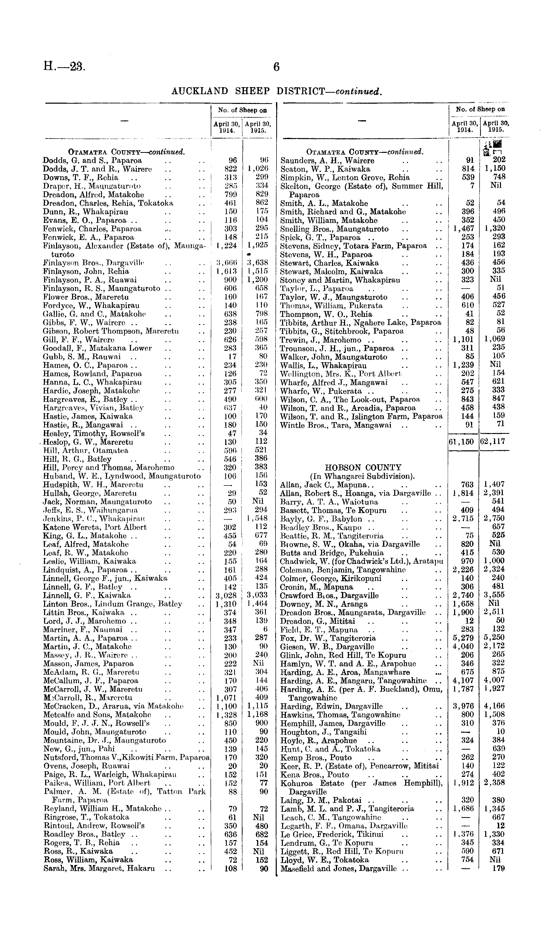 No. of Sheep on April 30, April 30, 1914. 1915. . Otamatea County—continued. a f"i Saunders, A. H., Wairere .. . . 91 202 Seaton, W. P., Kaiwaka .. .. 814 1,150 Simpkin, W., Lenton Grove, Rehia .. 539 748 Skelton, George (Estate of), Summer Hill, 7 Nil Paparoa Smith, A. L., Matakohe .. .. 52 54 Smith, Richard and G., Matakohe .. 396 496 Smith, William, Matakohe .. .. 352 450 Snelling Bros., Maungaturoto .. .. 1,467 1,320 Spick, G. T., Paparoa .. .. .. 253 293 Stevens, Sidney, Totara Farm, Paparoa .. 174 162 Stevens, W. H., Paparoa .. .. 184 193 Stewart, Charles, Kaiwaka .. .. 436 456 Stewart, Malcolm, Kaiwaka . . .. 300 335 Stoney and Martin, Whakapirau .. 323 Nil Taylor, L., Paparoa .. .. .. ■— 51 Taylor, W. J., Maungaturoto .. .. 406 456 Thomas, William, Pukerata .. .. 610 527 Thompson, W. O., Rehia .. .. 41 52 Tibbits, Arthur H., Ngahere Lake, Paparoa 82 81 Tibbits, G., Stitchbrook, Paparoa .. 48 56 Trewin, J., Marohemo .. .. .. 1,101 1,069 Trounson, J. H., jun., Paparoa ., .. 311 235 Walker, John, Maungaturoto .. .. 85 105 Wallis, L., Whakapirau .. •• 1,239 Nil Wellington, Mrs. K., Port Albert .. 202 154 Wharfe, Alfred J., Mangawai .. . . 547 621. Wharfe, W., Pukerata .. .. .. 275 333 Wilson, C. A., The Look-out, Paparoa .. 843 847 Wilson, T. and R., Arcadia, Paparoa .. 458 438 Wilson, T. and R., Islington Farm, Paparoa 144 159 Wintle Bros., Tara, Mangawai .. .. 91 71 61,150 62,117 HOBSON COUNTY (In Whangarei Subdivision). Allan, Jack C., Mapuna.. .. .. 763 1,407 Allan, Robert S., Hoanga, via Dargavjlle .. 1,814 2,391 Barry, A. T. A., Waiotuna .. .. — 541 Bassctt, Thomas, Te Kopuru .. . . 409 494 Bayly, G. P., Babylon .. .. .. 2,715 2,750 Beadley Bros., Kaupo .. .. .. — 657 Beattie, R. M., Tangiteroria .. .. 75 525 Browne, S. W„ Okaha, via Dargaville .. 820 Nil Butts and Bridge, Pukehuia .. .. 415 530 Chadwick, W. (for Chadwick's Ltd.), Aratapu 970 1,000 Coleman, Benjamin, Tangowahine .. 2,226 2,324 Colmer, Georgo, Kirikopuni .. .. 140 240 Cronin, M., Mapuna .. .. .. 306 481 Crawford Bios., Dargaville .. .. 2,740 3,555 Downoy, M. N., Aranga .. .. 1,658 Nil Creadon Bros., Maungarata, Dargaville .. 1,900 2,511 Dreadon, G., Mititai .. .. .. 12 50 Field, E. T., Mapuna . . .. .. 283 132 Fox, Dr. W., Tangiteroria .. .. 5,279 5,250 Giesen, W. B., Dargaville .. .. 4,040 2,172 Glink, John, Red Hill, Te Kopuru . . 206 265 Hamlyn, W. T. and A. E., Arapohue .. 346 322 Harding, A. E., Aroa, Mangawhare ... 675 875 Harding, A. E., Mangaru, Tangowahine .. 4,107 4,007 Harding, A. E. (per A. F. Buckland), Omu, 1,787 I ,927 Tangowahine Harding, Edwin, Dargaville .. .. 3,976 4,166 Hawkins, Thomas, Tangowahine .. 800 1,508 Hemphill, James, Dargavillo .. .. 310 376 Houghton, J., Tangaihi .. .. —• 10 Hoylc, R., Arapohue .. .. .. 324 384 Hunt, C. and A., Tokatoka .. .. — 630 Kemp Bros., Pouto .. .. .. 262 270 Keer, R. P. (Estate of), Pencarrow, Mititai 140 122 Kena Bros., Pouto .. .. .. 274 402 Kohuroa Estate (per James Hemphill), 1,912 2,358 Dargaville Laing, D. M., Pakotai .. .. .. 320 380 Lamb, M. L. and P. J., Tangiteroria .. 1,686 1,345 Leach, C. M., Tangowahine .. .. — 667 Lcgarth, F. F., Omana, Dargaville .. — 12 Le Grice, Frederick, Tildnui .. .. 1,376 1,330 Lendrum, G., Te Kopuru .. .. 345 334 Liggett, R., Red Hill, Te Kopuru .. 590 671 Lloyd, W. E., Tokatoka .. .. 754 Nil Masefield and Jones, Dargaville .. .. — 179