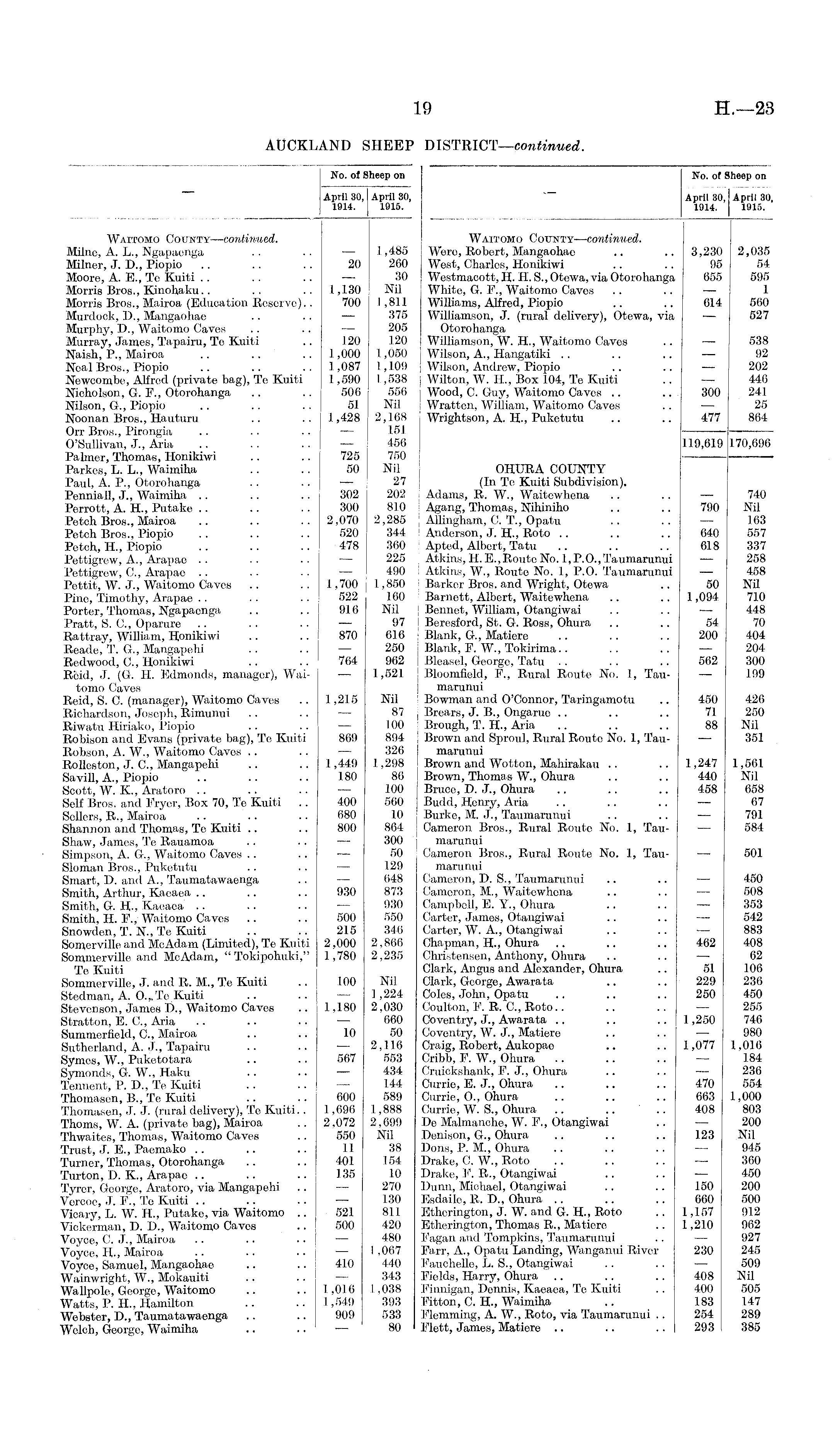 No. of Sheep on April 30, April 30, 1914. 1915. Waitomo County—continued. Milne, A. L., Ngapaenga .. . . — 1,485 Milner, J. D„ Piopio .. .. . . 20 260 Moore, A. E., Te Kuiti .. .. .. — 30 Morris Bros., Kinohaku.. . . . . 1,130 Nil Morris Bros., Mairoa (Education Reserve).. 700 1,811 Murdock, D., Mangaohae .. •. — 375 Murphy, D., Waitomo Caves .. .. — 205 Murray, James, Tapairu, Te Kuiti .. 120 120 Naish, P., Mairoa .. .. .. 1,000 1,050 Neal Bros., Piopio .. .. .. 1,087 1,109 Newcombe, Alfred (private bag), Te Kuiti 1,590 1,538 Nicholson, 6. P., Otorohanga .. .. 506 556 Nilson, G., Piopio .. .. .. 51 Nil Noonan Bros., Hauturu .. .. 1,428 2,168 Orr Bros., Pirongia .. .. .. — 151 O'Sullivan, J., Aria .. .. .. — 456 Palmer, Thomas, Honikiwi .. .. 725 750 Parkes, L. L., Waimiha .. . . 50 Nil Paul, A. P., Otorohanga .. .. — 27 Penniall, J., Waimiha .. .. .. 302 202 Perrott, A. H„ Putake 300 810 Petoh Bros., Mairoa .. .. .. 2,070 2,285 Peteh Bros., Piopio .. .. .. 520 344 Petch, H., Piopio .. .. .. 478 360 Pettigrew, A., Arapae .. . . • . — 225 Pettigrew, C., Arapae .. .. . . ■— 490 Pettit, W. J., Waitomo Caves .. .. 1,700 j 1,850 Pine, Timothy, Arapae .. . . .. 522 160 Porter, Thomas, Ngapaenga .. .. 916 Nil Pratt, 8. C., Oparure .. . . .. — 97 Rattray, William, Honikiwi .. .. 870 616 Reade, T. G., Mangapehi .. .. — 250 Redwood, C., Honikiwi .. .. 764 962 Reid, J. (G. H. Edmonds, manager), Wai- — 1,521 tomo Caves Reid, 8. C. (manager), Waitomo Caves .. 1,215 Nil Richardson, Joseph, Rimunui .. .. — 87 Riwatu Hiriako, Piopio .. .. — 100 Robison and Evans (private bag), Te Kuiti 869 894 Robson, A. W., Waitomo Caves .. .. — 326 Rolleston, J. C., Mangapehi .. .. 1,449 1,298 Savill, A., Piopio .. .. .. 180 86 Scott, W. K, Aratoro .. .. .. — 100 Self Bros, and Pryer, Box 70, Te Kuiti .. 400 560 Sellers, R., Mairoa .. ■. • • 680 10 Shannon and Thomas, Te Kuiti .. .. 800 864 Shaw, James, Te Rauamoa .. .. — 300 Simpson, A. G., Waitomo Caves .. .. — 50 Sloman Bros., Puketutu . • •. — 129 Smart, D. and A., Taumatawaenga .. — 648 Smith, Arthur, Kaeaea .. .. .. 930 873 Smith, G. H-, Kaeaea .. .. .. ■— 930 Smith, H. P., Waitomo Caves .. .. 500 550 Snowden, T. N., Te Kuiti .. .. 215 346 Somerville and McAdam (Limited), Te Kuiti 2,000 2,866 Sommerville and McAdam, "Tokipohuki," 1,780 2,235 Te Kuiti Sommerville, J. and R. M., Te Kuiti .. 100 Nil Stedman, A. 0.„Te Kuiti .. .. — 1,224 Stevenson, James £>., Waitomo Caves .. 1,180 2,030 Stratton, E. C., Aria .. .. .. — 660 Summerfield, C., Mairoa .. .. 10 50 Sutherland, A. J., Tapairu .. .. — 2,116 Symes, W., Puketotara .. .. 567 553 Symonds, G. W., Haku • • • • — 434 Tennent, P. !>., Te Kuiti .. .. — 144 Thomasen, B., Te Kuiti .. .. 600 589 Thomasen, J. J. (ruraldelivery), Te Kuiti.. 1,696 1,888 Thorns, W. A. (private bag), Mairoa .. 2,072 2,699 Thwaites, Thomas, Waitomo Caves .. 550 Nil Trust, J. E., Paemako .. .. .. 11 38 Turner, Thomas, Otorohanga .. .. 401 154 Turton, D. K, Arapae .. .. .. 135 10 Tyrer, George, Aratoro, via Mangapehi .. — 270 Vercoe, J. P., Te Kuiti .. .. .. — 130 Vioary, L. W. H., Putake, via Waitomo .. 521 811 Viekerman, D. D., Waitomo Caves .. 500 420 Voyce, C. J., Mairoa .. .. .. — 480 Voyce, H., Mairoa .. . ■ .. — 1,067 Voyce, Samuel, Mangaohae .. .. 410 440 Wainwright, W., Mokauiti .. .. — 343 Wallpole, George, Waitomo .. .. 1,016 1,038 Watts, P. H., Hamilton .. .. 1,549 393 Webster, D., Taumatawaenga .. .. 909 533 Welch, George, Waimiha .. .. — 80