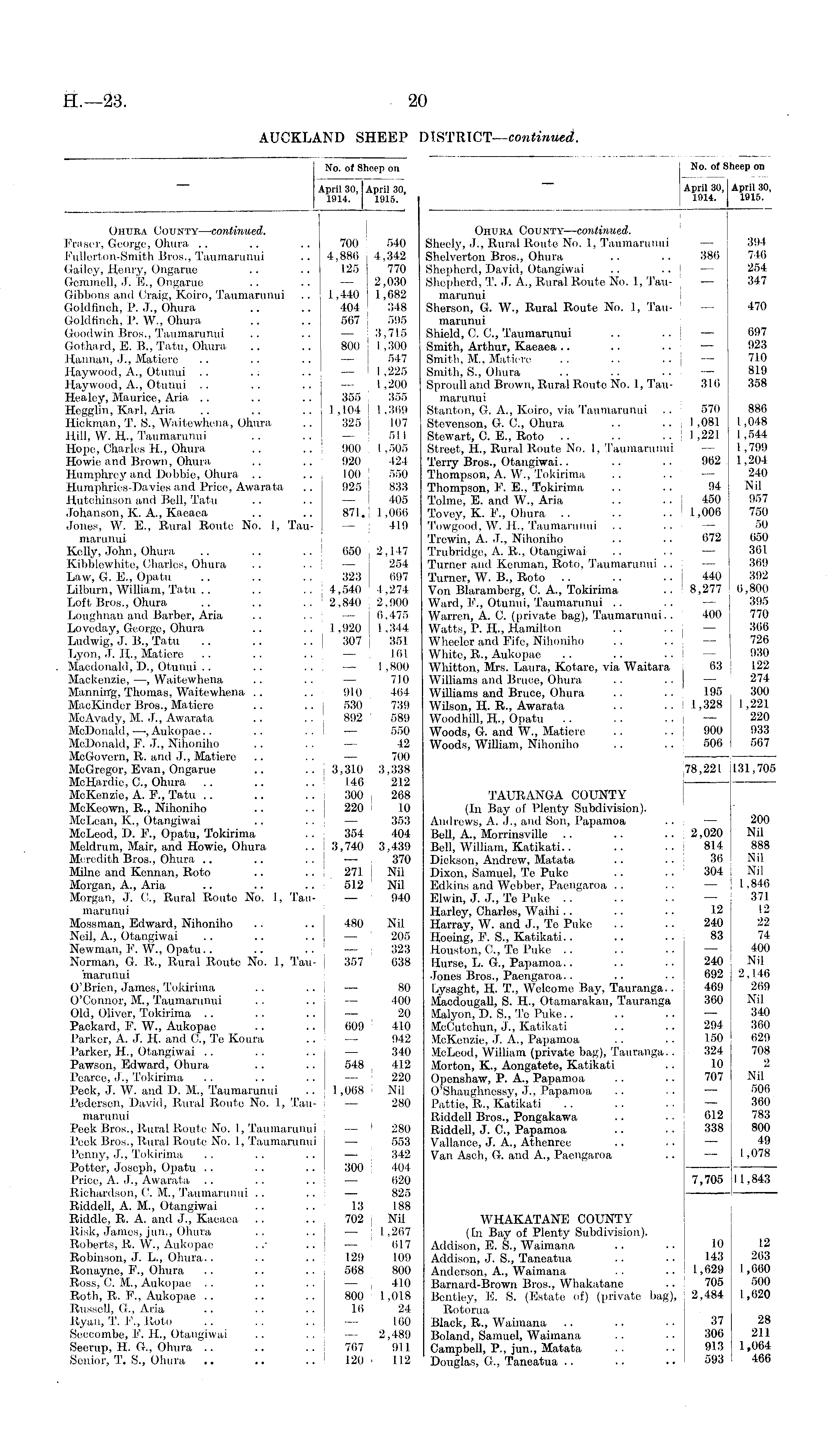 No. of Sheep on April 30, April 30, 1914. 1915. Ohtjea County—continued. Fraser, George, Ohura .. .. .. 700 ! 540 Fullerton-Smith Bros., Taumarunui .. 4,886 4,342 Gailey, Henry, Ongarue .. .. 125 770 Gemmell, J. E., Ongarue .. .. —■ 2,030 Gibbons and Craig, Koiro, Taumarunui .. 1,440 1,682 Goldfinch, P. J., Ohura .. .. 404 ! 348 Goldfinch, P. W., Ohura .. .. 567 I 595 Goodwin Bros., Taumarunui .. .. ■—• 3,715 Gothard, E. B., Tatu, Ohura. .. .. 800 j 1,300 Hannan, J., Matiere .. .. .. — i 547 Haywood, A., Otunui .. .. .. — 5 1,225 Haywood, A., Otunui .. .. .. — j 1,200 Healey, Maurice, Aria .. .. .. 355 ! 355 Hegglin, Karl, Aria .. .. .. 1,104 I 1,369 Hickman, T. 8., Waitewhena, Ohura .. 325 ] 107 Hill, W. H, Taumarunui .. .. — 511 Hope, Charles H., Ohura .. .. 900 j 1,505 Howie and Brown, Ohura .. .. 920 424 Humphrey and Dobbie, Ohura .. ... 100 550 Humphrics-Davies and Price, Awarata .. 925 833 Hutchinson and Bell, Tatu .. .. — 405 Johanson, K. A-, Kaeaea .. .. 871. 1,066 Jones, W. E., Rural Route No. 1, Tau- — 419 marunui Kelly, John, Ohura .. .. .. 650 2,147 Kibblewhite, Charles, Ohura .. .. — 254 Law, G. E., Opatu .. .. .. j 323 697 Lilburn, William, Tatu .. .. .. 4,540 4,274 Loft Bros., Ohura .. .. .. 2,840 2,900 Loughnan and Barber, Aria .. .. — 6,475 Loveday, George, Ohura .. .. j 1,920 1,344 Ludwig, J. B., Tatu .. .. .. 307 j 351 Lyon, J. H., Matiere .. .. .. — | 161 Macdonald,!)., Otunui .. .. . • — I ,800 Mackenzie, —, Waitewhena .. .. — 710 Manning, Thomas, Waitewhena .. .. 910 464 MacKinder Bros., Matiere .. .. 530 739 McAvady, M. J., Awarata .. .. j 892 ! 589 McDonald, —, Aukopae.. .. .. — ' 550 McDonald, F. J., Nihoniho .. .. j — 42 McGovern, R. and J., Matiere .. .. — 700 McGregor, Evan, Ongarue .. .. 3,310 3,338 McHardie, C., Ohura .. .. .. ! 146 212 McKenzie, A. P., Tatu .. .. .. i 300 j 268 McKeown, R., Nihoniho .. .. 220 1 10 McLean, K., Otangiwai .. . , — 353 McLeod, D. P., Opatu, Tokirima .. 354 404 Meldrum, Mair, and Howie, Ohura .. 3,740 3,439 Meredith Bros., Ohura .. .. . . — 370 Milne and Kennan, Roto .. .. 271 Nil Morgan, A., Aria .. .. .. 512 Nil Morgan, J. C., Rural Routo No. 1, Tau- — 940 marunui Mossman, Edward, Nihoniho .. .. 480 Nil Neil, A., Otangiwai .. .. .. — | 205 Newman, P. W., Opatu.. .. .. — ; 323 Norman, G. R., Rural Route No. 1, Tau- 357 638 marunui O'Brien, James, Tokirima .. .. — 80 O'Connor, M., Taumarunui .. .. — 400 Old, Oliver, Tokirima .. .. .. — 20 Packard, F. W., Aukopae .. .. 609 410 Parker, A. J. H. and C., Te Koura .. — 942 Parker, H, Otangiwai .. .. .. — 340 Pawson, Edward, Ohura .. .. 548 412 Pearce, J., Tokirima . . .. .. — 220 Peck, J. W. and D. M., Taumarunui .. 1,068 Nil Pedersen, David, Rural Route No. 1, Tau- — 280 marunui Peek Bros., Rural Route No. 1, Taumarunui — ' 280 Peek Bros., Rural Route No. 1, Taumarunui — 553 Penny, J., Tokirima .. .. .. — \ 342 Potter, Joseph, Opatu .. .. .. 300 j 404 Price, A. J., Awarata .. .. .. — 620 Richardson, C. M., Taumarunui .. .. — 825 Riddell, A. M., Otangiwai .. .. 13 188 Riddle, R. A. and J., Kaeaea .. .. 702 Nil Risk, James, jun., Ohura .. .. — j 1,267 Roberts, R. W., Aukopae . .. — 617 Robinson, J. L., Ohura.. .. .. 129 109 Ronayne, F., Ohura .. .. .. 568 800 Ross, C. M., Aukopae .. .. .. — , 410 Roth, R. F., Aukopae .. .. .. 800 1,018 Russell, G., Aria .. .. .. 16 24 Ryan, T. F., Roto .. . . .. — 160 Seccombe, F. H., Otangiwai .. .. — 2,489 Seerup, H. G., Ohura .. .. .. 767 911 Senior, T. S., Ohura .. .. .. 120 i 112