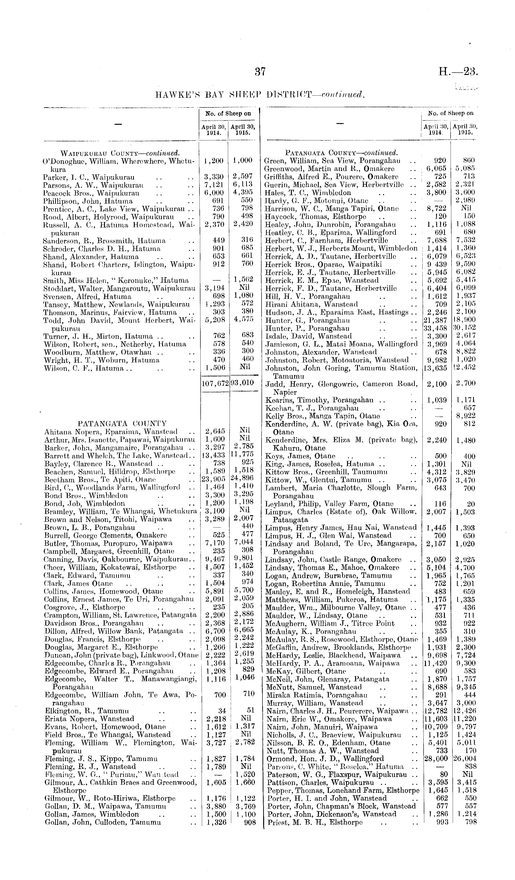 Ho. of Sheep on ! April 30, | April 30, | 1914 [ 1915. Patangata County—-continued. Green, William, Sea View, Porangahau . . 920 860 Greenwood, Martin and K., Omakere .. : 6,065 5,085 Griffiths, Alfred E., Pourere, Omakere .. 725 713 Guerin, Michael, Sea View, Herbertville .. 2,582 2,321 Hales, T. C„ Wimbledon .. .. 3,800 3,600 Hardy, G. F., Motonui, Otane .. . . — 2,989 Harrison, W. C., Manga Tapiri, Otane .. 8,722 Ml Haycock, Thomas, Elsthorpe .. .. 120 150 Healey, John, Dunrobin, Porangahau .. 1,116 1,088 Heatley, C. B., Eparima, Wallingford .. 691 680 Herbert, C., Farnham, Herbertville .. 7,688 7,532 Herbert, W. J., Herberts Mount, Wimbledon 1,414 1,360 Herrick, A. D., Tautane, Herbertville .. j 6,079 6,523 Herrick Bros., Oparae, Waipatiki .. i 9 439 9,590 Herrick, E. J., Tautane, Herbertville .. ! 5,945 6,082 Herrick, E. M., Epae, Wanstead .. I 5,692 5,415 Herrick, F. D., Tautane, Herbertville .. 6,404 6,099 Hill, H. V., Porangahau .. .. 1,612 1,937 Hirani Ahitana, Wanstead .. .. 709 2,105 Hudson, J. A., Eparaima East, Hastings .. 2,246 2,100 Hunter, G., Porangahau .. .. 21,387 18,900 Hunter, P., Porangahau .. .. 33,458 30,152 Isdale, David, Wanstead .. .. 3,300 2,617 Jamieson, G. L., Matai Moana, Wallingford 3,969 4,064 Johnston, Alexander, Wanstead .. 678 8,822 Johnston, Robert, Motoatoria, Wanstead 9,982 1,020 Johnston, John Goring, Tamilian Station, 13,635 12,452 Tamumu Jndd, Henry, Glengowrie, Cameron Road, 2,100 2,700 Napier Kearins, Timothy, Porangahau .. .. 1,039 1,171 Keehan, T. J., Porangahau .. . . —■ 657 Kelly Bros., Manga Tapin, Otane .. — 8,922 Kenderdine, A. W. (private bag), Kia Ora, 920 812 Ofcane Kenderdine, Mrs. Eliza M. (private bag), 2,240 1,480 Kahuru, Otane Keys, James, Otane .. . . .. 500 400 King, James, Roselea, Hatuma .. .. 1,301 Nil Kittow Bros., Greenhill, Taumumu .. 4,312 3,829 Kittow, W., Glentui, Tamumu .. .. 3,075 3,470 Lambert, Maria Charlotte, Slough Farm, 643 700 Porangahau Leyland, Philip, Valley Farm, Otane .. 116 20 Limpus, Charles (Estate of), Oak Willow, 2,007 1,503 Patangata Limpus, Henry James, Hau Nai, Wanstead 1,445 1,393 Limpus, H. J., Glen Wai, Wanstead .. 700 650 Lindsay and Boland, Te Ure, Mangarapa, 2,157 1,020 Porangahau Lindsay, John, Castle Range, Omakore .. 3,050 2,925 Lindsay, Thomas E., Mahoe, Omakere .. 5,104 4,700 Logan, Andrew, Burnbrae, Tamumu .. 1,965 1,765 Logan, Robertina Annie, Tamumu .. 752 1.201 Manley, E. and R., Homeleigh, Hanstead 483 659 Matthews, William, Pukeroa, Hatuma .. 1,175 1,335 Maulder, Win., Milbourne Valley, Otane .. 477 436 Maulder, W., Lindsay, Ofcane .. .. 531 711 McAughern, William J., Titree Point .. 932 922 McAulay, K., Porangahau .. .. 355 310 McAulay, R. S., Rosewood, Elsthorpe, Otane 1,469 1,389 McGaffin, Andrew, Brooklands, Elsthorpe 1,931 2,300 McHardy, Leslie, Blackhead, Waipawa .. 9,698 7,724 McHardy, P. A., Aramoana, Waipawa .. 11,420 9,300 ' McKay, Gilbert, Otane .. .. 690 583 McNeil, John, Glenaray, Patangata .. 1,870 1,757 MoNutt, Samuel, Wanstead .. .. 8,688 9,345 Miraka Ratimia, Porangahau .. .. 291 444 Murray, William, Wanstead .. .. 3,647 3,000 Nairn, Charles J. H., Peurerere, Waipawa .. 12,782 12,426 Nairn, Eric W., Omakere, Waipawa .. 11,603 11,220 Nairn, John, Manuiri, Waipawa .. 10,709 9,797 Nioholls, J. C., Braeview, Waipukurau .. 1,125 1,424 Nilsson, B. E. O., Edenham, Otane .. 5,401 5,01.1 Nutt, Thomas A. W„ Wanstead . . 733 170 Ormond, Hon. J. D., Wallingford .. 28,000 26,004 Parsons, C. White, " Roselea," Hatuma .. — 838 Paterson, W. G., Flaxspur, Waipukurau .. 80 Nil Pattison, Charles, Waipukurau .. .. 3,595 3,415 Pepper, Thomas, Lonehand Earm, Elsthorpe 1,645 1,518 Porter, H. I. and John, Wanstead .. 662 550 Porter, John, Chapman's Block, Wanstead 577 557 Porter, John, Dickenson's, Wanstead .. 1,286 1.214 Priest, M. B. H., Elsthorpe .. .. 993 798