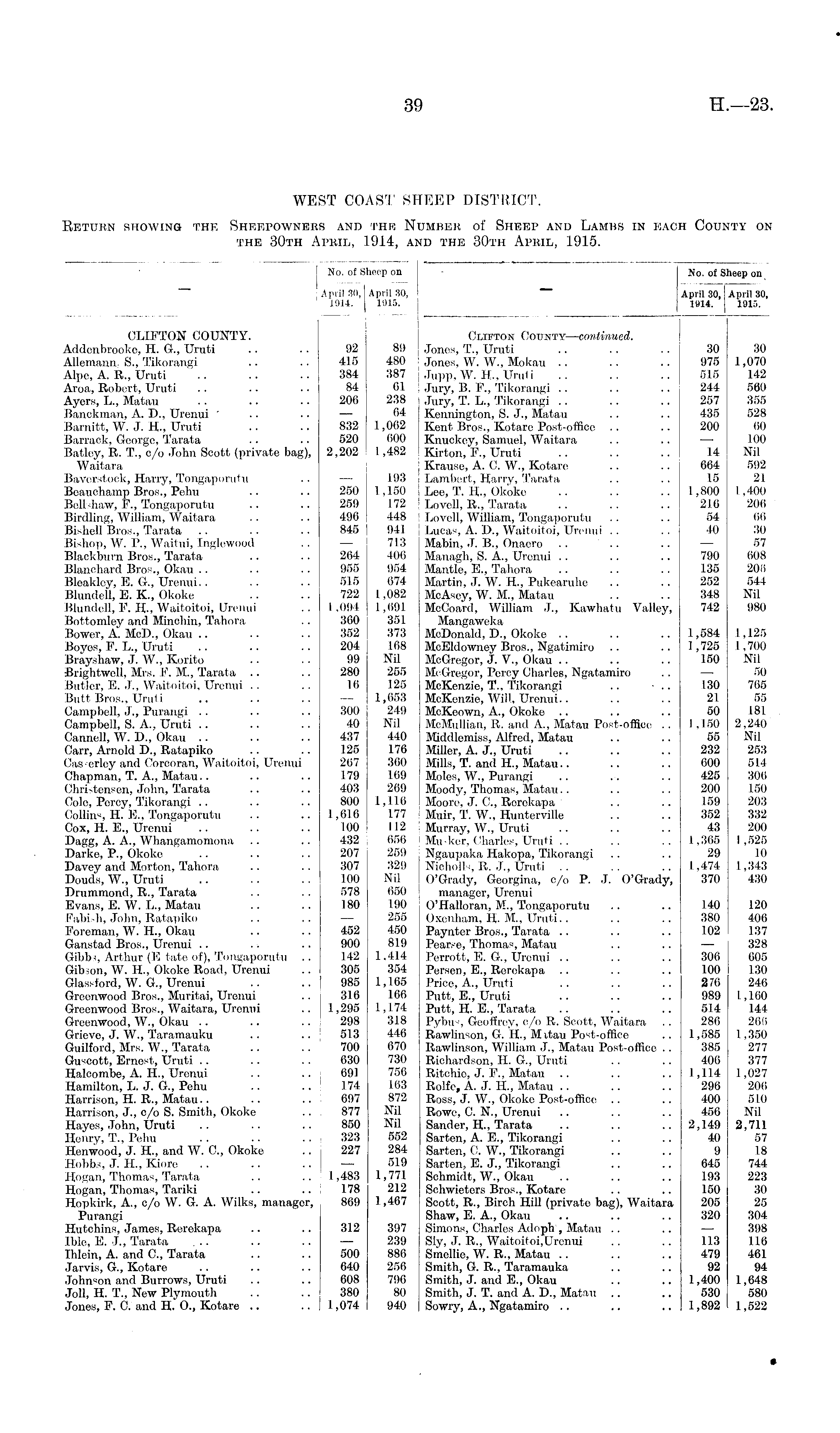WEST COAST SHEEP DISTRICT. Return showing the Sheepowners and the Number of Sheep and Lambs in each County on the 30th April, 1914, and the 30th April, 1915.