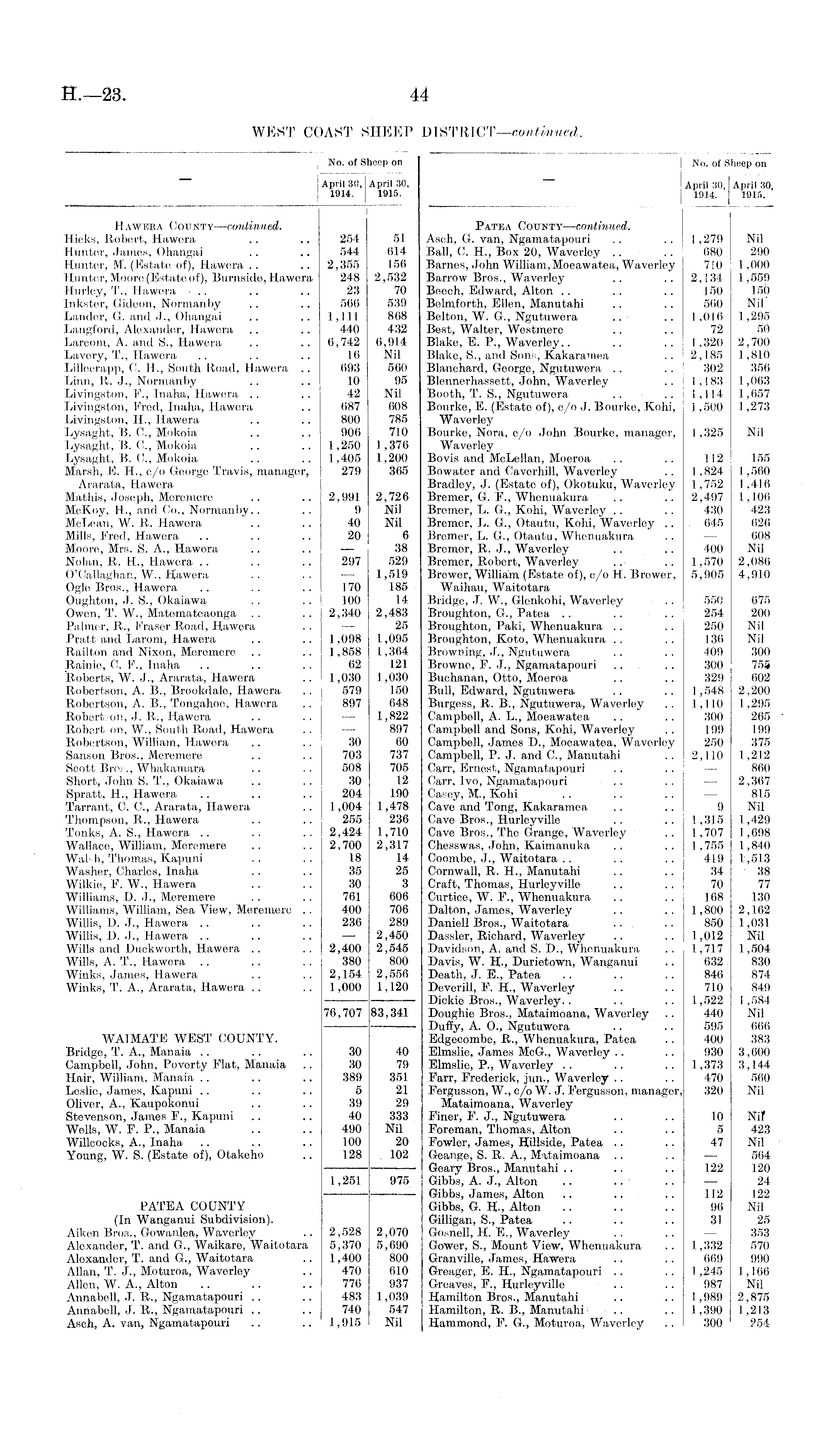 No. of Sheep on April 30,1 April 30, 1914. | 1915. Haweka County-—-continued. Hicks, Robert, Hawera .. .. 254 51 Hunter, James, Ohangai .. .. 544 614 Hunter, M. (Estate of), Hawera . . .. 2,355 156 Hunter, Moore (Estate of), Burnside, Hawera 248 2,532 Hurley, T., Hawera .. .. .. 23 70 Inkster, Gideon, Norman by .. .. 566 53!) Lander, G. and J., Ohangai .. .. 1,111 868 Langford, Alexander, Hawera .. .. 440 432 Larcom, A. and 8., Hawera .. .. 6,742 6,914 Lavery, T., Hawera .. .. .. 16 Nil Lillecrapp, 0. H., South Road, Hawera .. 693 560 Linn, R. J ., Normanby .. .. 10 95 Livingston, F., Inaha, Hawera .. .. 42 Nil Livingston, Fred, Inaha, Hawera .. 687 608 Livingston, H., Hawera .. .. 800 785 Lysaght, B. C., Mokoia .. .. 906 710 Lysaght, B. C., Mokoia .. .. 1,250 1 .376 Lysaght, B. C„ Mokoia .. .. 1,405 1,200 Marsh, E. H., c/o George Travis, manager, 279 365 Ararata, Hawera Mathis, Joseph, Meremere .. .. 2,991 2,726 MeKoy, H., and Co., Normanby.. .. 9 Nil McLean, W. R. Hawera .. .. 40 Nil Mills, Fred, Hawera .. . . .. 20 6 Moore, Mrs. S. A., Hawora .. .. — 38 Nolan, R. H., Hawera .. .. .. 297 529 O'Callaghan, W., Hawera .. .. -— 1,519 Ogle Bros., Hawera .. .. .. 170 185 Oughton, J. 8., Okaiawa . . . . 1 100 14 Owen, T. W., Matemateaonga .. . . 2,340 2,483 Palmer, R., Eraser Road, Hawera . . — 25 Pratt and Larom, Hawera .. 1,098 1,095 Railton and Nixon, Meremere .. 1,858 1,364 Rainie, C. F., Inaha .. .. .. 62 121 Roberts, W. J., Ararata, Hawera .. I 1,030 1,030 Robertson, A. B., Brookdale, Hawera . . | 579 150 Robertson, A. B., Tongahoe, Hawera .. 897 648 Robert: on, .I. R., Hawera .. .. —■ 1,822 Robert on, W., South Road, Hawera . . — 897 Robertson, William, Hawera .. . . 30 60 Sanson Bros., Meremere .. . . 703 737 Scott Bros., Whakamara . . . . 508 705 Short, John S. T., Okaiawa .. . . 30 12 Spratt, H-, Hawera .. .. .. 204 190 Tarrant, C. C., Ararata, Hawera .. 1,004 1,478 Thompson, R., Hawera .. .. 255 236 Tonks, A. S., Hawera .. .. .. 2,424 1,710 Wallace, William, Meremere .. .. 2,700 2,317 Walsh, Thomas, Kapuni . . . . 18 14 Washer, Charles, Inaha . . .. 35 25 Wilkie, F. W., Hawera .. . . 30 3 Williams, D. J., Meremere . . . . 761 606 Williams, William, Sea View, Meremere . . 400 706 Willis, I). J., Hawera .. .. .. 236 289 Willis, D. J., Hawera .. .. .. — 2,450 Wills and Duckworth, Hawera .. . . 2,400 2,545 Wills, A. T., Hawera .. . . . . 380 800 Winks, James, Hawera .. .. 2,154 2,556 Winks, T. A., Ararata, Hawera .. 1,000 1,120 76,707 83,341 WAIMATE WEST COUNTY. Bridge, T. A., Manaia .. . . .. 30 40 Campbell, John, Poverty Flat, Manaia .. 30 79 Hair, William, Manaia .. .. .. 389 351 Leslie, James, Kapuni .. .. .. 5 21 Oliver, A., Kaupoltonui .. .. 39 29 Stevenson, James F., Kapuni .. .. 40 333 Wells, W. F. P., Manaia .. .. 490 Nil Willcocks, A., Inaha .. .. .. 100 20 Young, W. S. (Estate of), Otakeho .. 128 102 1,251 975 PATE A COUNTY (In Wanganui Subdivision). Aiken Bros., Gowanlea, Waverley .. 2,528 2,070 Alexander, T. and G., Waikare, Waitotara 5,370 5,690 Alexander, T. and G., Waitotara .. 1,400 800 Allan, T. J., Moturoa, Waverley .. 470 610 Allen, W. A., Alton .. .. .. 776 937 Annabell, J. R., Ngamatapouri .. .. 483 1,039 Annabell, J. R., Ngamatapouri .. .. 740 547 Asch, A. van, Ngamatapouri .. .. 1,915 Nil