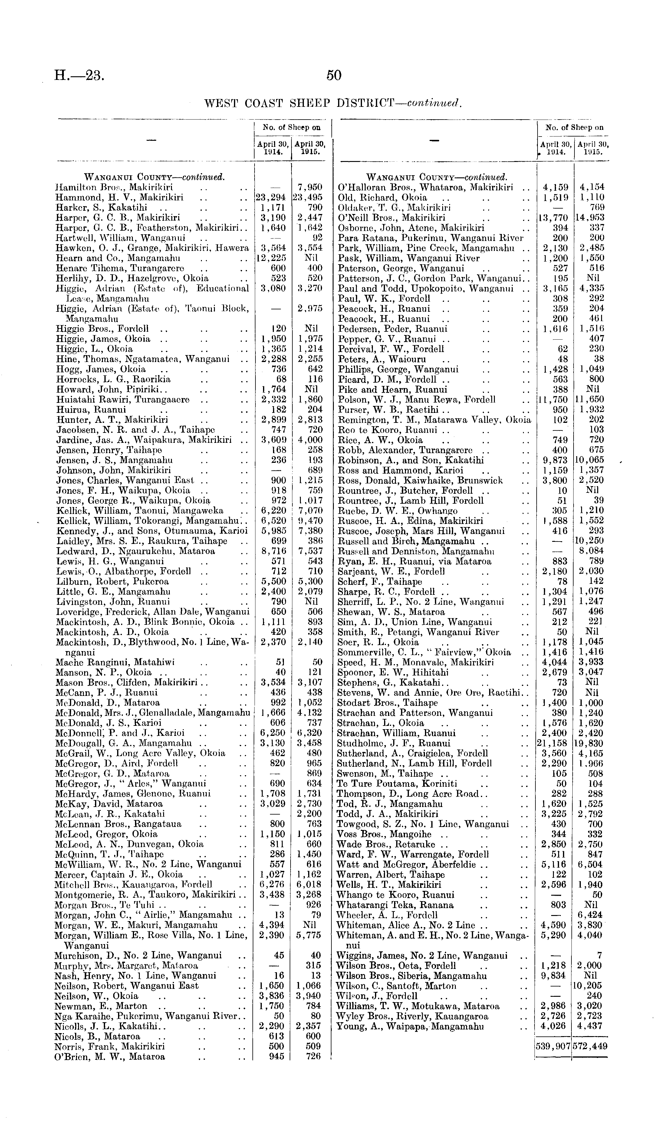 No. of Sheep on April 30, April 30, . 1914. 1915. Wanganui County—continued. O'Halloran Bros., Whataroa, Makirikiri .. 4,159 4,154 Old, Richard, Okoia .. .. .. 1,519 1,110 Oldaker, T. G-., Makirikiri .. .. — 769 O'Neill Bros., Makirikiri .. .. 13,770 14,953 Osborne, John, Atone, Makirikiri .. 394 337 Para Ratana, Pukerimu, Wanganui River 200 200 Park, William, Pine Creek, Mangamahu .. 2,130 2,485 Pask, William, Wanganui River .. 1,200 1,550 Paterson, George, Wanganui .. .. 527 516 Patterson, J. C., Gordon Park, Wanganui.. 195 Nil Paul and Todd, Upokopoito, Wanganui .. 3,165 4,335 Paul, W. K., Fordell .. .. .. 308 292 Peacock, H., Ruanui .. .. .. 359 204 Peacock, H., Ruanui .. .. .. 200 461 Pedersen, Peder, Ruanui .. .. 1,616 1,516 Pepper, G. V., Ruanui .. . . .. — 407 Percival, F. W., Fordell . . .. 62 230 Peters, A., Waiouru .. .. .. 48 38 Phillips, George, Wanganui .. 1,428 1,049 Picard, D. M., Fordell .. .. . . 563 800 Pike and Hearn, Ruanui .. .. 388 Nil Poison, W. J., Manu Reiva, Fordell .. 11,750 11,650 Purser, W. B., Raetihi .. .. .. 950 1,932 Remington, T. M., Matarawa Valley, Okoia 102 202 Rco te Kooro, Ruanui .. .. .. — 103 Rice, A. W., Okoia .. .. .. 749 720 Robb, Alexander, Turangarcre .. .. 400 675 Robinson, A., and Son, Kakatihi .. 9,873 10,065 Ross and Hammond, Karioi .. .. 1,159 1,357 Ross, Donald, Kaiwhaike, Brunswick .. 3,800 2,520 Rountree, J., Butcher, Fordell .. .. 10 Nil Rountree, J., Lamb Hill, Fordell .. 51 39 Ruebe, D. AY. E„ Owhango .. . . 305 1,210 Ruscoe, H. A., Edina, Makirikiri .. 1,588 1,552 Ruscoe, Joseph, Mars Hill, Wanganui .. 416 293 Russell and Birch, Mangamahu .. .. — 10,250 Russell and Denniston, Mangamahu .. ■— 8,084 Ryan, E. H., Ruanui, via Mataroa . . 883 789 Sarjeant, W. E., Fordell .. .. 2,180 2,030 Scherf, F., Taihape . . .. 78 142 Sharpe, R. C., Fordell .. .. .. 1,304 1,076 Sherrifl, L. P., No. 2 Line, Wanganui .. 1 ,291 1,247 Shewan, W. S., Mataroa .. .. 567 496 Sim, A. D., Union Line, Wanganui .. 212 221 Smith, E., Petangi, Wanganui River .. 50 Nil Soer, R. L., Okoia .. .. .. 1,178 1,045 Sommerville, C. L., " Fairview," Okoia .. 1,416 1,416 Speed, H. M., Monavale, Makirikiri .. 4,044 3,933 Spoonor, E. W., Hihitahi .. .. 2,679 3,047 Stephens, G., Kakatahi.. .. 73 Nil Stevens, W. and Annie, Ore Ore, Raetihi. . 720 Nil Stodart Bros., Taihape .. .. 1,400 1,000 Strachan and Patterson, Wanganui .. 380 1,240 Strachan, L., Okoia .. .. .. 1,576 1,620 Strachan, William, Ruanui .. .. 2,400 2,420 Studholmc, J. F., Ruanui .. .. 21,158 1.9,830 Sutherland, A., Craigielea, Fordel) .. 3,560 4,165 Sutherland, N., Lamb Hill, Fordell .. 2,290 1,966 Swenson, M., Taihape .. .. .. 105 508 To Ture Poutama, Koriniti .. .. 50 104 Thompson, D., Long Acre Road.. .. 282 288 Tod, R. J., Mangamahu .. .. 1,620 1,525 Todd, J. A., Makirikiri .. .. 3,225 2,792 Towgood, S. Z., No. 1 Line, Wanganui .. 430 700 Voss Bros., Mangoihe .. . . .. 344 332 Wade Bros., Retaruke .. .. .. 2,850 2,750 Ward, F. W., Warrengate, Fordell .. 511 847 Watt and McGregor, Aberfeldie .. .. 5,116 6,504 Warren, Albert, Taihape .. .. 122 102 Wells, H. T., Makirikiri .. .. 2,596 1,940 Whango te Kooro, Ruanui .. .. — 50 Whatarangi Teka, Ranana .. .. 803 Nil Wheeler, A. L., Fordell .. .. — 6,424 Whiteman, Alice A., No. 2 Line .. .. 4,590 3,830 Whiteman, A. and E. H., No. 2 Line, Wanga- 5,290 4,040 nui Wiggins, James, No. 2 Line, Wanganui .. ■—• 7 Wilson Bros., Oeta, Fordell .. .. 1,218 2,000 Wilson Bros., Siberia, Mangamahu .. 9,834 Nil Wilson, C., Santoft, Marton .. .. — 10,205 Wilson, J., Fordell .. .. .. — 240 Williams, T. W., Motukawa, Mataroa .. 2,986 3,020 Wyley Bros., Riverly, Kauangaroa .. 2,726 2,723 Young, A., Waipapa, Mangamahu .. 4,026 4,437 539,907 572,449