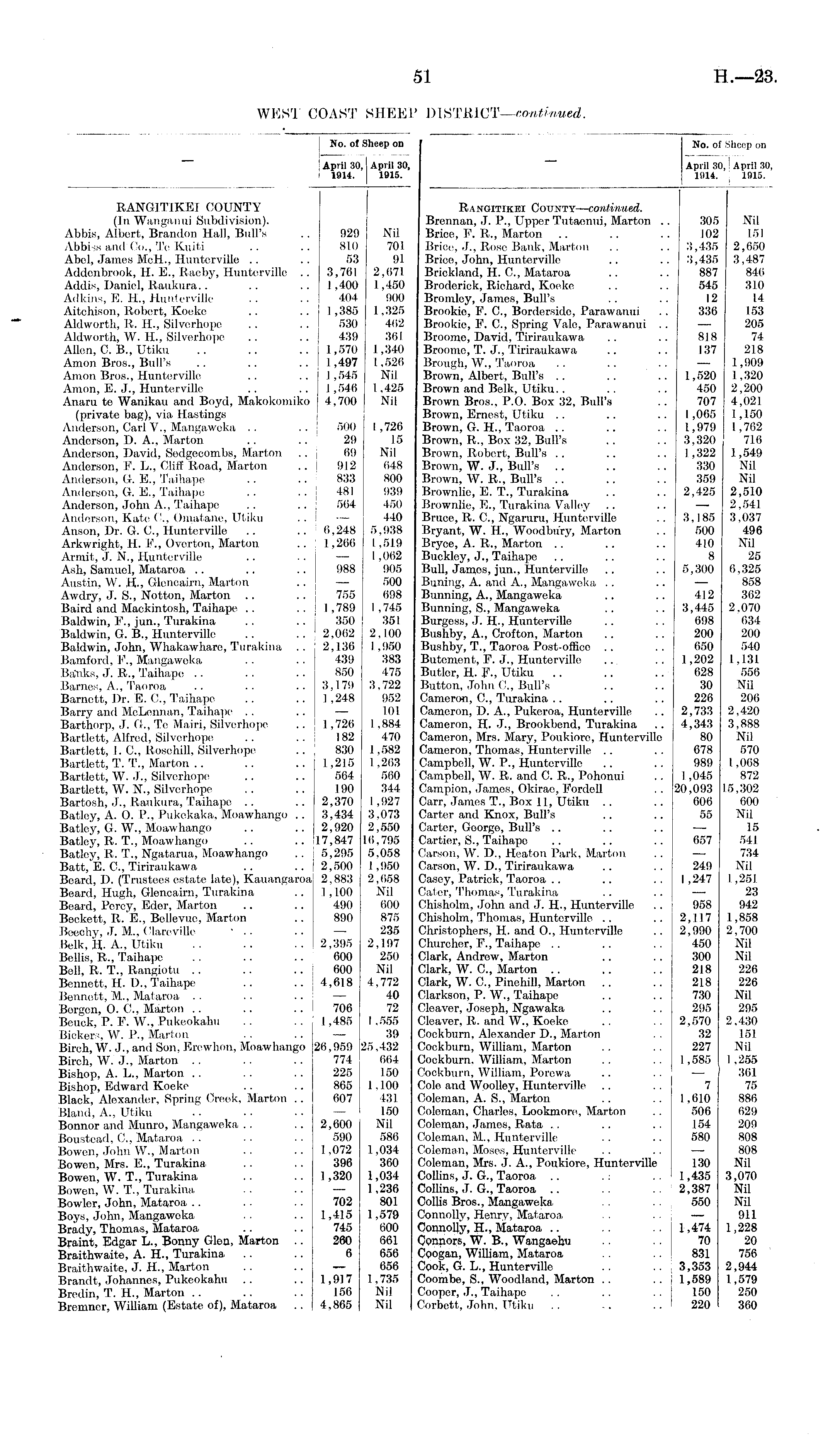 No. of Sheep on , April 30, April 30, 1014. 1015. Rancjitikei County—continued. Brennan, J. P., Upper Tutaenui, Marton .. 305 Nil Brice, F. R., Marton .. .. .. 102 15] Brioe, J., Rose Bank, Marton .. .. 3,435 2,650 Brice, John, Hunterville .. .. 3,435 3,487 Brickland, H. C., Mataroa .. .. 887 846 Broderick, Richard, Koeke .. .. 545 310 Bromley, James, Bull's .. .. 12 14 Brookie, F. C., Borderside, Parawanui . . 336 153 Brookie, F. C., Spring Vale, Parawanui .. — 205 Broome, David, Tiriraukawa .. .. 818 74 Broome, T. J., Tiriraukawa .. .. 137 218 Brough, W., Taoroa .. .. .. — 1,!)09 Brown, Albert, Bull's .. .. .. 1,520 1,320 Brown and Belk, Utiku.. .. .. 450 2,200 Brown Bros., P.O. Box 32, Bull's .. 707 4,021 Brown, Ernest, Utiku .. .. I ,065 1,150 Brown, G. H., Taoroa .. .. .. 1,979 1,762 Brown, R., Box 32, Bull's .. .. 3,320 716 Brown, Robert, Bull's .. .. .. 1,322 1,549 Brown, W. J., Bull's .. .. .. 330 Nil Brown, W. R., Bull's .. .. . . 359 Nil Brownlie, E. T., Turakina .. .. 2,425 2,510 Brownlie, E., Turakina Valley .. .. — 2,541 Bruce, R. C., Ngaruru, Hunterville .. 3,185 3,037 Bryant, W. H., Woodbury, Marton .. 500 496 Bryce, A. R., Marton .. .. .. 410 Nil Buckley, J., Taihape .. .. .. 8 25 Bull, Jamos, jun., Hunterville .. .. 5,300 6,325 Buning, A. and A., Mangaweka .. .. — 858 Bunning, A., Mangaweka .. .. 412 362 Bunning, S., Mangaweka .. .. 3,445 2,070 Burgess, J. H., Hunterville .. . . 698 634 Busiiby, A., Crofton, Marton .. .. 200 200 Bushby, T., Taoroa Post-office .. . . 650 540 Butement, F. J., Hunterville .. J ,202 1,131 Butler, H. F-, Utiku .. .. .. 628 556 Button, John C„ Bull's .. .. 30 Nil Cameron, C., Turakina .. .. .. 226 206 Cameron, D. A., Pukeroa, Hunterville .. 2,733 2,420 Cameron, H. J., Brookbend, Turakina .. 4,343 3,888 Cameron, Mrs. Mary, Poukiore, Hunterville 80 Nil Cameron, Thomas, Hunterville .. . . 678 570 Campbell, W. P., Hunterville .. .. 989 1,068 Campbell, W. R. and C. R., Pohonui .. 1,045 872 Campion, James, Okirae, Fordell .. 20,093 15,302 Carr, James T., Box 11, Utiku .. .. 606 600 Carter and Knox, Bull's .. .. 55 Nil Carter, George, Bull's .. .. .. — 15 Cartier, S., Taihape .. .. .. 657 541 Carson, W. D., Heaton Park, Marton .. — 734 Carson, W. P., Tiriraukawa .. . . 249 Nil Casey, Patrick, Taoroa .. .. .. 1,247 1,251 Cater, Thomas, Turakina .. .. — 23 Chisholm, John and J. H., Hunterville .. 958 942 Chisholm, Thomas, Hunterville .. .. 2,117 1,858 Christophers, H. and O., Hunterville .. 2,990 2,700 Churcher, F., Taihape .. .. 450 Nil Clark, Andrew, Marton .. . . 300 Nil Clark, W. C., Marton . . .. .. 218 226 Clark, W. C., Pinehill, Marton .. .. 218 226 Clarkson, P. W., Taihape .. .. 730 Nil Cleaver, Joseph, Ngawaka .. . . 295 295 Cleaver, R. and W., Koeke .. .. 2,570 2,430 Cockburn, Alexander D., Marton . . 32 151 Cockburn, William, Marton .. 227 Nil Cockburn. William, Marton .. .. 1,585 1,255 Cockburn, William, Porewa .. — 361 Cole and Woolley, Hunterville .. . . 7 75 Coleman, A. S., Marton .. .. 1,610 886 Coleman, Charles, Lookmore, Marton .. 506 629 Coleman, James, Rata . . .. . . 154 209 Coleman, M., Hunterville .. .. 580 808 Coleman, Moses, Hunterville .. .. — 808 Coleman, Mrs. J. A., Poukiore, Hunterville 130 Nil Collins, J. G., Taoroa .. 1,435 3,070 Collins, J. G., Taoroa .. 2,387 Nil Collis Bros., Mangaweka 550 Nil Connolly, Henry, Mataroa . . — 911 Connolly, H., Mataroa .. .. .. 1,474 1,228 Connors, W. B., Wangaehu ■ ■ 70 20 Coogan, William, Mataroa . . 1 831 756 Cook, G. L., Hunterville .. 3,353 2,944 Coombe, S., Woodland, Marton .. .. 1,589 1,579 Cooper, J., Taihape .. .. .. 150 250 Corbett, John, Utiku . .. ' 220 360