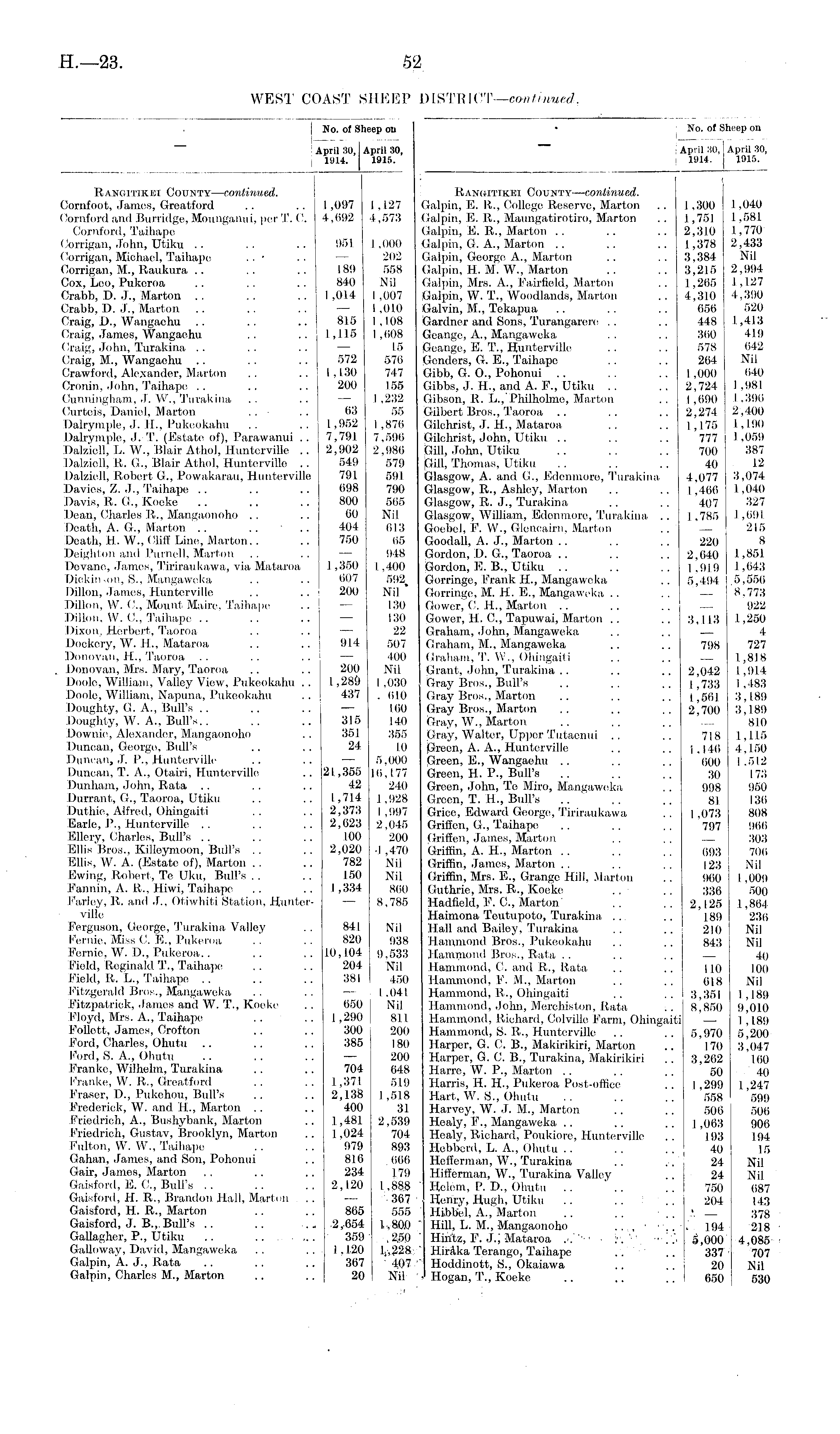 No. of Sheep ou ■ No. of Sheep on April 30, April 30, April 30,1 April 30, 1914. 1915. : 1914. j 1915. ■ I Rangitikei County—continued. \ Rangitikei County—continued. Cornfoot, Jamos, Greatford .. .. 1,097 1,127 Galpin, E. R., College Reserve, Marton .. 1,300 1,040 Cornford and Burridge, Mounganui, per T. C. 4,692 4,573 Galpin, E. R., Maungatirotiro, Marton .. 1,75] 1,581 Cornford, Taihape Galpin, E. R., Marton .. .. .. 2,310 1,770 Corrigan, .Tohn, Utiku .. .. .. 951 1,000 Galpin, G. A., Marton .. .. .. 1,378 2,433 Corrigan, Michael, Taihape .. ■ .. — 202 Galpin, George A., Marton .. .. 3,384 Nil Corrigan, M., Raukura .. .. .. 189 558 Galpin, H. M. W., Marton .. .. 3,215 2,994 Cox, Leo, Pukeroa .. .. .. 840 Nil Galpin, Mrs. A., Fairfield, Marton .. 1,265 1,127 Crabb, D. J., Marton .. .. .. 1,014 1,007 Galpin, W. T., Woodlands, Marton .. 4,310 4,390 Crabb, D. J., Marton .. .. .. — 1,010 Galvin, M., Tekapua .. .. .. 656 520 Craig, I)., Wangaehu .. .. .. 815 1,108 Gardner and Sons, Turangarere .. .. 448 1,413 Craig, James, Wangaehu .. .. 1,115 1,608 Geange, A., Mangaweka .. .. 360 419 Craig, John, Turakina .. . . .. — 15 Geange, E. T., Hunterville .. .. 578 642 Craig, M., Wangaehu . . . . .. 572 576 Genders, G. E., Taihape .. .. 264 Nil Crawford, Alexander, Marton .. .. 1,130 747 Gibb, G. O., Pohonui .. 1,000 640 Cronin, John, Taihape .. .. .. 200 155 Gibbs, J. H., and A. F., Utiku .. .. 2,724 1,981 Cunningham, J. W., Turakina .. .. — 1,232 Gibson, R. L., Philholme, Marton .. 1,690 1,396 Curteis, Daniel, Marton .. .. 63 55 Gilbert Bros., Taoroa .. .. .. 2,274 2,400 Dalrymple, J. H., Pulceokahu .. .. 1,952 1,876 Gilchrist, J. H., Mataroa .. .. 1,175 1,190 Dalrymple, J. T. (Estate of), Parawanui .. 7,791 7,596 Gilchrist, John, Utiku .. .. 777 1,059 Dalzioll, L. W., Blair Athol, Hunterville .. 2,902 2,986 Gill, John. Utiku .. .. .. 700 387 Dalzioll, R. G., Blair Athol, Hunterville .. 549 579 pill, Thomas, Utiku . . . . .. 40 12 Dalzioll, Robert G., Powakarau, Hunterville 791 591 Glasgow, A. and G., Edenmore, Turakina 4,077 3,074 Davies, Z. J., Taihape .. .. .. 698 790 Glasgow, R., Ashley, Marton .. .. 1,466 1,040 Davis, R. G., Kocke .. .. .. 800 565 Glasgow, R. J., Turakina .. .. 407 327 Dean, Charles R., Mangaonoho .. .. 60 Nil Glasgow, William, Edontnore, Turakina .. 1,785 1,691 Death, A. G., Marton .. .. .. 404 613 Goebel, F. W., Glencairn, Marton .. — 215 Death, H. W., Cliff Line, Marton.. .. 750 65 Goodall, A. J., Marton .. .. .. 220 8 Deighton and Purnell, Marton .. .. — 948 Gordon, D. G., Taoroa .. .. .. 2,640 1,851 Devane, James, Tiriraukawa, via Mataroa 1,350 1,400 Gordon, E. B., Utiku .. .. .. 1,919 1,643 Dickinson, S., Mangaweka .. •• #07 592, Gorringe, Frank H., Mangaweka .. 5,494 .5,556 Dillon, James, Hunterville .. .. 200 Nil Gorringe, M. H. E., Mangaweka .. .. — 8,773 Dillon, W. C., Mount Maire, Taihape .. — 130 Gower, C. H., Marton .. .. .. — 922 Dillon, W. C., Taihape .. .. .. — 130 Gower, H. C., Tapuwai, Marton .. ., 3,113 1,250 Dixon, Herbert, Taoroa . . .. — 22 Graham, John, Mangaweka .. . . — 4 Dockery, W. H., Mataroa .. .. 914 507 Graham, M., Mangaweka .. .. 798 727 Donovan, H., Taoroa .. .. .. — 400 Graham, T. W, Ohingaiti .. .. — 1,818 Donovan, Mrs. Mary, Taoroa .. .. 200 Nil Grant, John, Turakina .. .. .. 2,042 1,914 Doolo, William, Valley View, Pukeokahu .. 1,289 1,030 Gray Bros., Bull's .. .. .. 1,733 1,483 Doole, William, Napuna, Pukeokahu .. 437 . 610 Gray Bros., Marton .. .. .. 1,561 3,189 Doughty, G. A., Bull's .. .. .. — 160 Gray Bros., Marton .. .. .. 2J00 3,189 Doughty, W. A., Bull's.. .. .. 315 140 Gray, W., Marton .. .. — 810 Downie, Alexander, Mangaonoho .. 351 355 Gray, Walter, Upper Tutaenui .. .. 718 1,115 Duncan, Georgo, Bull's .. .. 24 10 Green, A. A., Hunterville .. .. 1,146 4,150 Duncan, J. P., Hunterville .. .. — 5,000 Green, E., Wangaehu .. .. .. 600 1,512 Duncan, T. A., Otairi, Hunterville .. 21,355 16,177 Green, H. P., Bull's .. .. .. 30 173 Dunham, John, Rata .. . . .. 42 240 Green, John, To Miro, Mangaweka .. 998 950 Durrant, G., Taoroa, Utiku .. .. 1,714 1,928 Green, T. H., Bull's .. .. .. 81 136 Duthie, Alfred, Ohingaiti .. .. 2,373 1,997 Grice, Edward George, Tiriraukawa .. 1,073 808 Earle, P., Hunterville .. .. .. 2,623 2,045 Griffon, G., Taihape .. .. .. 797 966 Ellery, Charles, Bull's .. .. .. 100 200 Griff en, James, Marton . . . . — 303 Ellis Bros., Killeymoon, Bull's .. .. 2,020 -1,470 Griffin, A. H., Marton .. .. .. 693 706 Ellis, W. A. (Estate of), Marton .. .. 782 Nil Griffin, James, Marton . . . . . . 123 Nil Ewing, Robert, Te Uku, Bull's.. .. 150 Nil Griffin, Mrs. E., Grange Hill, Marton .. 960 1,009 Fannin, A. R., Hiwi, Taihape .. .. 1,334 860 Guthrie, Mrs. R., Koeke .. .. 336 500 Farley, R. and J., Otiwhiti Station, Hunter- — 8,785 Hadfield, F. 0., Marton .. .. 2,125 1,864 ville Haimona Teutupoto, Turakina .. .. 189 236 Ferguson, George, Turakina Valley .. 841 Nil Hall and Bailey, Turakina .. .. 210 Nil Fernie, Miss C. E., Pukeroa .. .. 820 938 Hammond Bros., Pukeokahu .. .. 843 Nil Fernie, W. D., Pukeroa.. .. .. 10,104 9,533 Hammond Bros., Rata .. .. .. — 40 Field, Reginald T., Taihape .. .. 204 Nil Hammond, C. and R., Rata .. .. 110 100 Field, R. L., Taihape .. .. .. 381 450 Hammond, F. M., Marton . . .. 618 Nil Fitzgerald Bros., Mangaweka .. .. — 1,041 Hammond, R., Ohingaiti .. .. 3,36] 1,189 Fitzpatriok, James and W. T., Koeke .. 650 Nil Hammond, John, Merchiston, Rata .. 8,850 9,010 Floyd, Mrs. A., Taihape .. .. 1,290 811 Hammond, Richard, Colville Farm, Ohingaiti — 1,189 Foliott, James, Crofton .. .. 300 200 Hammond, S. R., Hunterville .. .. 5,970 5,200 Ford, Charles, Ohutu .. .. .. 385 180 Harper, G. C. B., Makirikiri, Marton .. 170 3,047 Ford, S. A., Ohutu .. .. .. — 200 Harper, G. C. B., Turakina, Makirikiri .. 3,262 160 Franke, Wilhehn, Turakina . . .. 704 648 Harre, W. P., Marton .. .. .. 50 40 Franke, W. R., Greatford .. .. 1,371 519 Harris, H. H., Pukeroa P