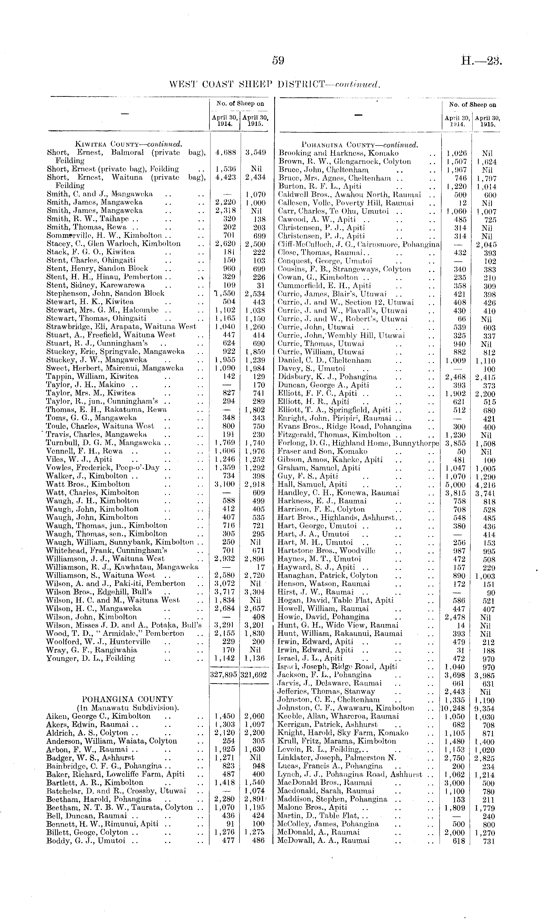 No. of Sheep on April 30, April 30, 1914. 1915. Pohangina County—continual. Brooking and Harkness, Komako .. 1,026 Nil Brown, R. W., Glengarnock, Colyton .. 1,507 1,624 Bruce, John, Cheltenham .. .. 1,967 Nil Brace, Mrs. Agnes, Cheltenham .. .. 746 1,797 Burton, R. F. L., Apiti .. .. 1,220 1,014 Caldwell Bros., Awahou North, Raumai .. 500 600 Callesen, Voile, Poverty Hill, Raumai .. 12 Nil Carr, Charles, Te Ohu, Umutoi .. 1,060 ! ,007 Cawood, A. W., Apiti .. .. .. 485 725 Christensen, P. J., Apiti .. .. 314 Nil Christensen, P. J., Apiti .. .. 314 Nil Cliff-McCulloch, J. G., Cairnsmore, Pohangina — 2,045 Close, Thomas, Raumai.. .. .. 432 393 Conquest, George, Umutoi .. .. — 102 Cousins, P. B., Strangeways, Colyton .. 340 383 Cowan, G., Kimbolton .. .. .. 235 210 Cummerfield, E. H., Apiti .. .. 358 309 Curric, James, Blair's, Utuwai . . .. 421 398 Currie, J. and W., Section 12, Utuwai .. 408 426 Currie, J. and W., Flavall's, Utuwai .. 430 410 Currie, J. and W., Robert's, Utuwai .. 66 Nil Currie, John, Utuwai .. .. .. 539 603 Currie, John,'Wembly Hill, Utuwai .. 325 337 Currie, Thomas, Utuwai .. .. 940 Nil Currie, William, Utuwai .. .. 882 812 Daniel, C. D., Cheltenham .. 1,009 1,110 Davey, S., Umutoi .. .. .. — 100 Didsbury, K. J., Pohangina .. .. 2,468 2,415 Duncan, George A., Apiti .. .. 393 373 Elliott, F. F. C., Apiti .. .. .. 1,902 2,200 Elliott, H. R., Apiti .. .. .. 621 515 Elliott, T. A., Springfield, Apiti .. .. 512 680 Enright, John, Piripiri, Raumai .. .. — 421 Evans Bros., Ridge Road, Pohangina . . 300 400 Fitzgerald, Thomas, Kimbolton .. .. 1,230 Nil Forlong, D. G., Highland Home, Bunnythorpe 3,855 1,508 Eraser and Son, Komako .. .. 50 Nil Gibson, Amos, Kaheke, Apiti .. .. 481 .100 Graham, Samuel, Apiti .. 1,047 1,005 Guy, F. S., Apiti .. .. 1,070 1,290 Hall, Samuel, Apiti .. .. .. 5,000 4,216 Handley, C. H., Konewa, Raumai .. 3,8]5 3,741 Harkness, E. J., Raumai .. . . 758 818 Harrison, F. E., Colyton .. . . 708 528 Hart Bros., Highlands, Ashhurst.. .. 548 485 Hart, George, Umutoi .. .. .. 380 436 Hart, J. A., Umutoi .. .. .. — 414 Hart, M. H., Umutoi .. .. .. 256 153 Hartstone Bros., Woodville .. .. 987 995 Haynes, M. T., Umutoi .. .. 472 508 Hayward, S. J., Apiti .. .. .. 157 229 Hanaghan, Patrick, Colyton .. .. 890 1,003 Henson, Watson, Raumai .. .. 172 151 Hirst, J. W., Raumai .. .. .. — 90 Hogan, David, Table Flat, Apiti .. 586 521 Howell, William, Raumai .. . . 447 407 Howie, David, Pohangina .. . . 2,478 Nil Hunt, G. H., Wide View, Raumai .. 14 Nil Hunt, William, Rakaunui, Raumai .. 393 Nil Irwin, Edward, Apiti .. .. . . 479 212 Irwin, Edward, Apiti .. .. .. 31 188 Israel, J. L., Apiti .. .. .. 472 970 Israel, Joseph, Ridge Road, Apiti .. 1,040 970 Jackson, F. L., Pohangina .. .. 3,698 3,985 Jarvis, J., Delaware, Raumai .. .. 661 631 Jefferies, Thomas, Stanway .. .. 2,443 Nil Johnston, C. E., Cheltenham .. .. 1,335 1,190 Johnston, C. F., Awawaru, Kimbolton .. 10,248 9,354 Keeble, Allan, Whareroa, Raumai .. 1,050 1,030 Kerrigan, Patrick, Ashhurst .. . . 682 708 Knight, Harold, Sky Farm, Komako . . 1,105 871 Krull, Fritz, Marama, Kimbolton .. 1,480 1,400 Levein, R. L., Foilding,.. .. . . 1,1 53 1,020 Linklater, Joseph, Palmerston N. .. 2,750 2,825 Lucas, Francis A., Pohangina .. . . 200 234 Lynch, J. J., Pohangina Road, Ashhurst . . 1,062 1,214 MacDonald Bros., Raumai .. .. 3,000 500 Macdonald, Sarah, Raumai .. .. 1,100 780 Maddison, Stephen, Pohangina .. .. 153 211 Malone Bros., Apiti .. .. .. 1,809 1,779 Martin, D., Table Flat, .... .. — 240 McColley, James, Pohangina .. .. 500 800 McDonald, A., Raumai .. .. 2,000 1,270 MoDowall, A. A., Raumai .. .. 618 731