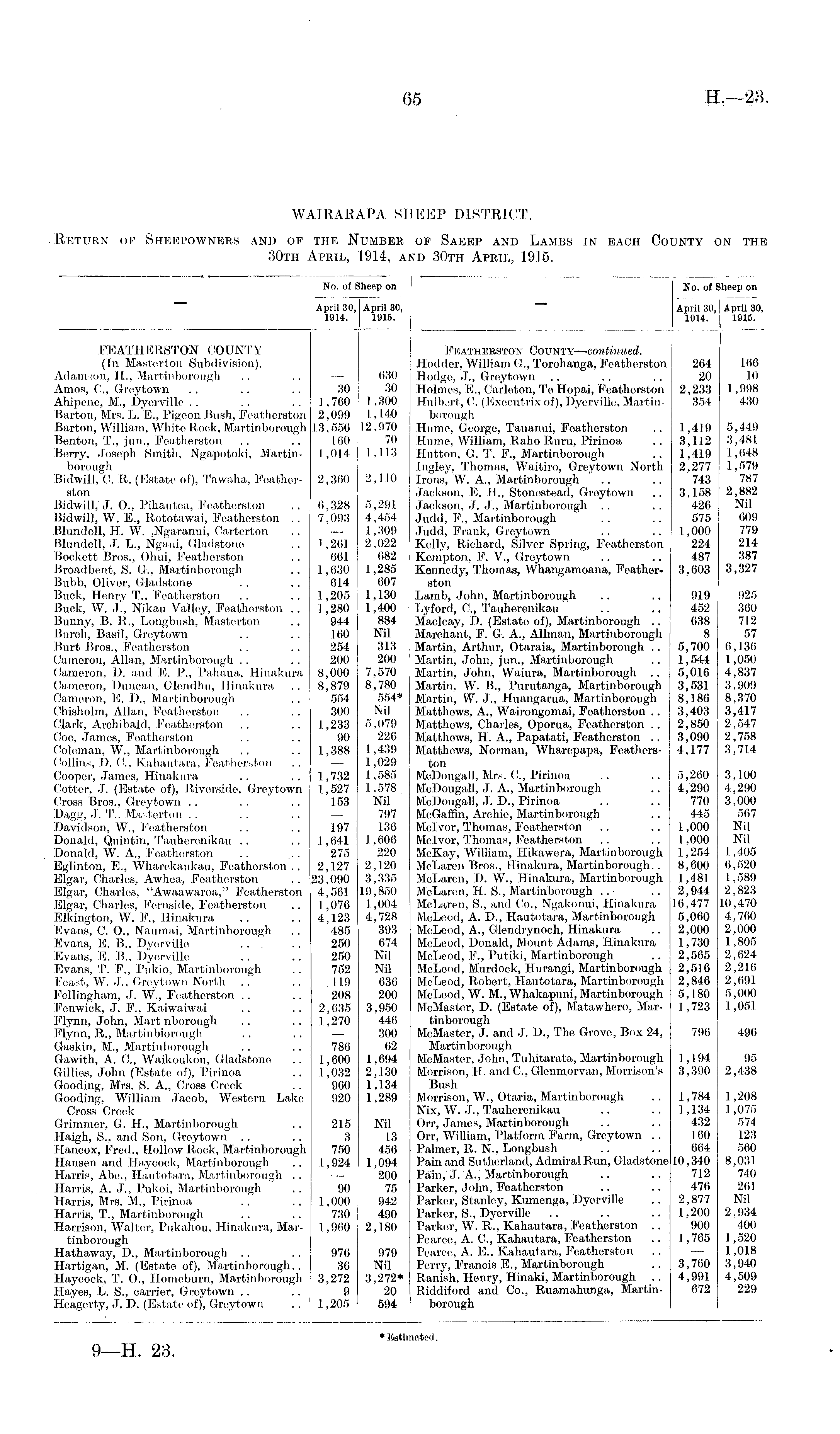 WAIRARAPA SHEEP DISTRICT. Return of Sheepowners and of the Number of Saeep and Lambs in each County on the 30th April, 1914, and 30th April, 1915.