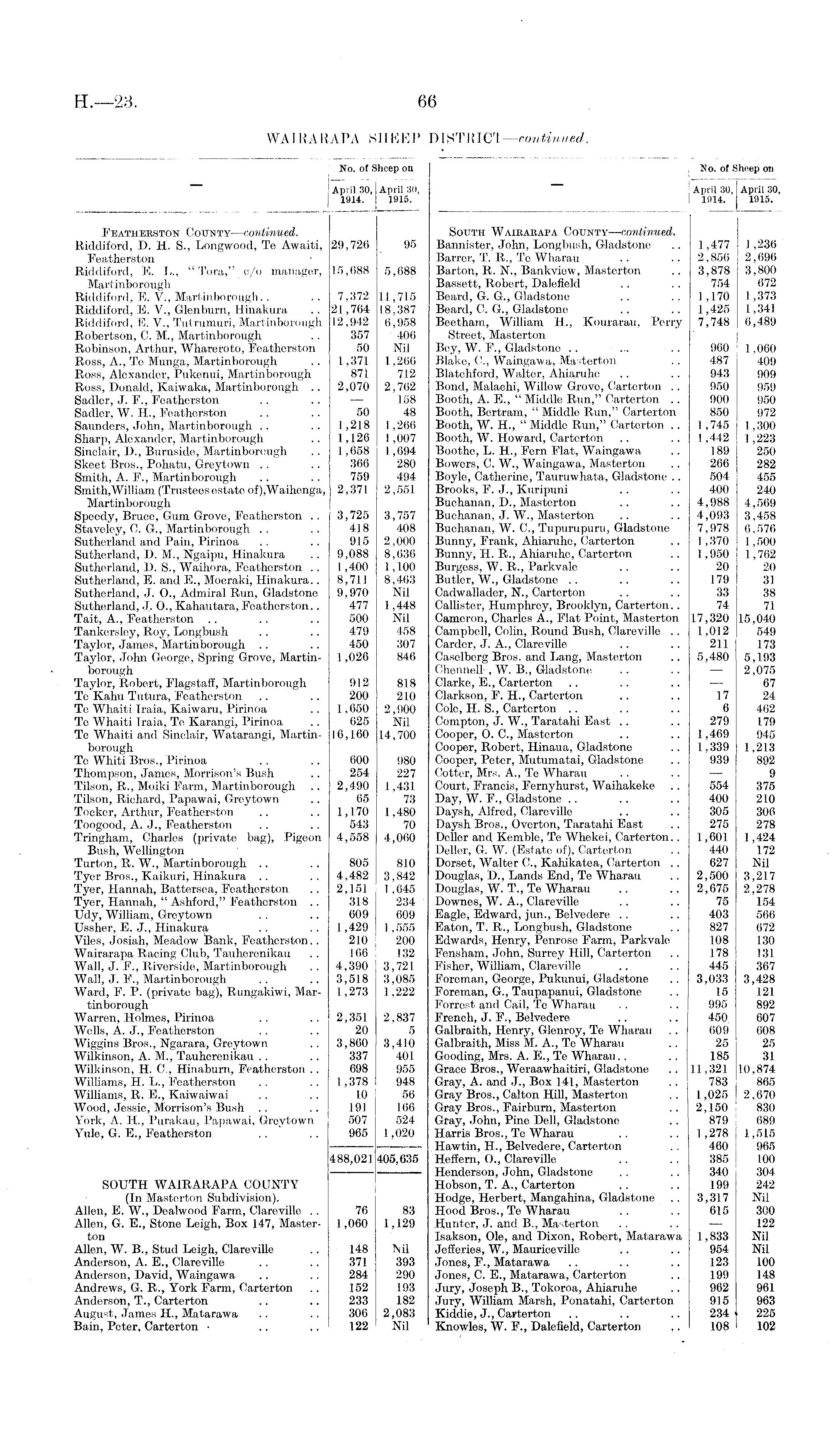 No. of Sheep on : April 30,1 April 30, 1914. 1915. South Wairarapa County—continued. Bannister, John, Longbush, Gladstone .. 1,477 1,236 Barrel - , T. R., Te Wharau . ■ ■. 2,850 2,696 Barton, R. N., Bankview, Masterton .. 3,878 3,800 Bassett, Robert, Dalefield . . . . 754 672 Beard, G. G., Gladstone .. .. 1,170 1,373 Beard, C. G., Gladstone .. 1,425 1,34] Beetham, William H., Kourarau, Perry 7,748 6,489 Street, Masterton Boy, W. F., Gladstone .. ... .. 960 1,060 Blake, C., Waingawa, Masterton . . 487 400 Blatchford, Walter, Ahiaruhe .. .. 943 909 Bond, Malaohi, Willow Grove, Carterton .. 950 959 Booth, A. E., " Middle Run," Carterton .. 900 950 Booth, Bertram, " Middle Run," Carterton 850 972 Booth, W. H., " Middle Run," Carterton .. I ,745 I ,300 Booth, W. Howard, Carterton .. .. 1,442 1,223 Boothe, L. H., Pern Flat, Waingawa .. 189 250 Bowers, C. W., Waingawa, Masterton .. 266 282 Boyle, Catherine, Tauruwhata, Gladstone .. 504 455 Brooks, P. J., Kuripuni .. .. 400 240 Buchanan, D., Masterton .. .. 4,988 4,569 Buchanan, J. W., Masterton .. .. 4,093 3,458 Buchanan, W. C., Tupurupuru, Gladstone 7,978 6,576 Bunny, Prank, Ahiaruhe, Carterton .. 1,370 1,500 Bunny, H. R., Ahiaruhe, Carterton .. I ,950 1,762 Burgess, W. R., Park vale .. .. 20 20 Butler, W., Gladstone .. .. .. 179 31 Cadwallader, N., Carterton . . . . 33 38 Callister, Humphrey, Brooklyn, Carterton.. 74 71 Cameron, Charles A., Flat Point, Masterton 17,320 15,040 Campbell, Colin, Round Bush, Clareville .. 1,012 549 Carder, J. A., Clareville .. .. 211 173 Caselberg Bros, and Lang, Masterton .. 5,480 5,193 ChennelP, W. B., Gladstone .. .. —• 2,075 Clarke, E., Carterton .. .. .. — 67 Clarkson, F. H., Carterton .. .. 17 24 Cole, H. S., Carterton .. . . .. 6 462 Compton, J. W., Taratahi East .. .. 279 1.79 Cooper, O. C., Masterton .. .. 1,469 945 Cooper, Robert, Hinaua, Gladstone .. 1,339 1,213 Cooper, Peter, Mutumatai, Gladstone .. 939 892 Cotter, Mrs. A., Te Wharau . . .. — 9 Court, Francis, Pernyhurst, Waihakeke .. 554 375 Day, W. P., Gladstone .. .. .. 400 210 Daysh, Alfred, Clareville .. .. 305 306 Daysh Bros., Overton, Taratahi East .. 275 278 Deller and Kemble, Te Whekei, Carterton.. 1,601 1,424 Deller, G. W. (Estate of), Carterton . . 440 172 Dorset, Walter C., Kahikatea, Carterton .. 627 Nil Douglas, D., Lands End, Te Wharau .. 2,500 3,217 Douglas, W. T., Te Wharau .. .. 2,675 2,278 Downes, W. A., Clareville .. .. 75 154 Eagle, Edward, jun., Belvedere . . .. 403 566 Eaton, T. R., Longbush, Gladstone .. 827 672 Edwards, Henry, Penrose Farm, Parkvale 108 130 Fensham, John, Surrey Hill, Carterton .. 178 131 Fisher, William, Clareville .. .. 445 367 Foreman, George, Pukunui, Gladstone .. 3,033 3,428 Foreman, G., Taupapanui, Gladstone .. 15 121 Forrest and. Cail, Te Wharau .. . . 995 892 French, J. F., Belvedere .. .. 450. 607 Galbraith, Henry, Glenroy, Te Wharau . . 609 608 Galbraith, Miss M. A., Te Wharau .. 25 25 Gooding, Mrs. A. E., Te Wharau.. . . 185 31 Grace Bros., Weraawhaitiri, Gladstone .. 11,321 10,874 Gray, A. and J., Box 141, Masterton .. 783 865 Gray Bros., Calton Hill, Masterton 1,025 2,670 Gray Bros., Fairburn, Masterton .. 2,150 830 Gray, John, Pine Dell, Gladstone .. 879 I 689 Harris Bros., Te Wharau .. .. 1,278 1,515 Hawtin, H., Belvedere, Carterton . . 460 965 Heffern, O., Clareville .. . . 385 100 Henderson, John, Gladstone .. .. 340 304 Hobson, T. A., Carterton .. .. 199 242 Hodge, Herbert, Mangahina, Gladstone .. 3,317 Nil Hood Bros., Te Wharau . . . . 615 300 Hunter, J. and B., Masterton . . .. — 122 Isakson, Ole, and Dixon, Robert, Matarawa 1,833 Nil Jefieries, W., Maurice ville .. .. 954 Nil Jones, F., Matarawa . . . . .. 123 100 Jones, C. E., Matarawa, Carterton .. 199 148 Jury, Joseph B., Tokoroa, Ahiaruhe .. 962 961 Jury, William Marsh, Ponatahi, Carterton 915 963 Kiddie, J., Carterton .. .. .. 234- 225 Knowles, W. F., Dalefield, Carterton ,. 108 102