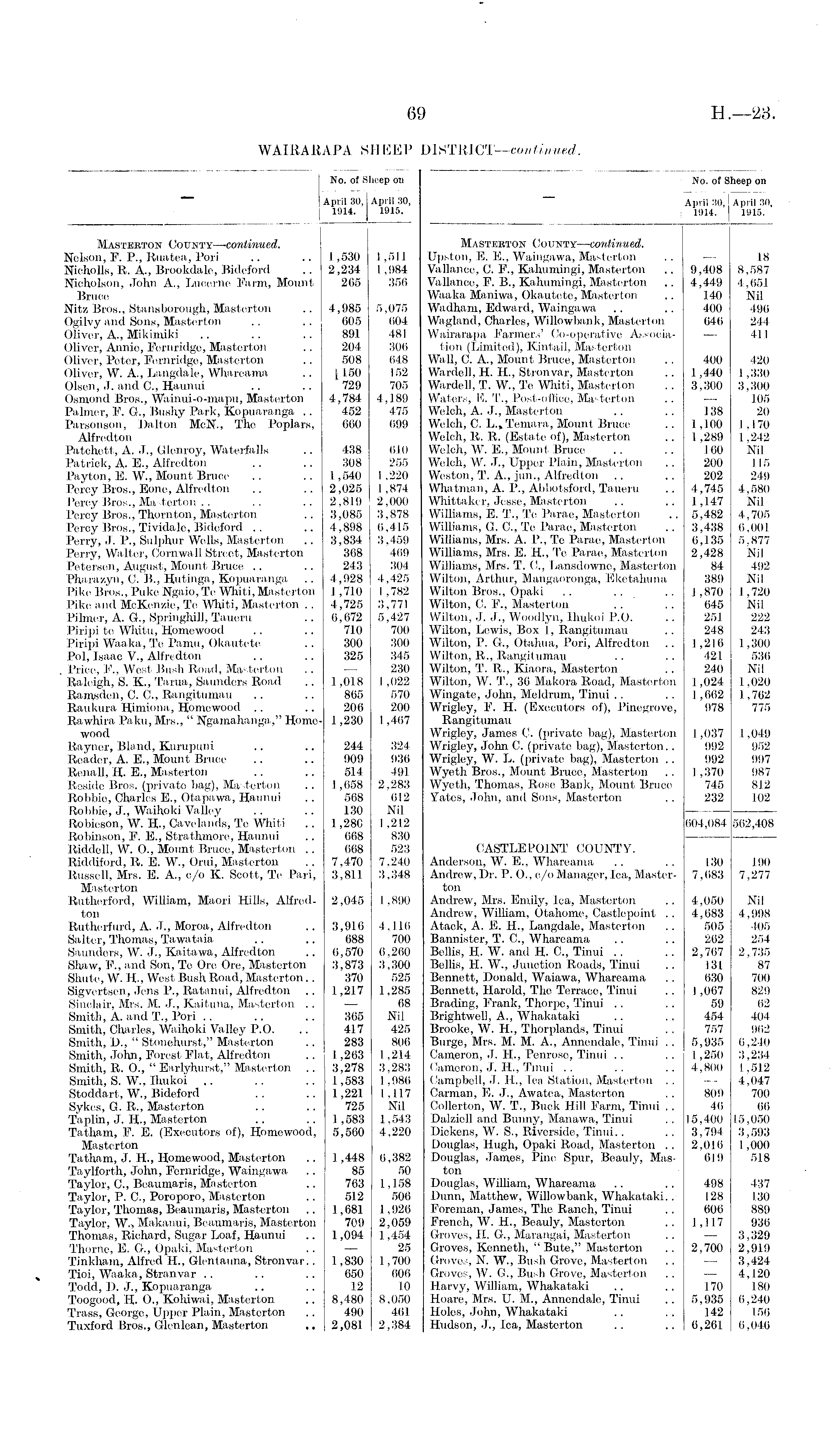 No. of Sheep on April 30, April 30, | 1914. 1915. Masterton County—continued. Upston, E. E., Waiugawa, Masterton .. — 18 Vallance, C. F., Kahumingi, Masterton .. 9,408 8,587 Vallance, P. B., Kahumingi, Masterton .. 4,449 4,651 Waaka Maniwa, Okautete, Masterton .. 140 Nil Wadham, Edward, Waingawa .. .. 400 490 Wagland, Charles, Willowbank, Masterton 646 244 Wairarapa Farmer/ Co-operative Associa- — 411 tion (Limited), Kintail, Mas-terton Wall, C. A., Mount Bruce, Masterton .. 400 420 Wardell, H. H., Stronvar, Masterton .. 1,440 1,330 Wardell, T. W., Te Whiti, Masterton .. 3,300 3,300 Waters, E. T., Post-office, Masterton .. — 105 Welch, A. J., Masterton .. .. 138 20 Welch, C. Mount Bruce .. 1,100 1,170 Welch, R. R. (Estate of), Masterton .. 1. ,289 1,242 Welch, W. E., Mount. Bruce .. .. 160 Nil Welch, W. J., Upper Plain, Masterton .. 200 115 Weston, T. A., jun., Alfredton .. .. 202 249 Whatman, A. P., Abbotsford, Taueru .. 4,745 4,580 Whittaker, Jesse, Masterton .. .. 1,147 Nil Williams, E. T., Te Parae, Masterton .. 5,482 4,705 Williams, G. C., Te Parae, Masterton .. 3,438 6,001 Williams, Mrs. A. P., Tc Parae, Masterton 6,135 5,877 Williams, Mrs. E. H., Te Parae, Masterton 2,428 Nil Williams, Mrs. T. C., Lansdowno, Masterton 84 492 Wilton, Arthur, Mangaoronga, Eketahuna 389 Nil Wilton Bros., Opaki .. .. .. 1,870 1,720 Wilton, C. F., Masterton . . . . 645 Nil Wilton, J. J., Woodlyn, lliukoi P.O. .. 251 222 Wilton, Lewis, Box 1, Rangitumau .. 248 243 Wilton, P. G., Otahua, Pori, Alfredton .. 1,216 1,300 Wilton, R., Rangitumau . . .. 421 536 Wilton, T. R., Kiaora, Masterton .. 240 Nil Wilton, W. T., 30 Makora Road, Masterton 1,024 1.020 Wingate, John, Meldrum, Tinui . . .. 1,662 1,762 Wrigley, F. H. (Executors of), Pinegrove, 978 775 Rangitumau Wrigley, James C. (private bag), Masterton 1 ,037 1,049 Wrigley, John C. (private bag), Masterton.. 992 952 Wrigley, W. L. (private bag), Masterton .. 992 997 Wyeth Bros., Mount Bruce, Masterton .. 1,370 987 Wyeth, Thomas, Rose Bank, Mount Bruce 745 812 Yates, John, and Sons, Masterton .. 232 102 604,084 562,408 CASTLEPOINT COUNTY. Anderson, W. E., Whareama .. .. 130 1.90 Andrew,Dr. P. 0.,c/oManager,lea, Master- 7,683 7,277 ton Andrew, Mrs. Emily, lea, Masterton .. 4,050 Nil Andrew, William, Otahome, Castlepoint .. 4,683 4,998 Atack, A. E. H., Langdale, Masterton .. 505 405 Bannister, T. C., Whareama .. .. 262 254 Bellis, H. W. and H. C„ Tinui .. .. 2,767 2,735 Bellis, H. W., Junction Roads, Tinui .. .131 87 Bennett, Donald, Waiawa, Whareama .. 630 700 Bennett, Harold, The Terrace, Tinui .. J ,067 829 Brading, Frank, Thorpe, Tinui .. .. 59 62 Brightwel], A., Whakataki .. . . 454 404 Brooke, W. H., Thorplands, Tinui .. 757 962 Burge, Mrs. M. M. A., Annendale, Tinui .. 5,935 6,240 Cameron, J. H, Penrose, Tinui .. .. 1,250 3,234 Cameron, J. I-L, Tinui .. .. .. 4,800 1,512 Campbell, J. H., Ioa Station, Masterton .. — 4,047 Carman, E. J., Awatea, Masterton . . 809 700 Collerton, W. T., Buck Hill Farm, Tinui . . 46 66 Dalziell and Bunny, Manawa, Tinui .. 15,400 15,050 Dickens, W. S., Riverside, Tinui.. .. 3,794 3,593 Douglas, Hugh, Opaki Road, Masterton .. 2,016 1,000 Douglas, James, Pine Spur, Beauly, Mas- 619 518 ton Douglas, William, Whareama .. .. 498 437 Dunn, Matthew, Willowbank, Whakataki.. 128 130 Foreman, James, The Ranch, Tinui .. 606 889 French, W. H., Beauly, Masterton .. 1,117 936 Groves, H. G., Marangai, Masterton .. — 3,329 Groves, Kenneth, " Bute," Masterton .. 2,700 2,919 Groves, N. W., Bush Grove, Masterton .. — 3,424 Groves, W. G., Bush Grove, Masterton .. — 4,120 Harvy, William, Whakataki .. .. 170 180 Hoare, Mrs. U. M., Annendale, Tinui .. 5,935 6,240 Holes, John, Whakataki .. .. 142 156 Hudson, J., Ica, Masterton .. .. 6,261 6,046