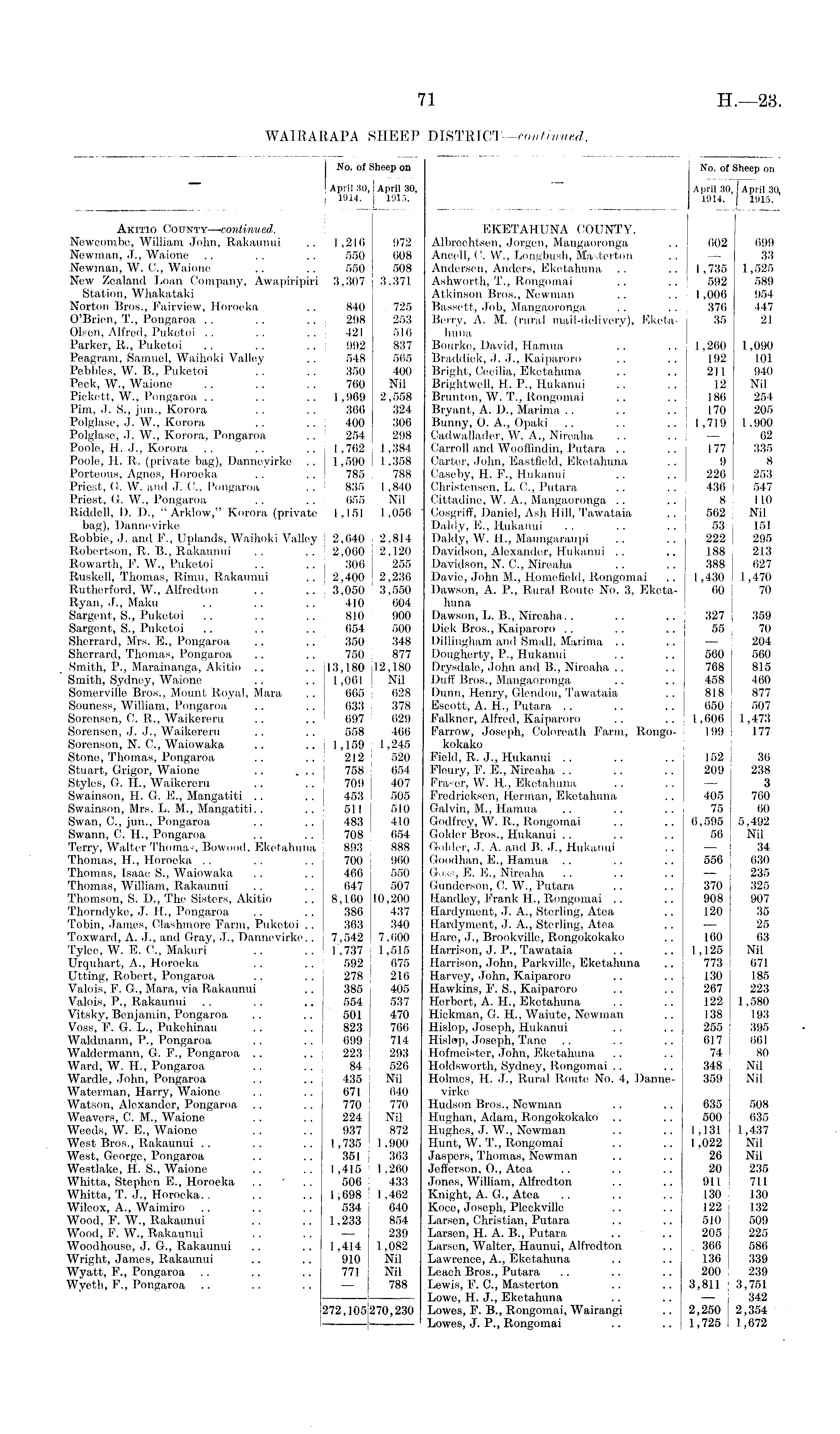 No. of Sheep on April 30, April 30, j 1914. 1915. Akitio Cototy—■continued. Newcombe, William John, Rakaunui .. 1,216 972 Newman, J., Waione .. . . .. 550 008 Newman, W. C., Waione .. .. 550 508 New Zealand Loan Company, Awapiripiri 3,307 3,371 Station, Whakataki Norton Bros., Fairview, Horoeka .. 840 725 O'Brien, 1\, Pongaroa .. . . .. 298 253 Olsen, Alfred, Puketoi .. . . . . 421 516 Parker, R., Puketoi .. . . .. 992 837 Peagram, Samuel, Waihoki Valley .. 548 565 Pebbles, W. B., Puketoi .. .. 350 400 Peck, W., Waione .. .. .. 760 Nil Pickett, W., Pongaroa .. . . .. ] , 969 2,558 Pim, J. S., jun., Korora .. .. 366 324 Polglase, J. W., Korora . . .. 400 306 Polglase, J. W., Korora, Pongaroa .. 254 298 Poole, H. J., Korora . . .. 1,762 , I ,384 Poole, H. R. (private bag), Dannevirke . . 1,590 I 1,358 Porteous, Agnes, Horoeka .. . . 785 i 788 Priest, G. W. and J. C., Pongaroa .. 835 I 1,840 Priest, G. W., Pongaroa .. .. 655 : Nil Riddell, I). D., " Arklow," Korora (private 1,151 1,056 bag), Dannevirke Robbie, J. and P., Uplands, Waihoki Valley 2,640 2,814 Robertson, R. B., Rakaunui .. .. 2,060 2,120 Rowarth, P. W., Puketoi .. .. 306 255 Ruskell, Thomas, Rimu, Rakaunui .. 2,400 2,236 Rutherford, W., Alfredton .. .. 3,050 3,550 Ryan, J., Maku .. .. .. 410 604 Sargent, S., Puketoi .. .. .. 810 900 Sargent, S., Puketoi .. .. .. 654 500 Sherrard, Mrs. E., Pongaroa .. .. 350 348 Sherrard, Thomas, Pongaroa .. .. 750 877 Smith, P., Marainanga, Akitio .. .. 13,180 12,180 Smith, Sydney, Waione .. .. 1,061 Nil Somerville Bros., Mount Royal, Mara .. 605 628 Souness, William, Pongaroa .. .. 633 378 Sorensen, C. R., Waikereru .. .. 697 629 Sorensen, J. J., Waikereru .. .. 558 466 Sorenson, N. C., Waiowaka .. .. 1,159 1,245 Stone, Thomas, Pongaroa .. .. 212 520 Stuart, Grigor, Waione .. ... 758 654 Styles, G. H., Waikereru .. .. 709 407 Swainson, H. G. E., Mangatiti .. . . 453 505 Swainson, Mrs. L. M., Mangatiti.. .. 511 510 Swan, C., jun., Pongaroa .. .. 483 410 Swann, C. H., Pongaroa .. .. 708 654 Terry, Walter Thomas, Bowood, Eketahuna 893 888 Thomas, H., Horoeka . . .. . . 700 960 Thomas, Isaac S., Waiowaka . . .. 466 550 Thomas, William, Rakaunui . . . . 647 507 Thomson, S. I)., The Sisters, Akitio . . 8,160 10,200 Thorndyke, J. H., Pongaroa .. .. 386 437 Tobin, James, Clashmore Farm, Puketoi .. 363 340 Toxward, A. J., and Gray, J., Dannevirke.. 7,542 7,600 Tylee, W. E. C., Makuri .. .. 1,737 1,515 Urquhart, A., Horoeka .. .. 592 675 Utting, Robert, Pongaroa .. . . 278 216 Valois, F. G., Mara, via Rakaunui .. 385 405 Valois, P., Rakaunui .. . . .. 554 537 Vitsky, Benjamin, Pongaroa . . .. 501 470 Voss, F. G. L., Pukehinau .. .. 823 766 Waldmann, P., Pongaroa . . .. 699 714 Waldermann, G. F., Pongaroa .. .. 223 293 Ward, W. H., Pongaroa . . .. 84 526 Wardle, John, Pongaroa .. .. 435 Nil Waterman, Harry, Waione .. .. 671 640 Watson, Alexander, Pongaroa .. .. 770 770 Weavers, C. M., Waione . . . . 224 Nil Weeds, W. E., Waione . . .. 937 872 West Bros., Rakaunui .. .. .. 1,735 1,900 West, George, Pongaroa .. .. 351 363 Westlake, H. S., Waione .. 1,415 1,260 Whitta, Stephen E., Horoeka . . ' . . 506 433 Whitta, T. J., Horoeka. . . . 1,698 1 ,462 Wilcox, A., Waimiro .. .. .. 534 640 Wood, F. W., Rakaunui .. .. 1,233 854 Wood, F. W., Rakaunui . . . . — 239 Woodhouse, J. G., Rakaunui .. .. 1,414 1,082 Wright, James, Rakaunui .. .. 910 Nil Wyatt, F., Pongaroa .. .. .. 771 Nil Wyeth, F., Pongaroa .. .. .. — 788 272,105 270,230