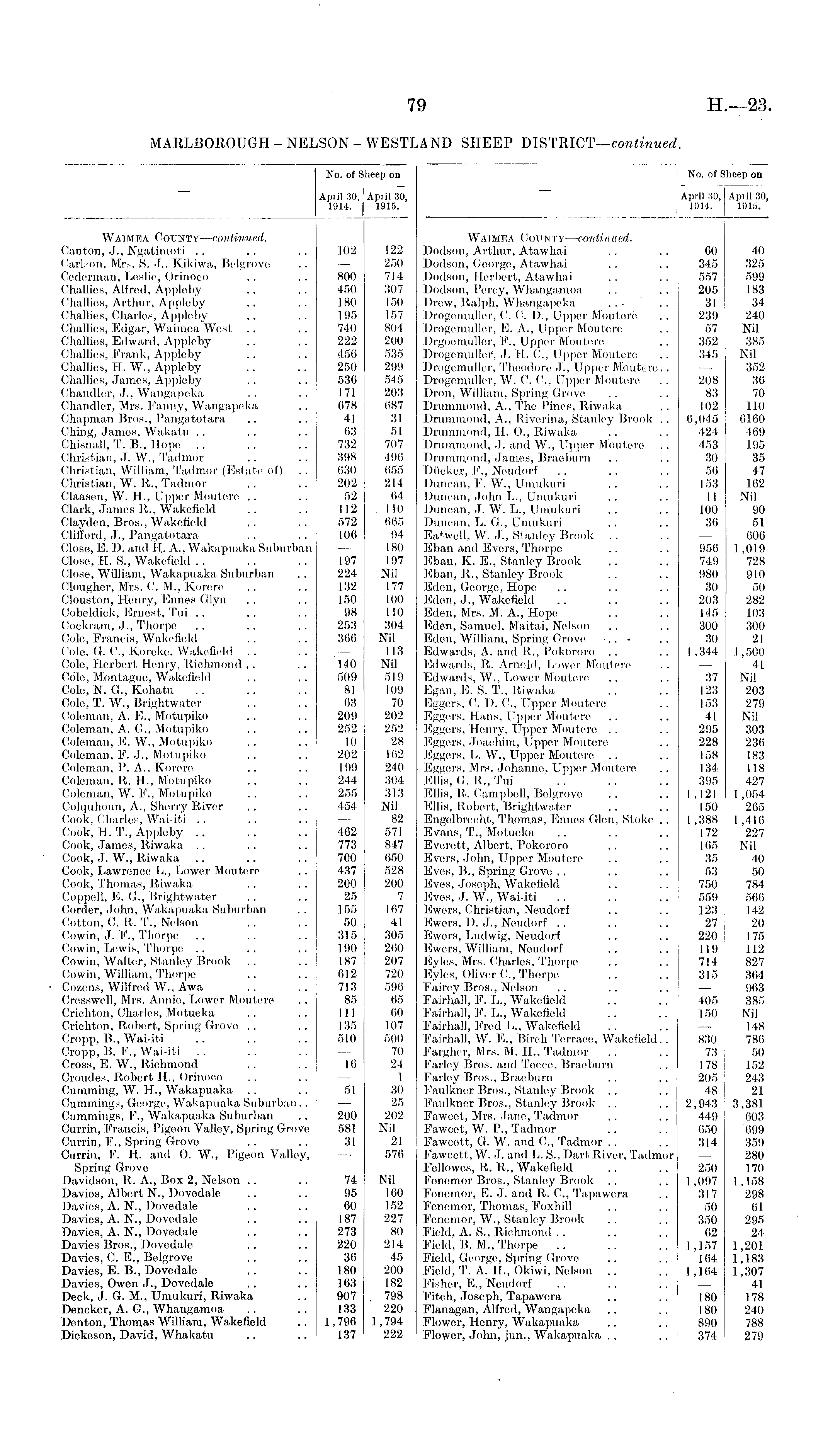 No. of Sheep on j April 30, j April 30, 1914. 1915. Wajmea County—continued. Dodson, Arthur, Atawhai .. .. CO 40 Dodson, George, Atawhai .. . . 345 325 Dodson, Herbert, Atawhai .. .. 557 599 Dodson, Percy, Whangamoa .. . . 205 183 Drew, Ralph, Whangapeka ... .. 31 34 Drogemuller, C. C. D., Upper Moutere .. 239 240 Drogemuller, E. A., Upper Moutere .. 57 Nil Drgoemuller, F., Upper Moutere .. 352 385 Drogemuller, J. H. C., Upper Moutere .. 345 Nil Drogemuller, Theodore J., Upper Moutere.. — 352 Drogemuller, W. C. C., Upper Moutere . . 208 36 Dron, William, Spring Grove .. .. 83 70 Drummond, A., The Pines, Riwaka .. 102 110 Drummond, A., lliverina, Stanley Brook .. 0,045 6160 Drummond, H. O., Riwaka .. . . 424 469 Drummond, J. and W., Upper Moutere .. 453 195 Drummond, James, Braeburn .. .. 30 35 Diieker, F., Neudorf .. .. .. 56 47 Duncan, F. W., Umukuri .. .. 153 162 Duncan, John L., Umukuri .. .. II Nil Duncan, .T. W. L., Umukuri .. .. 100 90 Duncan, L. G., Umukuri .. .. 36 51 Eatwell, W. J., Stanley Brook .. .. — 606 Eban and Evers, Thorpe .. .. 956 1,019 Eban, K. E., Stanley Brook .. .. 749 728 Eban, R., Stanley Brook .. .. 980 910 Eden, George, Hope .. .. . . 30 50 Eden, J., Wakefield .. .. .. 203 282 Eden, Mrs. M. A., Hope .. .. 145 103 Eden, Samuel, Maitai, Nelson .. .. 300 300 Eden, William, Spring Grove .. - .. 30 21 Edwards, A. and R., Pokororo .. .. 1,344 1,500 Edwards, R. Arnold, L>wer Moutere .. — 41 Edwards, W., Lower Moutere .. .. 37 Nil Egan, E. S. T., Riwaka .. .. 123 203 Eggers, C. D. C., Upper Moutere .. 153 279 Eggers, Hans, Upper Moutere .. .. 41 Nil Eggers, Henry, Upper Moutere .. .. 295 303 Eggers, Joachim, Upper Moutere .. 228 236 Eggers, L. W., Upper Moutere .. .. 158 183 Eggers, Mrs. Johanne, Upper Moutere .. 134 118 Ellis, G. R., Tui . . .. .. 395 427 Ellis, R. Campbell, Belgrove .. .. 1,121 1,054 Ellis, Robert, Brightwater .. .. 150 265 Engelbreeht, Thomas, Ennes Glen, Stoke .. ] ,388 1 ,416 Evans, T., Motueka .. .. .. 172 227 Everett, Albert, Pokororo .. .. 165 Nil Evers, John, Upper Moutere .. .. 35 40 Eves, B., Spring Grove .. .. .. 53 50 Eves, Joseph, Wakefield .. .. 750 784 Eves, J. W., Wai-iti .. .. .. 559 566 Ewers, Christian, Neudorf .. .. 123 142 Ewers, D. J., Neudorf .. .. .. 27 20 Ewers, Ludwig, Neudorf .. .. 220 175 Ewers, William, Neudorf .. .. 119 112 Eyles, Mrs. Charles, Thorpe .. .. 714 827 Eylcs, Oliver 0., Thorpe .. .. 315 364 Fairey Bros., Nelson .. .. .. — 963 Fairhall, F. L., Wakefield .. .. 405 385 Fairhall, F. L., Wakefield .. .. 150 Nil Fairhall, Fred L., Wakefield .. .. — 148 Fairhall, W. E., Birch Terrace, Wakefield.. 830 786 Fargher, Mrs. M. H., Tadmor .. .. 73 50 Farley Bros, and Teece, Braeburn .. 178 152 Farley Bros., Braeburn .. .. 205 243 Faulkner Bros., Stanley Brook .. .. 48 21 Faulkner Bros., Stanley Brook .. .. 2,943 3,381 Fawcet, Mrs. Jane, Tadmor .. .. 449 (503 Fawcet, W. P., Tadmor .. .. 650 699 Faweott, G. W. and C., Tadmor .. . . 314 359 Fawcett,W. J. and L. S., Dart River, Tadmor — 280 Fcllowes, R. R., Wakefield .. .. 250 170 Fenemor Bros., Stanley Brook .. .. 1,097 1,158 Fonomor, E. J. and R. C., Tapawera .. 317 298 Fenemor, Thomas, Foxhill .. .. 50 61 Fenemor, W., Stanley Brook . . .. 350 295 Field, A. S., Richmond . . .. .. 62 24 Field, B. M., Thorpe .. .. .. 1,157 1,201 Field, George, Spring Grove .. .. J 64 1,183 Field, T. A. H., Okiwi, Nelson .. I ,164 1,307 Fisher, E., Neudorf .. .. .. , —• 41 Fitch, Joseph, Tapawera .. .. ' 180 178 Flanagan, Alfred, Wangapeka .. .. 180 240 Flower, Henry, Wakapuaka .. . . 890 788 Flower, John, jun., Wakapuaka .. .. 1 374 279