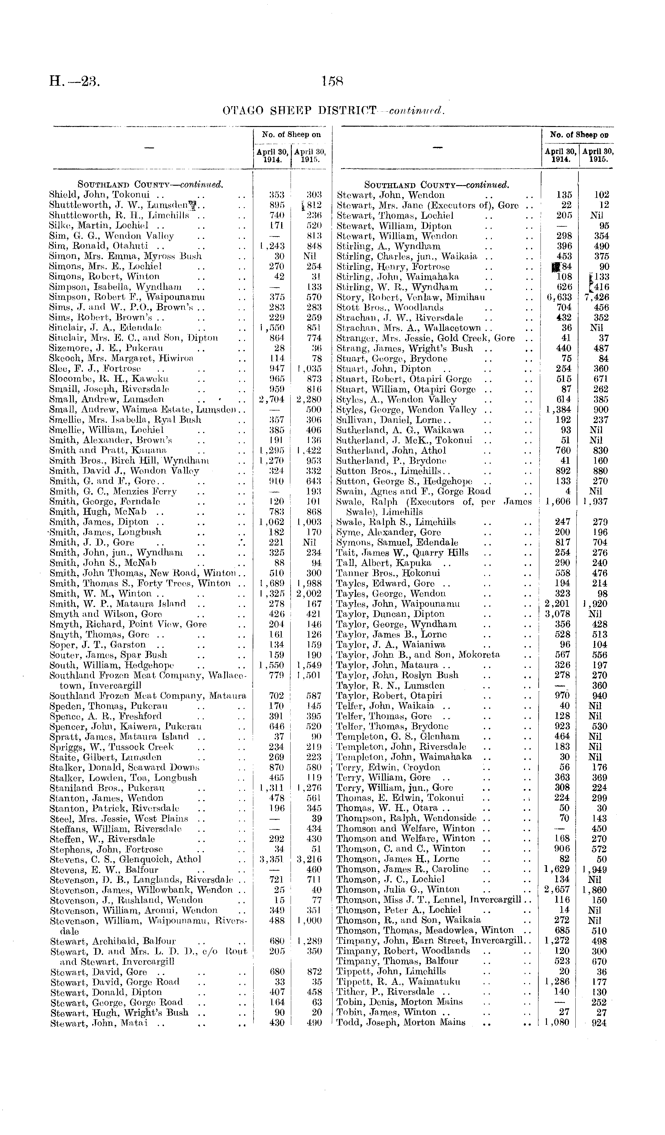 No. of Sheep od April 30, April 30, 1914. 1915. Southland Couxty—continued. [ Stewart, John, Wondon .. .. 135 102 Stewart, Mrs. Jane (Executors of), Gore .. 22 12 Stewart, Thomas, Lochiel .. .. I 205 Nil Stewart, William, Dipton . . .. I — 95 Stewart, William, Wendon . . .. j 298 354 Stirling, A., Wyndham .. .. I 396 490 Stirling, Charles, jun., Waikaia .. .. ! 453 375 Stirling, Henry, Fortrose .. . . $j| 84 90 Stirling, John, Waimahaka . . .. 108 E133 Stirling, W. R., Wyndham .. .. I 626 Story, Robert, Venlaw, Mimihau .. 6,633 7,426 Stott Bros., Woodlands .. .. 704 456 Straohan, J. W., Riversdale .. .. 432 352 Straehan, Mrs. A., Wallacetown . . .. 36 Nil Stranger, Mrs. Jessie, Gold Creek, Gore .. ! 41 37 Strang, James, Wright's Bush .. .. 440 487 Stuart, George, Brydone .. .. 75 84 Stuart, John, Dipton . . .. .. . 254 360 Stuart, Robert, Otapiri Gorge .. . . 515 671 Stuart, William, Otapiri Gorge .. .. 87 262 Styles, A., Wendon Valley .. .. 614 385 Styles, George, Wendon Valley .. .. 1,384 900 Sullivan, Daniel, Lome.. .. .. 192 237 Sutherland, A. G., Waikawa .. . . 93 Nil Sutherland, J. MeK., Tokonui .. . . 51 Nil Sutherland, John, Athol . . . . 760 830 Sutherland, P., Brydone .. .. ; 41 160 Sutton Bros., Limehills.. .. ..I 892 880 Sutton, George S., Hedgehope .. .. 133 270 Swain, Agnes and P., Gorge Road . . I 4 Nil Swale, Ralph (Executors of, per James 1 1,606 I , 937 Swale), Limehills i Swale, Ralph S., Limehills .. .. | 247 279 Syme, Alexander, Gore .. .. ! 200 196 Symons, Samuel, Edendale .. .. 817 704 Tait, James W., Quarry Hills .. .. 254 276 Tall, Albert, Kapuka .. .. .. j 290 240 Tanner Bros., Hokonui . . .. I 558 476 Tayles, Edward, Gore .. . . .. 194 214 Tayles, George, Wendon .. .. 323 98 Tayles, John, Waipounamu .. .. 2,201 1,920 Taylor, Duncan, Dipton .. .. 3,078 Nil Taylor, George, Wyndham .. ... 356 428 Taylor, James B., Lorne .. .. 528 513 Taylor, J. A., Waianiwa .. .. 96 104 Taylor, John B., and Son, Mokoreta .. ! 567 556 Taylor, John, Mataura .. . . .. 326 197 Taylor, John, Roslyn Bush .. .. 278 270 Taylor, R. N., Lumsden .. .. — 360 Taylor, Robert, Otapiri . . .. 970 940 Teifer, John, Waikaia .. .. .. 40 Nil Telfer, Thomas, Gore .. .. .. 128 Nil Teifer, Thomas, Brydone .. .. 923 530 Temple ton, G. S., Glenham .. .. 464 Nil Templeton, John, Riversdale .. .. 183 Nil Templeton, John, Waimahaka .. .. 30 Nil Terry, Edwin, Oroydon .. .. 56 176 Terry, William, Gore .. .. .. 363 369 Terry, William, jun., Gore .. .. 308 224 Thomas, E. Edwin, Tokonui .. . i 224 299 Thomas, W. H., Otara .. .. .. 50 30 Thompson, Ralph, Wendonside .. .. 70 143 Thomson and Welfare, Winton .. .. — 450 Thomson and Welfare, Winton .. .. 168 270 Thomson, C. and C., Winton .. .. 906 572 Thomson, James H., Lorne .. .. 82 50 Thomson, James R., Caroline .. .. 1,629 1,949 Thomson, J. C., Lochiel .. .. 134 Nil Thomson, Julia G., Winton .. .. 2,657 1,860 Thomson, Miss J. T., Lennel, Invercargill.. 116 150 Thomson, Peter A., Lochiel .. .. 14 Nil Thomson, R., and Son, Waikaia .. 272 Nil Thomson, Thomas, Meadowlea, Winton .. 685 510 Timpany, John, Earn Street, Invercargill. . 1,272 498 Timpany, Robert, Woodlands .. .. 120 300 Timpany, Thomas, Balfour .. .. 523 670 Tippett, John, Limehills .. .. 20 36 Tippett, R. A., Waimatuku . . . . 1,286 177 Tither, P., Riversdale .. .. .. 140 130 Tobin, Denis, Morton Mains .. . . — 252 Tobin, James, Winton .. .. . . 27 27 Todd, Joseph, Morton Mains .. .. 1,080 924