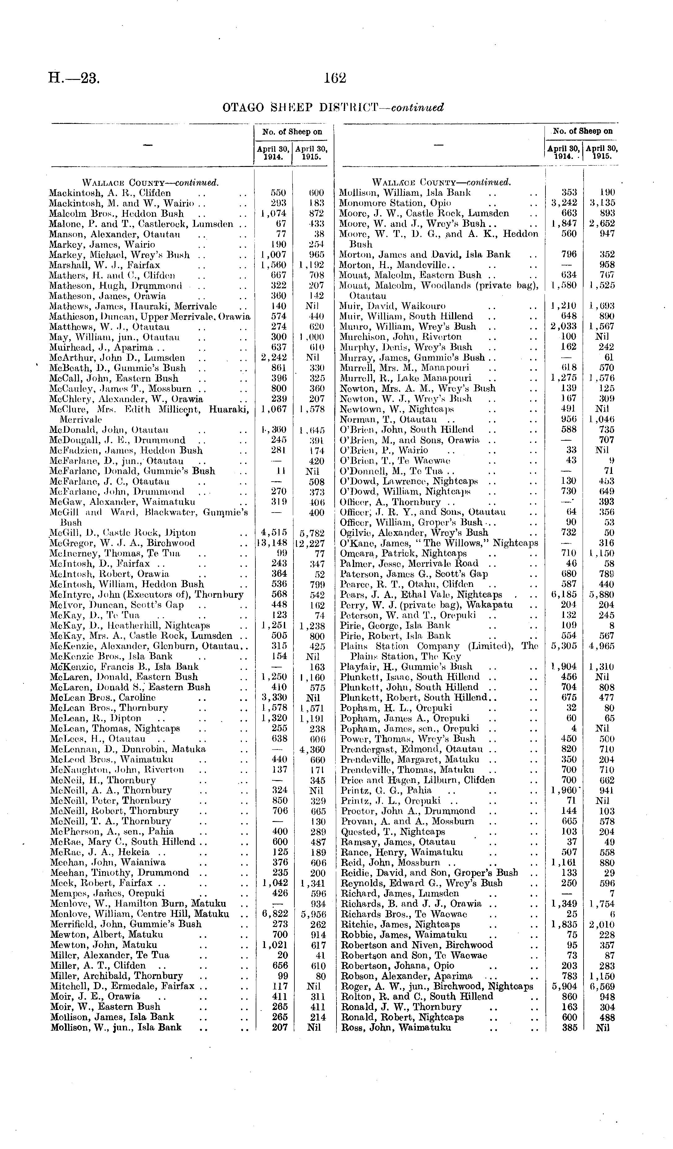 No. of Sheep on April 30, April 30, 1914. 1915. Wallace County—continued. Mackintosh, A. R., Clifden . . .. 550 600 Mackintosh, M. and W., Wairio .. .. 293 183 Malcolm Bros., Heddon Bush .. 1,074 872 Malone, P. and T., Castlerock, Lumsden .. 67 133 Manson, Alexander, Otautau .. .. ! 77 38 Markey, James, Wairio .. .. 190 254 Markey, Michael, Wrey's Bush . . 1,007 965 Marshall, W. J., Fairfax .. .. 1,560 1,192 Mathers, 11. and C„ Clifden .. . . 667 708 Matheson, Hugh, Drummond .. .. 322 207 Matheson, James, Orawia . . .. 360 142 Mathews, James, Hauraki, Merrivale .. 140 Nil Mathieson, Duncan, Upper Merrivale, Orawia 574 440 Matthews, W. J., Otautau . . . . 274 620 May, William, jun., Otautau .. . . 300 I ,000 Muirhead, J., Aparima .. .. . . 637 610 McArthur, John D., Lumsden 2,242 Nil McBeath, D., Gummie's Bush . . . . 861 330 McCall, John, Eastern Bush .. .. 396 325 McCauley, James T., Mossburn .. .. 800 360 McChlery, Alexander, W., Orawia . . 239 207 McClure, Mrs. Edith Millicent, Huaraki, 1,067 1,578 Merrivale McDonald, John, Otautau .. .. 1,360 1,645 McDougall, J. E., Drummond . . . . 245 391 MeFadzien, James, Heddon Bush .. 281 174 McFarlane, D., jun.,' Otautau .. .. — 420 McFarlane, Donald, Gummie's Bush . . II Nil McFarlane, J. C., Otautau .. .. — 508 McFarlane, John, Drummond .. .. 270 373 McGaw, Alexander, Waimatuku .. 319 406 McGill and Ward, Blaekwater, Gunjmie's — 400 Bush McGill, D., Castle Rock, Dipton .. 4,515 5,782 McGregor, W. J. A., Birchwood .. 13,148 1.2,227 Mclnerney, Thomas, Te Tua .. .. 99 77 Mcintosh, D., Fairfax . . .. .. 243 347 Mcintosh, Robert, Orawia .. .. 364 52 Mcintosh, William, Heddon Bush .. 536 799 Mclntyre, John (Executors of), Thornbury 568 542 Mclvor, Duncan, Scott's Gap .. .. 448 162 McKay, D., Te Tua .. .. .. 123 74 McKay, D., Heatherhill, Nightcaps .. 1,251 1,238 McKay, Mrs. A., Castle Rock, Lumsden .. 505 800 McKenzie, Alexander, Glenburn, Otautau.. 3.15 425 McKenzie Bros., Isla Bank . . .. 154 Nil McKenzie, Francis B., Isla Bank .. — 163 McLaren, Donald, Eastern Bush .. 1,250 1,160 McLaren, Donald S.,' Eastern Bush .. 410 575 McLean Bros., Caroline .. .. 3,330 Nil McLean Bros., Thornbury ... .. 1,578 1,571 McLean, R., Dipton .. 1,320 1,191 McLean, Thomas, Nightcaps .. . . 255 238 McLees, H., Otautau .. .. .. 638 606 McLennan, D., Dunrobin, Matuka .. — 4,360 McLeod Bros., Waimatuku .. .. 440 660 McNaughton, John, Riverton .. .. 137 171 McNeii, H., Thornbury .. .. — 345 McNeill, A. A., Thornbury .. .. 324 Nil McNeill, Peter, Thornbury .. .. 850 329 McNeill, Robert, Thornbury .. .. 706 665 McNeill, T. A., Thornbury .. .. — 130 McPherson, A., sen., Pahia .. .. 400 289 McRae, Mary C., South Hillend .. .. 600 487 McRae, J. A., Hekeia .. .. .. 125 189 Meehan, John, Waianiwa .. .. 376 606 Meehan, Timothy, Drummond .. .. 235 200 Meek, Robert, Fairfax .. .. 1,042 1,341 Mempes, Jaihes, Orepuki .. . . 426 596 Menlove, W., Hamilton Burn, Matuku .. ; — 934 Monlove, William, Centre Hill, Matuku .. 6,822 5,956 Merrifield, John, Gummie's Bush .. 273 262 Mewton, Albert, Matuku .. .. 700 914 Mewton, John, Matuku .. .. 1,021 617 Miller, Alexander, Te Tua .. .. 20 41 Miller, A. T., Clifden .. .. .. 656 610 Miller, Archibald, Thornbury .. .. 99 80 Mitchell, D., Ermedale, Fairfax .. .. 117 Nil Moir, J. E., Orawia .. .. .. 411 311 Moir, W., Eastern Bush .. .. 265 411 Mollison, James, Isla Bank .. .. 265 214 Mollison, W., jun., Isla Bank .. .. 207 Nil
