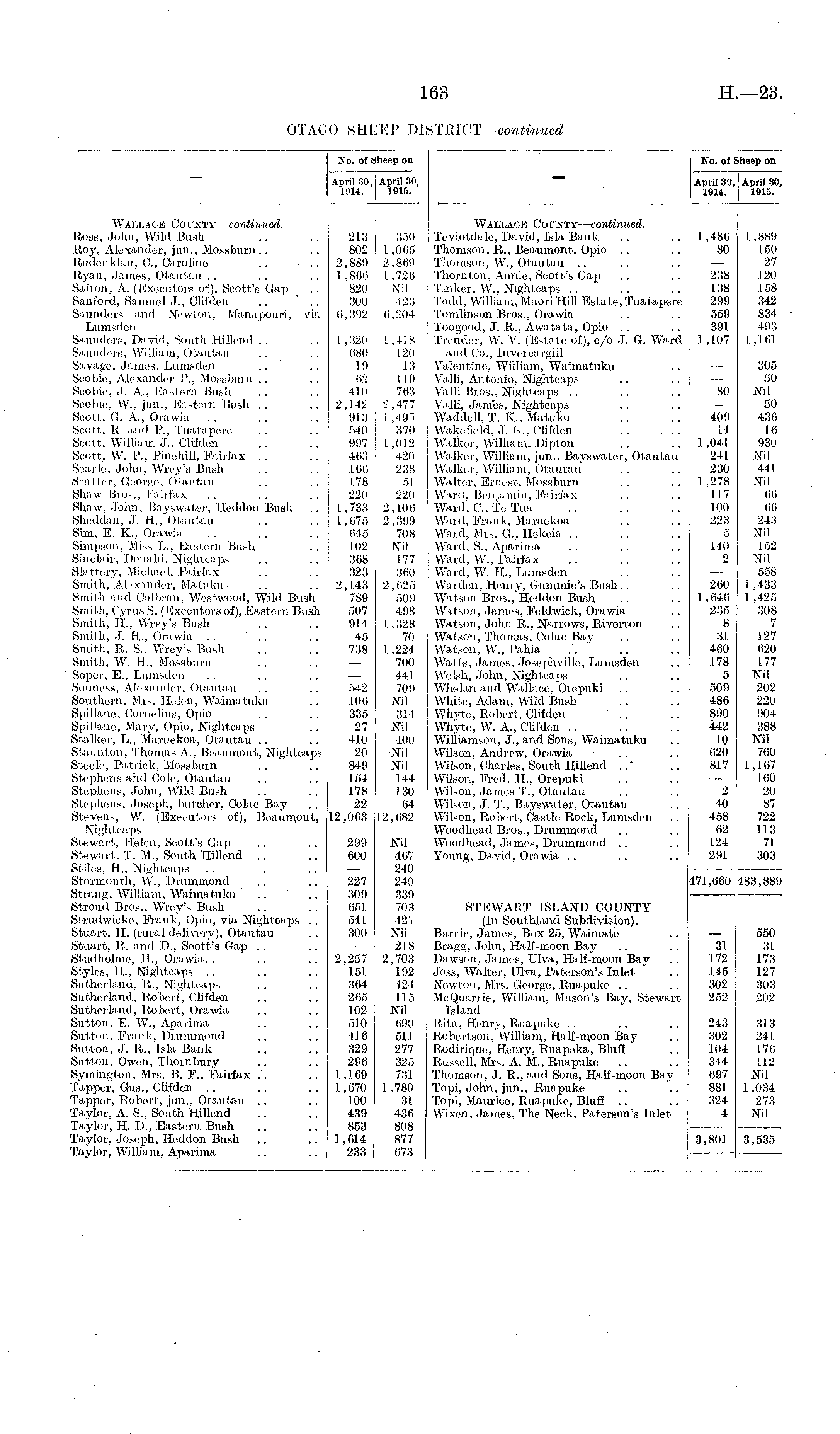 No. of Sheep oil April 30, April 30, 1914. 1915. Wallace County—continued. Teviotdale, David, Isla Bank .. .. .1,480 1,88!) Thomson, R., Beaumont, Opio .. .. 80 150 Thomson, W., Otautau .. .. .. — 27 Thornton, Annie, Scott's Gap .. .. 238 .120 Tinker, W., Nightcaps .. .. .. 138 .158 Todd. William, Maori Hill Estate, Tuatapere 299 342 Tomlinson Bros., Orawia . . .. 559 834 Toogood, J. R., Awatata, Opio . . .. 391 493 Trender, W. V. (Estate of), c/o J. G. Ward 1,1.07 .1,1(51 and Co., Invercargill Valentine, William, Waimatuku .. — 305 Valli, Antonio, Nightcaps .. .. — 50 Valli Bros., Nightcaps . . .. .. 80 Nil Valli, James, Nightcaps .. .. — 50 Waddell, T. K., Matuku .. .. 409 436 Wakefield, J. G., Clifden .. .. .14 16 Walker, William, Dipton .. 1,041 930 Walker, William, jun., Bayswater, Otautau 241 Nil Walker, William, Otautau .. .. 230 441. Walter, Ernest, Mossburn .. 1,278 Nil Ward, Benjamin, Fairfax .. .. 117 66 Ward, C., Te Tua .. .. .. 100 66 Ward, Frank, Maraekoa .. .. 223 243 Ward, Mrs. G., Hekeia .. .. .. 5 Nil Ward, S„ Aparima .. .. .. 140 152 Ward, W., Fairfax .. .. .. 2 Nil Ward, W. H., Lumsden .. .. — 558 Warden, Henry, Gummie's Bush.. .. 260 1,433 Watson Bros., Hcddon Bush .. .. 1,646 1,425 Watson, James, Feldwick, Orawia .. 235 308 Watson, John R., Narrows, Riverton .. 8 7 Watson, Thomas, Colac Bay .. .. 31 1.27 Watson, W., Pahia .. .. 460 620 Watts, James, Josephville, Lumsden .. .1.78 177 Welsh, John, Nightcaps .. .. 5 Nil Whelan and Wallace, Orepuki .. .. 509 202 White, Adam, Wild Bush .. .. 486 220 Whyte, Robert, Clifden .. .. 890 904 Why te, W. A., Clifden .. .. .. 442 388 Williamson, J., and Sons, Waimatuku .. 1Q Nil Wilson, Andrew, Orawia .. .. 620 760 Wilson, Charles, South Hillend .. 817 1,167 Wilson, Fred. H., Orepuki .. .. — UiO Wilson, James T., Otautau . . .. 2 20 Wilson, J. T., Bayswater, Otautau .. 40 87 Wilson, Robert, Castle Rock, Lumsden .. 458 722 Woodhead Bros., Drummond .. .. 62 113 Woodhead, James, Drummond .. .. 124 71 Young, David, Orawia .. . . .. 291 303 471,660 483,889 Stewart island county (In Southland Subdivision). Barrie, James, Box 25, Waimate . . — 550 Bragg, John, Half-moon Bay .. .. 31 31 Dawson, James, Ulva, Half-moon Bay .. 172 173 Joss, Walter, Ulva, Paterson's Inlet .. 145 127 Newton, Mrs. George, Ruapuke .. .. 302 303 McQuarrie, William, Mason's Bay, Stewart 252 202 Island Rita, Henry, Ruapuke .. .. .. 243 313 Robertson, William, Half-moon Bay .. 302 241 Rodirique, Henry, Ruapeka, Bluff .. 104 176 Russell, Mrs. A. M, Ruapuke .. .. 344 112 Thomson, J. R., and Sons, Half-moon Bay 697 Nil Topi, John, jun., Ruapuke .. .. 881 1,034 Topi, Maurice, Ruapuke, Bluff .. .. 324 273 Wixen, James, The Neck, Paterson's Inlet 4 Nil 3,801 3,535