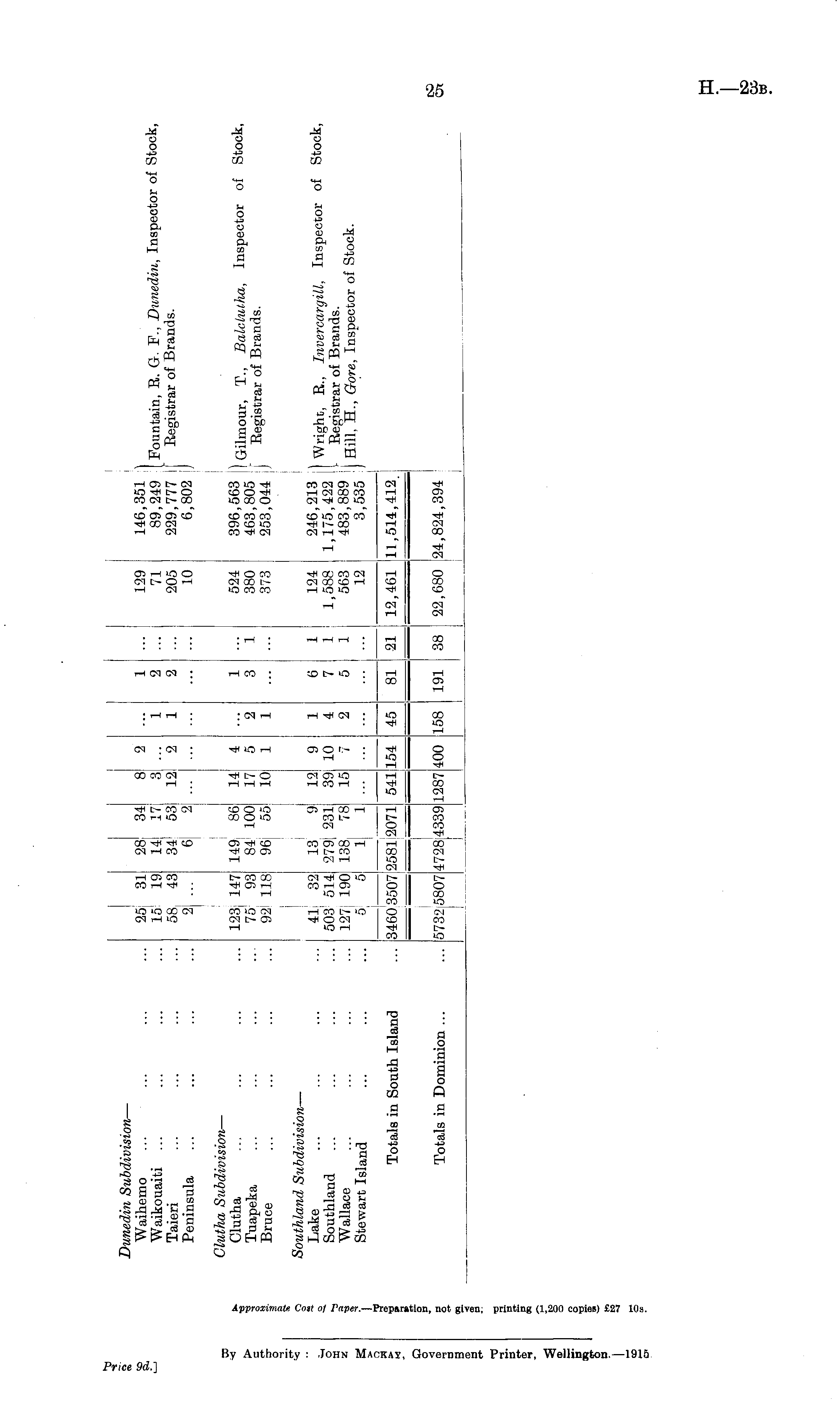 Dunedin Subdivision — Waihemo Waikouaiti ... Taieri Peninsula 25 31 15 19 58 43 2 ... 28 14 34 6 34 17 53 2 8 3 12 2 2 1 1 1 2 2 129 71 205 10 146,351 ) 89,249 I Fountain, R. G. F., Dunedin, Inspector of Stocl 229, 777 Registrar of Brands. 6,802 - Clutha Subdivision — Clutha Tuapeka Bruce I 123 147 75 93 92 118 14=91 86 84 100 96; 55 14 17 10 5 1 2 1 1 3 i 524 380 373 . ) Gi i mour; T) Balclutha, Inspector of Stocl akor\A°A I Registrar of Brands. 253,044 ) " Southland Subdivision — Lake Southland W T allace Stewart Island 41 32 503 514 127; 190 5j 5 13 9 279: 231 138: 78 25812071 12 39 15 9 10 7 1 4 2 6 7 5 1 1 1 124 1,588 563 12 ) Wright, R., Invercargill, Inspector of Stocl Iqq'bqq - Registrar of Brands. I Hill, H., Gore, Inspector of Stock. Totals in South Island 3460 3507 1 541 154 45 81 21 12,461 11,514,412 Totals in Dominion ... 5732:5807 4728 t 4339 1287 400 158 24,824,394 191 38 22,680 I