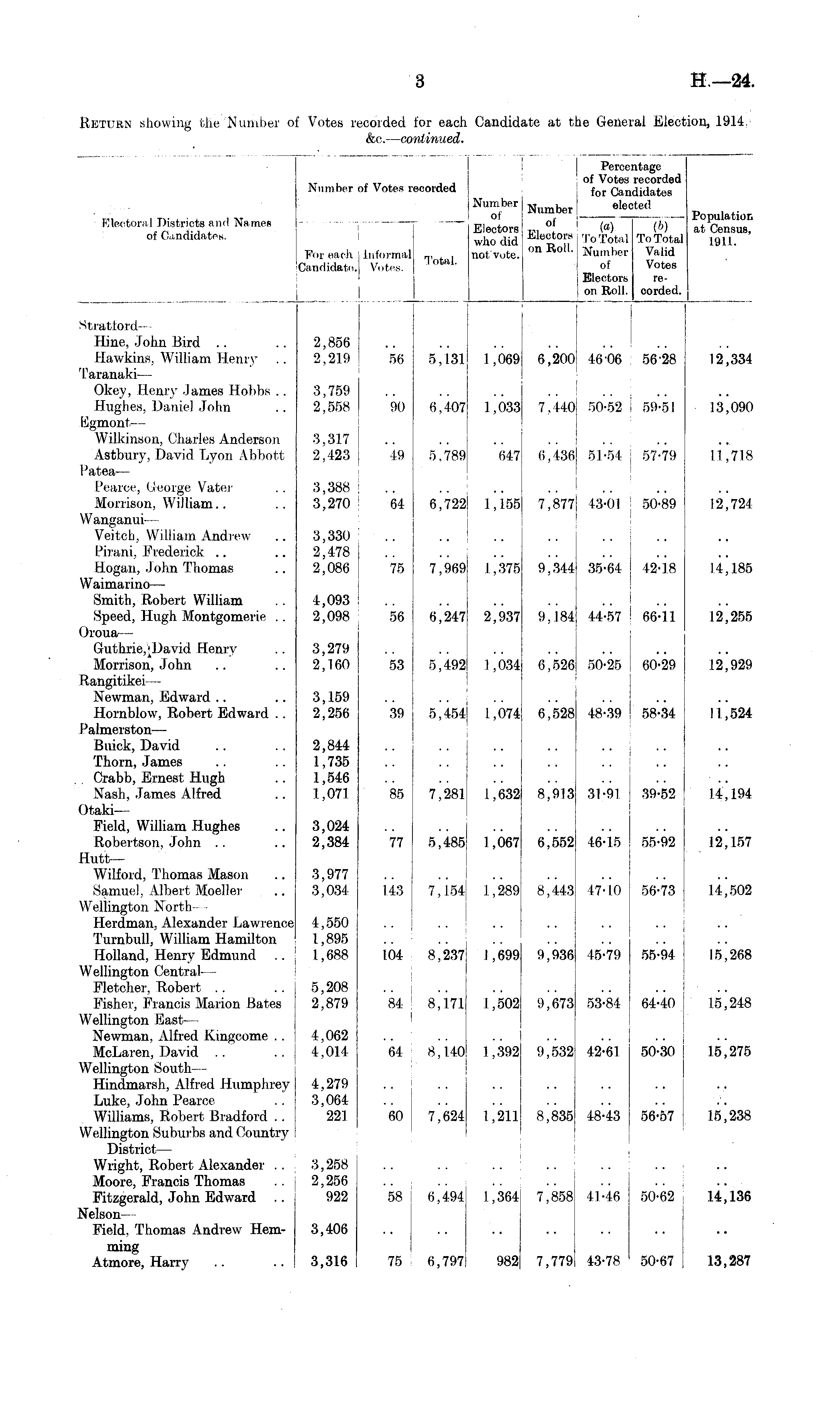 Number of Votes r ecorded Percei of Votes for Cam elec ntage recorded didates rted Electoral Districts and Names of Candidates. ! ] Number of Electors who did not vote. Number of Electors on Roll. " («) To Total Number of i Electors on Roll. w To Total Valid Votes Population at Census, 1911. j For each j Informal Candidate. Votes. Total. recorded. Stratford— Hine, John Bird Hawkins, William. Henry Taranaki — Okey, Henry James Hobbs .. Hughes, Daniel John Kgmont — Wilkinson, Charles Anderson Astbury, David Lyon Abbott Patea— Pearce, George Vater Morrison, William.. Wanganui— Veitch, William Andrew Pirani, Frederick Hogan, John Thomas Waimarino — Smith, Robert William Speed, Hugh Montgomerie .. Oroua — Henry Morrison, John Rangitikei— Newman, Edward Hornblow, Robert Edward . . Palmerston — Buick, David Thorn, James . Crabb, Ernest Hugh Nash, James Alfred Otaki— Field, William Hughes Robertson, John Hutt— Wilford, Thomas Mason Samuel, Albert Moeller Wellington NorthHerdman, Alexander Lawrence Turnbull, William Hamilton Holland, Henry Edmund .. Wellington Central — Fletcher, Robert Fisher, Francis Marion Bates Wellington East — Newman, Alfred Kmgcome .. McLaren, David Wellington South — Hindmarsh, Alfred Humphrey Luke, John Pearce Williams, Robert Bradford .. Wellington Suburbs and Country District — Wright, Robert Alexander . . Moore, Francis Thomas Fitzgerald, John Edward .. Nelson—Field, Thomas Andrew Hemming Atmore, Harry 2,856 2,219 56 3,759 2,558 90 3,317 2,423 49 I 3,388 j .. 3,270 j 64 3,330 2,478 2,086 75 4,093 2,098 ' 56 3,279 2,160 53 3,159 2,256 39 2,844 1,735 1,546 1,071 85 56 90 49 64 75 56 53 39 85 5,131 6,407 5.789 6,722 7,969 6,247 5,492 5,454 7,281 1,069 1,033 647 1,155 1,375 2,937 1,034 1,074 1,632 6,200 7,440 6,436 7,877 9,344 9,184 6,526 6,528 8,913 46-06 56 28 50-52 ! 59-51 5.1-54 57-79 13-01 ; 50-89 35-64 j 42-18 44-57 ! 66-11 50-25 60-29 48-39 58-34 .. 31-91 | 39-52 12,334 13,090 11,718 12,724 14/185 12,255 12^929 11,524 14,194 3,024 2,384 77 77 5,485 1,067 6,552 46-15 55-92 12,157 3,977 3,034 143 143 7,154 .1,289 8,443 17-10 56-73 14,502 4,550 1,895 1,688 104 104 8,237 l,699| 9,936 45-79 55-94 15,268 5,208 2,879 84 84 j 8,171 1,502 9,673 53-84 64-40 15/248 I 4,062 4,014 64 64 ; 8,140 1,392 9,532 42-61 50-30 15,275 4,279 3,064 221 60 60 7,624 1,211 8,835 48-43 56-57 1.5^238 3,258 2,256 922 58 58 75 I 6,494 6,797 1,364 982 14,136 7,858 11-46 50-62 3,406 3,316 75 7,779 43-78 50-67 13,287