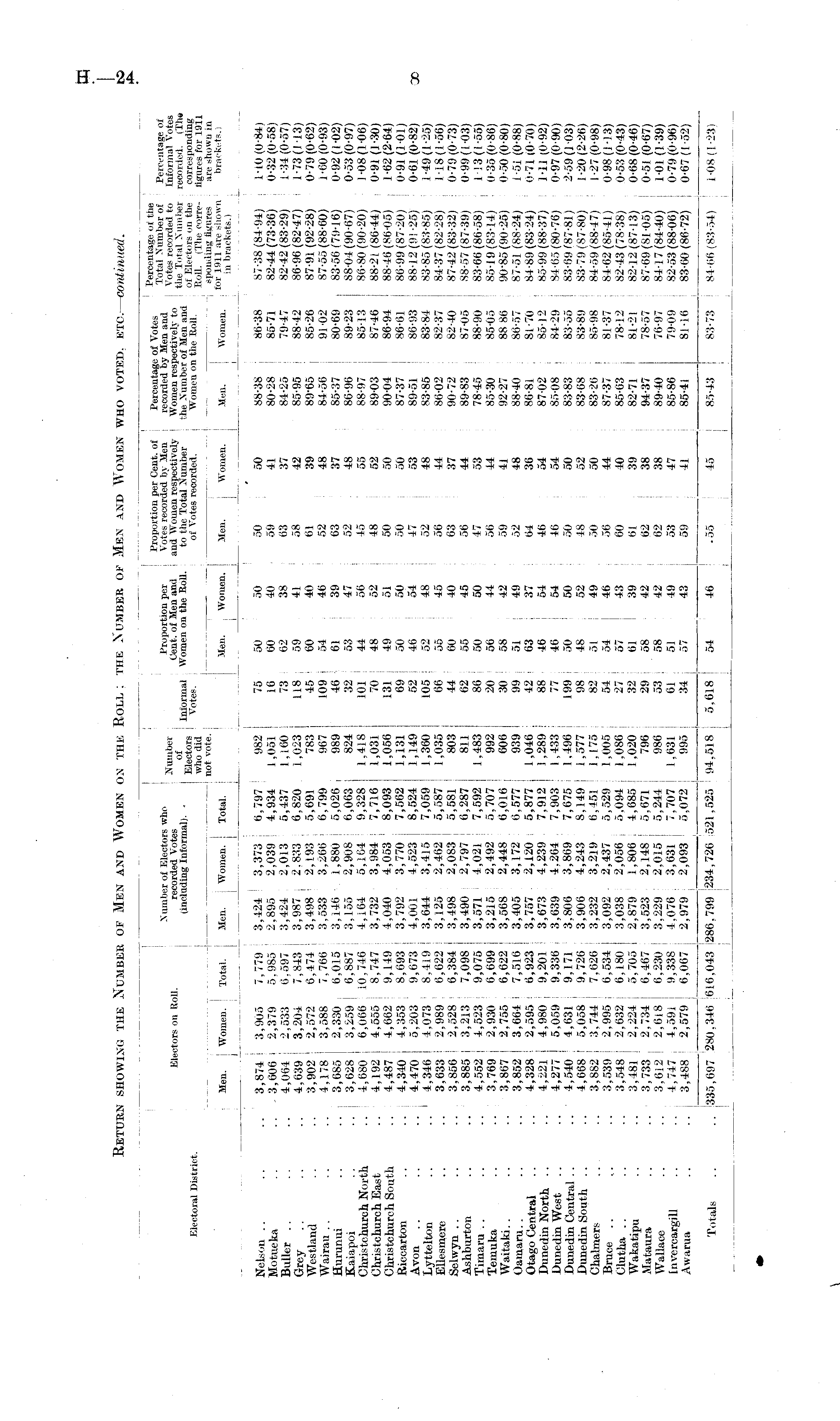 Electoral District. Nelson Motueka Buller Grey Westland Wairau Hurunui Kaiapoi Christchurch North Christchurch East Christchurch South Riecarton Avon Lyttelton Ellesmere Selwyn Ashburton Timaru Temuka Waitaki Oamaru.. Otago Central Dunedin North .. Dunedin West Dunedin Central .. Dunedin South .. Chalmers .. . Bruce Clutha Wakatipu Mataura Wallace Invercargill Awarua Proportion per Cent, of : Percentage of Votes ot the Number of Electors who w „ mK .. Proportion per i Votes recorded by Men : recorded by Men and , i™ A ~»'»« rerceiitage M Electors on Roll. recorded Votes iNumoei . Gent, ot Men and i and Women respectively ! Women respectively to votes recorded to Informal votes (including Informal). ■ _* Informal Women on the BoU. to the Total Number ; the dumber of Men and tl ! e ,., , s " ml > er recorded. (11m, Electors v t f v t „„-,,-,, Women on the Roll ot Ul ' tt,ll ' s " u th » corresponding who did; vot<!S - or votes recoraea. women on the Boll. Eoll (The corre- ! figures for 1911 . not vote. ! I spondurg tigiires are shown in Men. ! Women. ! Total. Men. j Women. Total. Men. Women. Men. Women. Men. Women. for i 1 ,?brackets')'"" bra< ' k,:tB - 3,874 3,905 7,779 3,424 ; 3,373! 6,797 982 75 50 50 50 50 88-38 86-38 87-38(84-94) 1-10(0-84) .3,606 2,379 5,985 2,895 2,039! 4,934 1,051 16 60 40 59 41 80-28 85-71 82-44(73-36) I 0-32(0-58) 4,064 2,533 6,597 , 3,424 . 2,013 5,437 1,160 73 62 38 63 37 84-25 79-47 82-42(83-29) : 1-34(0-57) 4,639 3,204 7,843 | 3,987 , 2.833 6,820 1,023 118 : 59 41 58 42 85-95 88-42 86-96(82-47) | 1-73(1-13) 3,902 2,572 6,474; 3,498 2,193 5,691 783 45 60 40 61 39 89'65 85-26 87-91(92-28) 0-79(0-62) 4,178 3,588 7,766 3,533 3,266 6,799 967 109 54 46 52 48 84-56 91-02 87-55(88-60) 1-60(0-93) 3,685 2,330; 6,015. 3,146 1,880 j 5,026, 989 46 61 39 63 37 85-37 80-69 83-56(79-16) 0-92(1-02) 3,628 3,259! 6,887 3,155 2,908! 6,063; 824 32 53 47 52 48 86-96 89-23 SS-04(90-67) 0-53(0-97) 4,680 6,066 i0,746 4,164 5,164; 9,328 1,418 101 ! 44 56 45 55 88-97 85-13 86-80(90-20) 1-08(1-06) 4,192 4,555 8,747! 3,732 3,984! 7,716 1,031 70 48 52 48 52 89-03 87-46 88-21(86-44) ; 0-91(1-30) 4,487 4,662 9,149 4,040 4,053 8,093 1,056 131 ; 49 51 50 50 90-04 86-94 88-46(86-05) ; 1-62(2-64) 4,340 4,353 8,693! 3,792 3,770 7,562 1,131 69 50 50 50 50 87-37 86-61 86-99(87-20) ! 0-91(1-01) j 4,470 5,203 9,673: 4,001 4,523 8,524 1,149 52. 46 54 47 53 89-51 86-93 88-12(91-25) 0-61(0-82) .. ' 4,346 4,073 8,419 I 3,644 3,415 7,059 1,360 105 52 48 52 48 83-85 83-84 83-85(83-85) ! (-49(1-25) 3,633 2,989 6,622: 3,125 2,462 5,587! 1.035 66 55 45 56 44 86-02 , 82-37 84-37(82-28) : 1-18(1-56) 3,856 2,528 6,384! 3,498 2,083: 5,581 ; 803 44 60 40 63 37 90-72 : 82-40 87-42(83-32) | 0-79(0-73) 3,885 3,213 7,098 ! 3,490 2,797! 6,287! 811 62 55 45 56 44 89-83 I 87-05 88-57(87-39) 0-99(1-03) 4,552 4,523 9,075; 3,571 4,021 ! 7,592 j 1,483 86 50 50 47 53 78-45 ! 88-90 ! 83-66(86-58) I I !3(i-55) 3,769 2,930 6,699! 3,215 2,492 5,707: 992 20 56 44 56 44 85-30 8505 85-19(83-14) 0-35(0-86) 3,867 2,755 6,622 3,568 2,448 606; 30 58 42 59 41 92-27 88 86 90-85(90-25) 0-50(0-80) 3,852 3,664; 7,516! 3,405 3,172 6,577! 939 < 99 51 49 o2 48 88-40 86-57 87-51(88-24) 1-51(0-88) 4,328 2,595 6,923: 3,757 2,120 5,877! 1,046, 42 63 37 64 36 86-81 81-70 84-89(83-24) 0-71(0-70) 4,22] 4,980! 9,201 3,673 4,239 7,912; 1,289 88 46 54 46 54 87-02 8512 85-99(88-37) 1-1 J (0-92) 4,277 5,059! 9,336 3,639 4,264 7,903! 1,433: 77 46 54 46 54 85-08 ! 84-29 84-65(80-76) 0-97(0-90) 4,540 4,631 9,171 3.806 3,869 7,675 1.496 199 50 50 50 50 83-83 . 83-55 2-59(1-03) 4,668! 5,058! 9,726 3,906 4,243 8,149! 1,577! 98 48 52 48 52 83-68 83-89 83-79(87-80) 1-20(2-26) 3,882 3,744 7,626 3.232 3,219 6,45! ! 1,175; 82 51 49 50 50 83-26 85-98 84-59(88-47) 1-27(0-98) 3,539 2,995, 6,534! 3,092 2,437 5,529 1,005; 54 54 46 56 44 87-37 81-37 84-62(85-41) 0-98(1-13) 3,548 2,632 6,180 j 3,038 2,056! 5,094! 1,086 27 57 43 60 40 85-63 78-12 82-43(78-38) 0-53(0-43) 3,481 2,224 5,705 1 2,879 1,806, 4,685 1,020 32 61 39 61 39 82-71 81-21 82-12(87-13) 0-68(0-46) 3,733! 2,734 6,467 3,523 2,148; 5,671 796 29 58 42 62 38 94-37 78-57 87-69(81-05) 0-51(0-67) 3,612 | 2,6i8 6,230 ! 3,229 2,015: 5,244; 986! 53, 58 42 62 38 89-40 76-97 84-17(84-40) 1-01(1-39) 4,747; 4,59i 9,338! 4,076. 3,631 j 7,707! 1,631 ! 61 51 49 53 47 85-86 79-09 , 82-53(88-06) 0-79(0-96) .. | 3,488; 2,579 6,067! 2,979 2,093 5,072 995 34; 57 43 59 41 85-41 81-16 83-60(86-72) \ 0-67(1-52) Totals 335,697 280,340 616.043 '286.799 !234, 726 521,525 : 94.518 ! 5,618 54 46 .55 45 85-43 83-73 84-66 (83-54) ' 1-08(1-23) ! ! ! i ■ I . i 46 .55 45 85-43 83-73 84-66(83-54) \ i -08 (i -23i I | | i ■ I 1 1 I I I - 1 . j