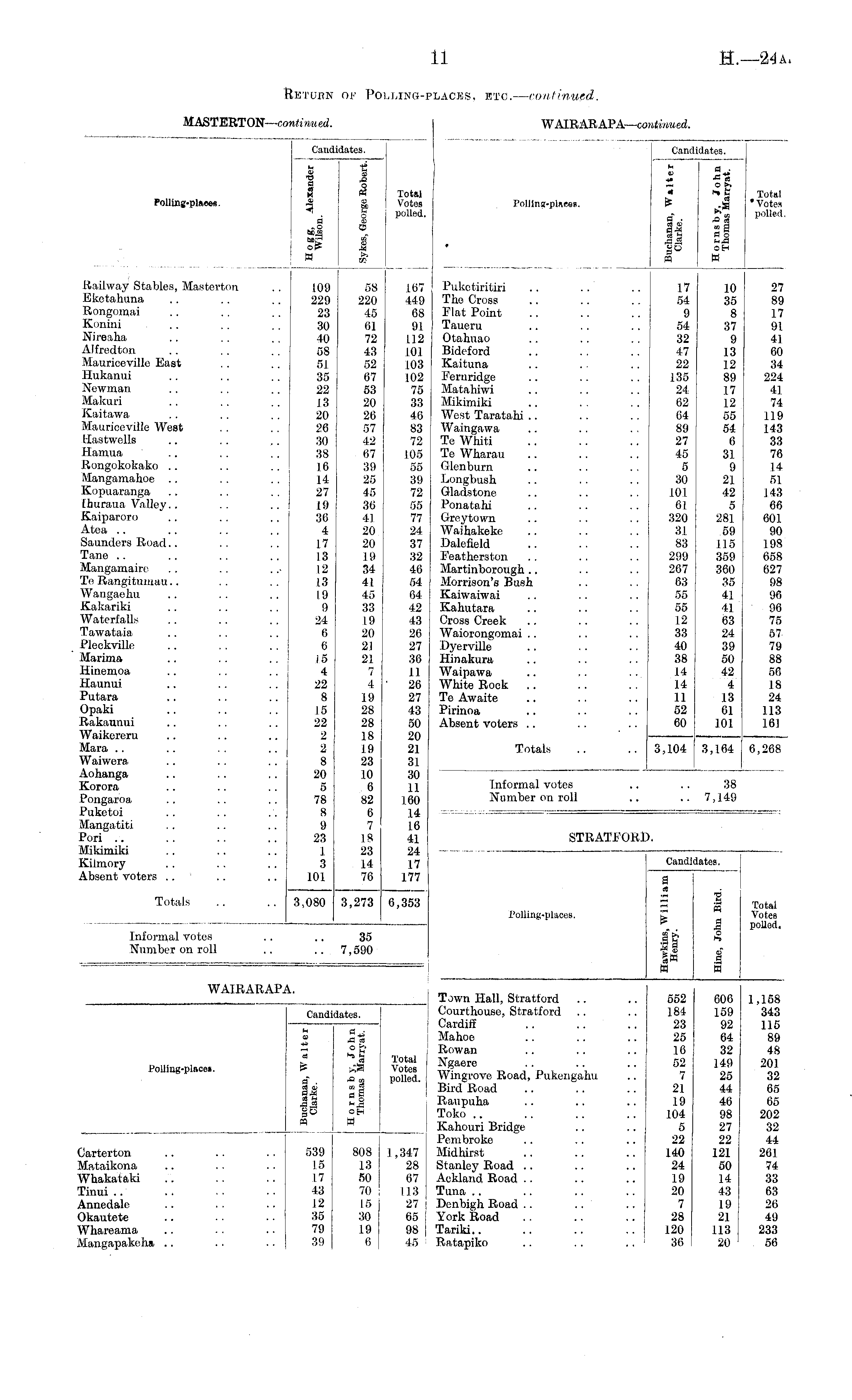 MASTERTON— co; ttinued. WAIRARAPA—co»i itiuued. Polling-plAoefi. Candii I Iates. s o SP o CD C M >> V2 Pollins-places. Candi [dates. a ■ A cj ° b r. fc a r,S "I 0 2 I. A OH B Total •Votes polled. Total Votes pulled. a .o Mg fi • a ■ II Ml go ffl Railway Stables, Masterton Ekotahuna Rongomai Konini Nireaha Alfredton Mauriceville East Hukanui Newman Makuri Kaitawa Mauriceville West Hastwells Hamuli Rongokokako Mangamahoe Kopuaranga Ihuraua Valley.. Kaiparoro Atea Saunders Road Tane Mangamaire Te Rangitumau Wangaehu Kakariki Waterfalls Tawataia Pleckville Marima Hlnemoa Haunui Putara Opaki Rakaunui Waikereru Mara Waiwera Aohanga Korora Pongaroa Puketoi Mangatiti Pori .. Mikimiki Kilmory Absent voters 109 229 23 30 40 58 51 35 22 13 20 26 30 38 16 14 27 19 36 4 17 13 12 13 19 9 24 6 6 15 4 22 8 15 22 2 2 8 20 5 78 8 9 23 I 3 101 58 220 45 61 72 43 52 67 53 20 26 57 42 67 39 25 45 36 41 20 20 19 34 41 45 33 19 20 21 21 7 4 19 28 28 18 19 23 10 0 82 6 7 18 23 14 76 167 449 68 91 112 101 103 102 75 33 46 83 72 105 55 39 72 55 77 24 37 32 46 54 64 42 43 26 27 36 11 26 27 43 50 20 21 31 30 11 160 14 16 41 24 17 177 Pukctiritiri The Cross Flat Point Taueru Otahuao Bideford Kaituna Fernridge Matahiwi Mikimiki West Taratahi Waingawa Te Whiti Te Wharau Glenburn Longbush Gladstone Ponatahi Greytown Waihakeke Dalefield Featherston Martinborough Morrison's Bush Kaiwaiwai Kahutara Cross Creek Waiorongomai Dyerville Hinakura Waipawa White Rock Te Awaite Pirinoa Absent voters 17 54 9 54 32 47 22 135 24 62 64 89 27 45 5 30 101 61 320 31 83 299 267 63 55 55 12 33 40 38 14 14 11 52 60 10 35 8 37 9 13 12 89 17 12 55 54 6 31 9 21 42 5 281 59 115 359 360 35 41 41 63 24 39 50 42 4 13 61 101 27 89 17 91 41 60 34 224 41 74 119 143 33 76 14 51 143 66 601 90 198 658 627 98 96 96 75 57 79 88 56 18 24 113 16] Totals 3,104 4 3,164 6,268 Informal votes Number on roll 38 7,149 stratfor: Candidates. Totals 3,080 3,273 0,353 Polling-places. a a In B id B I co" a 3 Total Votes polled. Informal votes Number on roll 35 7,590 WA1RARAP. Polling-places. Candii a a r* 4 ■ SS A * §5 B Iates. A dl Sa . a •*A OH B Total Votes polled. J Town Hall, Stratford .. Courthouse, Stratford j Cardiff Mahoe Rowan Ngaere Wingrove Road, Pukengahu Bird Road Raupuha Toko .. Kahouri Bridge Pembroke Midhirst Stanley Road Ackland Road Tuna Denbigh Road .. York Road I Tariki.. Ratapiko 552 184 23 25 16 52 7 2.1 .19 104 5 22 140 24 19 20 7 28 120 36 606 159 92 64 32 149 25 44 46 98 27 22 121 50 14 43 19 21 113 20 1,158 343 115 89 48 201 32 65 65 202 32 44 261 74 33 63 26 49 233 56 Jarterton Mataikona iVhakataki rinui .. Vnnedale Dkautete Vhareama tfangapakeha .. 539 15 17 43 12 35 79 39 808 1,347 13 28 50 67 70 113 15 27 30 65 19 98 6 45