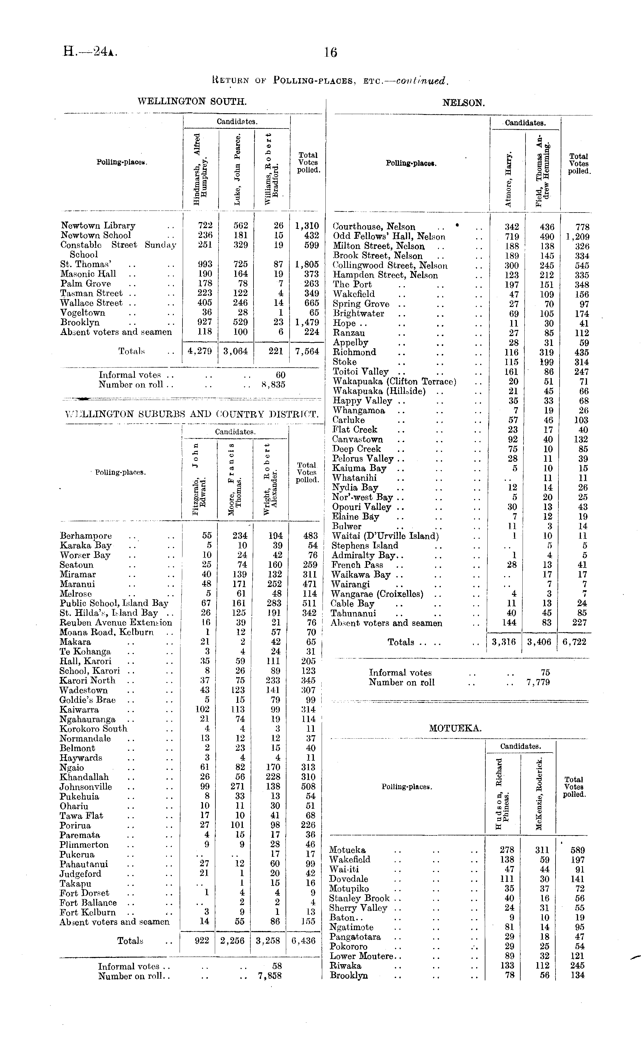 lUTH. NELSON. Jandidates. Candidates. Polling-places. •a a £ =3 a 2* Ii aB B d a a a a f o N 2 a B H O © - r> m.O as a a •— H< 5B - Total Votes polled. Polling-places. rO g B o a ""i ei a if IS gB A 3 a ID'S Total Votes polled. Newtown Library Newtown School Constable Street Sunday School St. Thomas' Masonic Hall Palm Grove Tasman Street Wallace Street Vogeltown Brooklyn Absent voters and seamen 722 236 251 562 181 329 26 15 19 1,310 432 599 Courthouse, Nelson .. * . . i 342 430 771 Odd Follows'Hall, Nelson .. 719 490 1,20! Milton Street, Nelson .. .. 188 138 321 Brook Street, Nelson .. .. 189 145 33' Oollingwood Street, Nelson .. 300 245 54/ Hampden Street, Nelson .. 123 212 33! The Port .. .. .. 197 151 34! Wakefield .. .. .. 47 109 15( Spring Grove .. .. .. 27 70 9' Brightwater .. .. .. 09 105 17< Hope.. .. .. .. 11 30 41 Ranzau .. .. .. 27 85 IE Appelby .. .. .. 28 31 5! Richmond .. .. .. HO 319 43. Stoke .. .. .. 115 199 3L Toitoi Valley .. .. .. 161 86 24', Wakapuaka (Clifton Terrace) .. 20 51 71 Wakapuaka (HilLide) .. .. 21 45 6( Happy Valley .. .. .. 35 33 OS Whangamoa .. .. .. 7 19 2f Carluke .. .. .. 57 40 10S Flat Creek .. .. .. 23 17 4t Canvastown .. .. .. 92 40 135 Deep Creek .. .. .. 75 10 8f. Pelorus Valley .... .. 28 11 3! Kaiuma Bay .. .. .. 5 10 IE Whatanihi .. .. .. .. 11 11 Nydia Bay .. .. .. 12 14 2f Nor'-west Bay .. .. .. 5 20 2.1 Opouri Valley .. .. .. 30 13 48 Elaine Bay .. . . 7 12 19 Bulwer .. .. .. 11 3 14 Waitai (D'Urville Island) .. 1 10 II Stephens Island .. . . . . 5 5 Admiralty Bay.. .. . . 1 4 6 French Pass .. .. .. 28 13 41 Waikawa Bay .. .. .. .. 17 17 Wairangi .. .. .. •. 7 7 Wangarae (Croixelles) .. .. 4 3 7 Cable Bay .. .. .. 11 13 24 Tahunanui .. .. .. 40 45 85 Absent voters and seamen .. 144 83 227 342 719 188 189 300 123 197 47 27 69 11 27 28 116 115 101 20 21 35 7 57 23 92 75 28 5 430 490 138 145 245 212 151 109 70 105 30 85 31 319 199 80 51 45 33 19 40 17 40 10 11 10 11 14 20 13 12 3 10 5 4 13 17 7 3 13 45 83 778 I ,209 326 334 545 335 348 156 97 174 41 112 59 435 314 247 71 66 68 26 103 40 132 85 39 15 11 26 25 43 19 14 II 5 5 41 17 7 24 85 227 993 190 178 223 405 36 927 118 725 164 78 122 246 28 529 100 87 19 7 4 14 1 23 6 1,805 373 263 349 665 65 1,479 224 Totals .. 4,279 3,064 221 4,279 3,064 221 | 7,564 7,564 Informal votes .. . . .. 60 Number on roll .. .. .. 8,835 WELLINGTON SUBURBS AND COUNTRY DIST roicT. Candidates. a co hj rt — H. a co ° a a Polling-places. „ 5 m %i * 3 I g rt a hj" a s,s as A.a a A o rl ii Ol'TO sm S CO a *3 ..a S H I a o . US IS Total Votes polled. Total Votes polled. 12 5 30 7 11 I MTU Hi a »S -SB §H "Z< E S r= Berhampore .. .. 55 234 194 Karaka Bay .. . . 5 10 39 Worser Bay .. .. 10 24 42 Seatoun .. .. 25 74 160 Miramar .. .. 40 139 132 Maranui .. .. 48 171 252 Melrose . . .. 5 61 48 Public School, Island Bay 67 161 283 St. Hilda's, Island Bay .. 26 125 191 Reuben Avenue Extension 16 39 21 Moana Road, Kelburn .. 1 12 57 Makara .. .. 21 2 42 TeKohanga .. .. 3 4 24 Hall, Karori .. .. 35 59 111 School, Karori .. .. 8 26 89 Karori North . . . . 37 75 233 Wadestown .. .. 43 123 141 Goldie's Brae .. .. 5 15 79 Kaiwarra .. . . 102 113 99 Ngahauranga .. . . 21 74 19 Korokoro South .. 4 4 3 Normandale .. .. 13 12 1.2 Belmont .. .. 2 23 15 Haywards .. .. 3 4 4 Ngaio . .. .. 61 82 170 Khandallah .. .. 26 56 228 Johnsonville .. .. 99 271 138 Pukehuia .. .. 8 33 13 Ohariu .. .. 10 II 30 TawaFlat .. .. 17 10 41 Porirua .. .. 27 101 98 Paremata .. .. 4 15 17 Plimmerton .. .. 9 9 28 Pukerua .. .. .. .. 17 Pahautanui .. .. 27 12 60 Judgeford .. .. 21 1 20 Takapu .. .. .. 1 15 Fort Dorset .. .. 1 4 4 Fort Ballance .. .. .. 2 2 Fort Kelburn .. .. 3 9 1 Aboent voters and seamen 14 55 86 55 5 10 25 40 48 5 67 26 16 1 21 3 35 8 37 43 5 102 21. 4 13 2 3 61 26 99 8 10 17 27 4 9 234 10 24 74 139 171 61 161 125 39 12 2 4 59 26 75 123 15 113 74 4 12 23 4 82 56 271 33 II 10 101 15 9 194 39 42 100 132 252 48 283 191 21 57 42 24 111 89 233 141 79 99 19 3 12 15 4 170 228 138 13 30 41 98 17 28 17 60 20 15 4 2 1 86 483 ; 54 76 259 j 311 471 I 114 511 342 76 70 65 | 31 I 205 123 345 307 99 314 114 11 37 40 11 313 310 508 54 51 68 226 36 46 17 99 42 16 9 4 13 155 483 54 76 259 311 471 114 511 342 76 70 65 31 205 123 345 307 99 314 114 11 37 40 11 313 310 508 54 51 68 226 30 40 17 99 42 16 9 4 13 155 Totals .... .. 3,310 3,400 0,722 i i Informal votes .. .. 75 Number on roll .. .. 7,779 MOTUEKA. 3,316 1 28 4 11 40 144 3,400 6,722 Candidates. £ cj 5 .S — CO 3 -g Total Polling-places. R % Votes 1 o 3 M ■~> a •a Q B a ■1 v a Total Votes polled. a" co o £ co a «S 3d, B 27 21 1 3 14 12 1 1 4 2 9 55 Motueka Wakefield Wai-iti Dovcdale Motupiko Stanley Brook .. Sherry Valley .. Baton.. Ngatimote Pangatotara Pokororo Lower Moutere.. Riwaka Brooklyn 278 138 47 111 35 40 24 9 81 29 29 89 133 78 311 59 44 30 37 16 31 10 14 18 25 32 112 56 589 197 91 141 72 56 55 19 95 47 54 121 245 134 Totals 922 2,256 3,258 0,430 Informal votes .. Number on roll.. 58 7,858