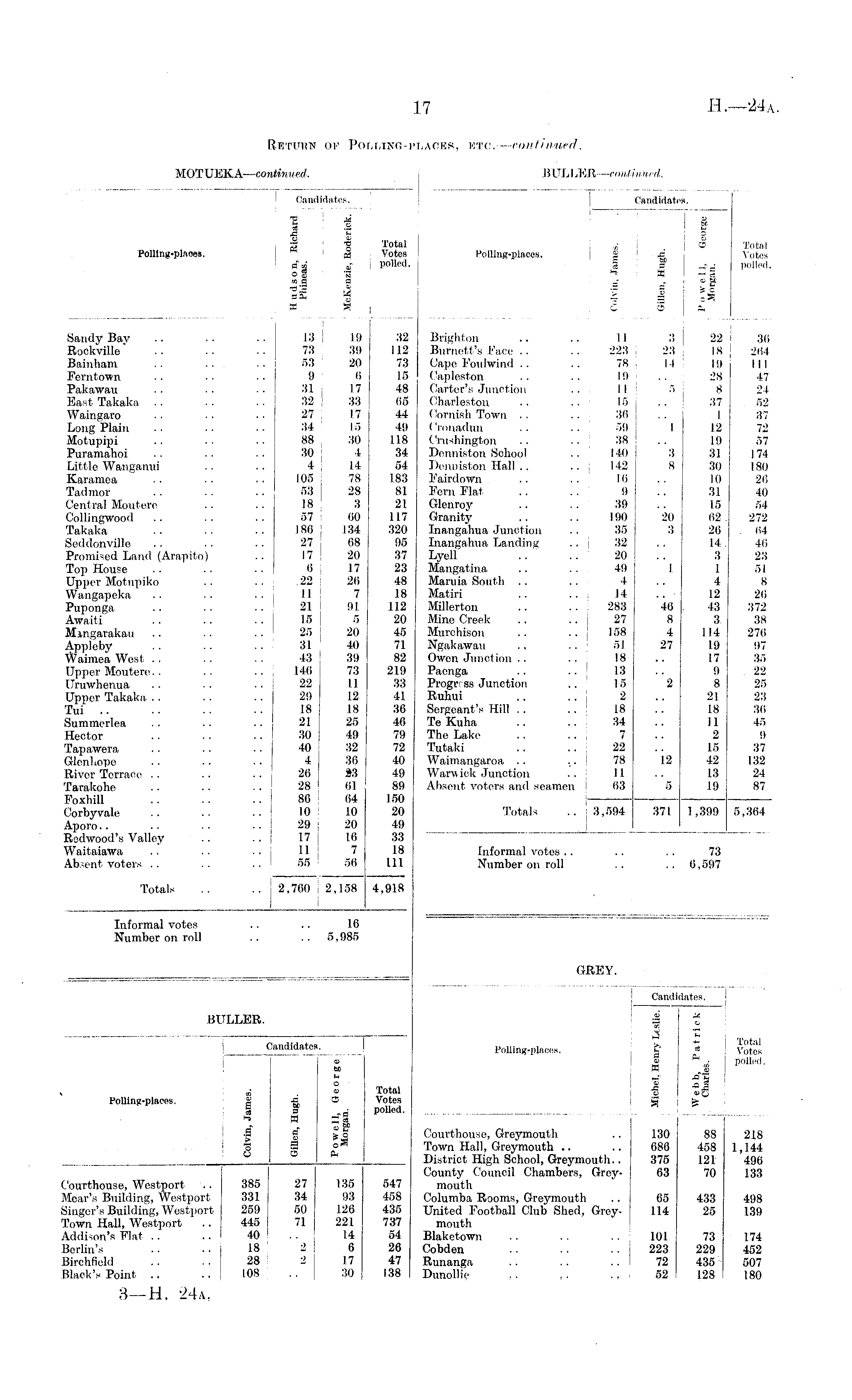 MOT UEKA— contin n ed, BULLER— continued. vn Candidates. Candidates .a s. ■g ii o a g -a Total Polling-plaoes. & Votes rioj „- i POUed. °s a Is I a or a a es 'O Polling-places. 2 a I | a' a' Z '5 — a a g ''A - S Total Votes polled. Sandy Bav •• •• •■ 13 19 32 Rockville .. . . .. 73 39 112 Bainham . . 53 20 73 Ferntown .. . . .. 9 6 15 Pakawau .. ■• •• 31 17 48 East Takaka . . . . . . 32 33 05 Waingaro . • • ■ 27 ; 17 44 Long Plain . . .. • • 34 16 49 Motupipi .. •• •• 88 30 118 Puramahoi . . . . ■ . 30 j 4 34 Little Wanganui . . . . 4 i 14 54 Karamea .. .. . . 105 ; 78 183 Tadmor . . . . .. 53 28 81 Central Moutere .. .. 18 3 21 Collingwood .. . . .. 57 ! 00 117 Takaka .. .. .. 180 j 134 320 Seddonville . . . . .. 27 j 08 95 Promised Land (Arapito) .. 17! 20 37 Top House .. . . ■ . 0 i 17 23 Upper Motupiko .. .. .22 20 48 Wangapeka . . .. .. 11 7 18 Puponga .. .. 21 91 112 Awaiti .. .. .. 15 5 20 Mangarakau .. . . .. 25 20 45 Appleby .. .. .. 31 40 71 Waimea West .. .. .. 43 39 82 Upper Moutere.. .. .. 140 73 219 Uruwhenua . . .. .. 22 II 33 Upper Takaka . . . . .. 29 12 41 Tui .. .. . . ■ • 18 18 30 Summerlea . . .. .. 21 25 46 Hector . . . . .. 30 49 79 Tapawera . . . . .. 40 32 72 Glenhope .. .. .. 4 36 40 River Terrace .. .. .. 26 33 49 Tarakohe .. .'. ■■ 28 01 89 Foxhill .. .. .. 86 j 64 150 Corbyvale .. . . .. 10 | 10 20 Aporo.. .. .. .. 29 20 40 Redwood's Valley .. .. 17 16 33 Waitaiawa . . . . . . 11 7 18 Absent voters .. .. .. 55 56 111 32 112 73 15 48 05 44 49 118 34 54 183 81 21 117 320 95 37 23 48 18 112 20 45 71 82 219 33 41 30 46 79 72 40 49 89 150 20 49 33 18 111 Brighton .. .. II 3 [ Burnett's Face . . .. 223 , 23 (Jape Foulwind .. .. 78 II Capleston .. .. 19 Carter's Junction ... II 5 Charleston . . .. 15 Cornish Town . . .. 30 Cronadun .. .. 59 I Crushington ■. .. ; 38 Denniston School . . 140 3 Denniston Hall .. .. 142 8 Fairdown .. .. Hi Fern Flat .. . . 9 Glenroy .. .. 39 Granity .. .. 190 2(1 Inangahua Junction . . 35 3 Inangahua Landing .. I 32 Lyell .. .. j 20 Mangatiua .. .. i 49 I Maruia South . . .. 4 Matiri .. .. i 14 .. • Millerton .. .. 283 40 Mino Creek .. .. j 27 8 Murchison .. .. 158 4 Ngakawau .. .. i 51 27 Owen Junction .. .. 18 Paenga . . .. 13 Progress Junction .. 15 2 Ruhui .. .. 2 Sergeant's Hill . . .. ! 18 Te Kuha .. .. 34 The Lake . . .. 7 Tutaki .. .. j 22 Waimangaroa .. .. | 78 12 Warwick Junction . . : II Absent voters anil seamen ' 63 5 1 3 8 2(1 I 40 8 4 27 22 18 19 28 8 37 I 12 19 31 30 10 31 15 02. 20 14 3 1 4 12 43 3 114 19 17 9 8 21 18 II 2 15 42 13 19 30 264 III 47 21 52 87 72 57 174 180 26 40 54 272 04 40 23 51 8 20 372 38 270 97 35 22 25 23 30 45 0 37 132 24 87 2 12 5 Totals .. 3,594 371 1,399 5,364 Totals .. 3,594 Informal votes .. .. . . 73 Number on roll .. 6,507 Informal votes .. Number on roll Totals .. .. 2,760 2,158 4.918 4.918 Informal votes Number on roll 16 5.985 GREY. Candidates. BULLER. | 7J : Total PoHlng-places. : Votes j I polled. I fJ s | 8 u a Ch CO J&TC Ho Polling-places. Candidates. a be U o a Total § d o Votes a of £ I ■s a oa o a> b Courthouse, Greymouth .. 130 88 218 Town Hall, Greymouth .. .. 080 458 1,144 District High School, Greymouth.. 375 121 490 County Council Chambers, Grey- 03 70 133 mouth Columba Rooms, Greymouth .. 65 433 498 United Football Club Shed, Grey- 114 25 139 mouth Blakctown .. .. 101 73 174 Cobden .. .. 223 229 452 Runanga .. .. .. 72 435 507 Dunollie . . . . ., I 52 128 180 88 458 121 70 Oourthou.se, Westport Meal's Building, Westport Singer's Building, Westport l'own Hall, Westport Addison's Flat Berlin's . . Birohfleld Black's Point .. .. j 385 331 259 445 40 18 28 108 27 34 50 71 2 2 135 93 120 221 14 6 17 30 547 458 435 737 54 26 47 138 433 25 73 229 435 128 3—H, -24a.