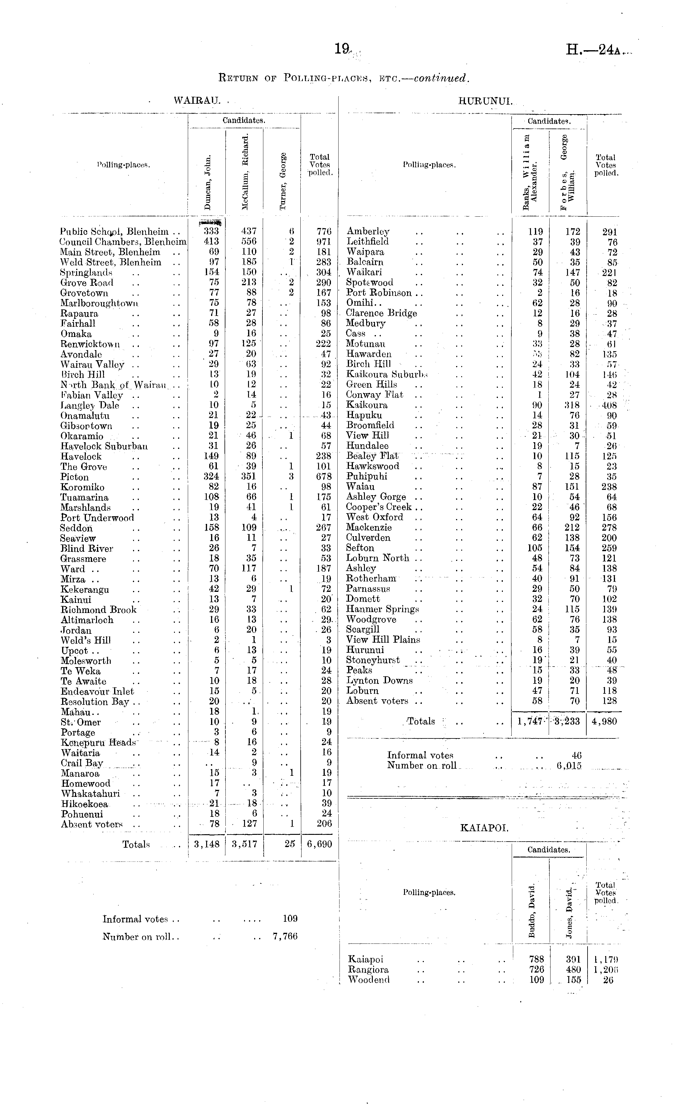 HURUNUI, i Cs Candidates. candidates i. Candidates. - I .-4 <D z c ._ r-1 ii of m x! a ■M -a ur 1 I* of B fH i 1 a a a O CO Polling-places. a H? a" a P jMJi 333 413 69 97 154 75 77 75 71 58 9 97 27 ' 29 13 10 2 10 21 19 21 31 149 61 324 82 108 19 13 158 10 20 18 70 13 42 13 29 16 6 2 6 5 7 10 15 20 18 10 3 8 14 a r% e a i a a eft Total S Votes t§ polled. ch' GO I a co CS Total Votes polled. Polling-places. Total Votes polled. P a O CO a U H ch' GO a U H Public Sohcopl, Blenheim .. Council Chambers, Blenheim Main Street, Blenheim Weld Street, Blenheim Springlands Grove Road . . Grovetown Marlboroughtown Rapaura Fairhall Omaka Renwicktown Avondale Wairau Valley Birch Hill N irth Bank of. Wairau . . Fabian Valley .. Langley Dale Onamalutu Gibson town Okaramio Havelock Suburban Havelock The Grove Picton Koromiko Tuamarina Marshlands Port Underwood Soddon Seaview Blind River Grassmere Ward Mirza Kekerangu Kainui Richmond Brook Altimarloch Jordan . . .. ■ Weld's Hill Upeot Molesworth .. Te Weka Te Awaite Endeavour Inlet Resolution Bay . . Mahau.. St. Omer .. Portage .. Kcnepuru Heads Waitaria Crail Bay Manaroa Homewood Whakatahuri Hikoekoea • . - ■■■•-.- Pohuenui Absent voters 333 413 69 07 154 75 77 75 71 58 9 97 27 ' 29 13 10 2 10 21 19 21 31 149 61 324 82 108 19 13 158 10 20 18 70 13 42 13 29 16 6 2 6 5 7 10 15 20 18 10 3 8 14 15 17 7 21 18 78 J J_ 437 556 410 1.85 150 213 88 78 27 28 16 125 20 03 19 12 14 5 22. 25 46 26 89 39 351 16 66 41 4 109 11 7 35 117 6 29 7 33 13 20 I 13 5 17 1.8 5. 1. 9 6 16 2 9 3 3 ..... 18 6 127 437 556 110 1.85 150 213 88 78 27 28 16 125 20 63 19 12 14 5 22. 25 46 26 89 39 351 16 66 41 4 109 11 7 35 117 6 29 7 33 13 20 I 13 5 17 1.8 5. 1. 9 6 16 2 9 3 6 2 2 I 6 770 2 971 2 181 1 283 .. , 304 2 290 2 107 153 98 80 ;.'■ 25 222 47 92 32 22 10 15 .. - 43 44 1 08 57 238 1 101 3 078 98 I 175 I 01 17 207 27 33 53 187 19 I 72 20 02 2920 . . 3 19 10 24 . .. 28 20 20 19 .19 9 24 '.. 10 9 1 19 ■ ;-.-■ 17 10 39 24 I 200 2 2 1 1 3 I I 770 971 181 283 , 304 290 107 153 98 80 25 222 47 92 32 22 ■ 10 15 43 44 08 57 238 101 078 98 175 01 17 207 27 33 53 187 19 72 20' 02 2920 3 19 10 24 28 20 20 19 19 9 24 10 9 19 17 10 39 24 200 Amberley Leithfield Waipara Balcairn , Waikari Spotiwood Port Robinson Omihi Clarence Bridge Medbury Cass Motunau . ■ Hawarden Birch Hill Kaikoura Suburbs Green Hills Conway Flat Kaikoura Hapuku Broomfield View Hill Hundalee Bealey Flat Hawkswood Puhipuhi Waiau Ashley Gorge Cooper's Creek West Oxford Mackenzie Culverden Scfton Loburn North Ashley Rotherham r. .. Parnassus Domett Hanmer Springs Woodgrove Seargill View Hill Plains Hurunui .. : Stoneyhurst .. ' Peaks Lynton Downs Loburn Absent voters 119 172 37 39 29 43 50 35 74 147 32 50 2 16 62 28 12 16 8 29 9 38 33 28 53 : 82 24 : 33 42 ! 104 18 | 24 I ! 27 90 ] 318 14 ! 76 28 j 31 ■ 21 3019 I 7 10 115 8 15 7 28 87 151 10 54 22 46 64 92 66 ! 212 62 | 138 105 1.54 48 73 54 84 40 91 29 50 32 70 24 115 62 76 58 ; 35 8 : 7 16 ' 39 19 "I 21 15 f 33 19 | 20 47 i 71 58 70 291 76 72 85 221 82 18 90 - 28 37 47 61 135 57 146 42 28 ■ 408 90 59 ,51 26 125 23 35 238 64 68 156 278 200 259 121 138 131. 79 102 139 138 93 15 55 40 " 48 39 118 128 I .Totals : : .. 1,747-' -3\233 I 4,980 15 17 7 21 18 78 1 Informal votes Number on roll. 46 6,015 3 ..... 18 6 127 I KAIAPOI. Totals 3,148 I 3,517 25 0,090 Candidates. , Informal votes . . 109 Polling-places. c-0 a ft 4 1 B •2 ■■ J- 5 5 CO . ' P w - ft % «. ; : a . Q. CO . I Total Votes polled Number on roll •. 7,706 a I Kaiapoi Rangiora Woodend 788 726 109 788 391 1 726 480 1 109 . . 155 391 480 155 1,179 1,206 20