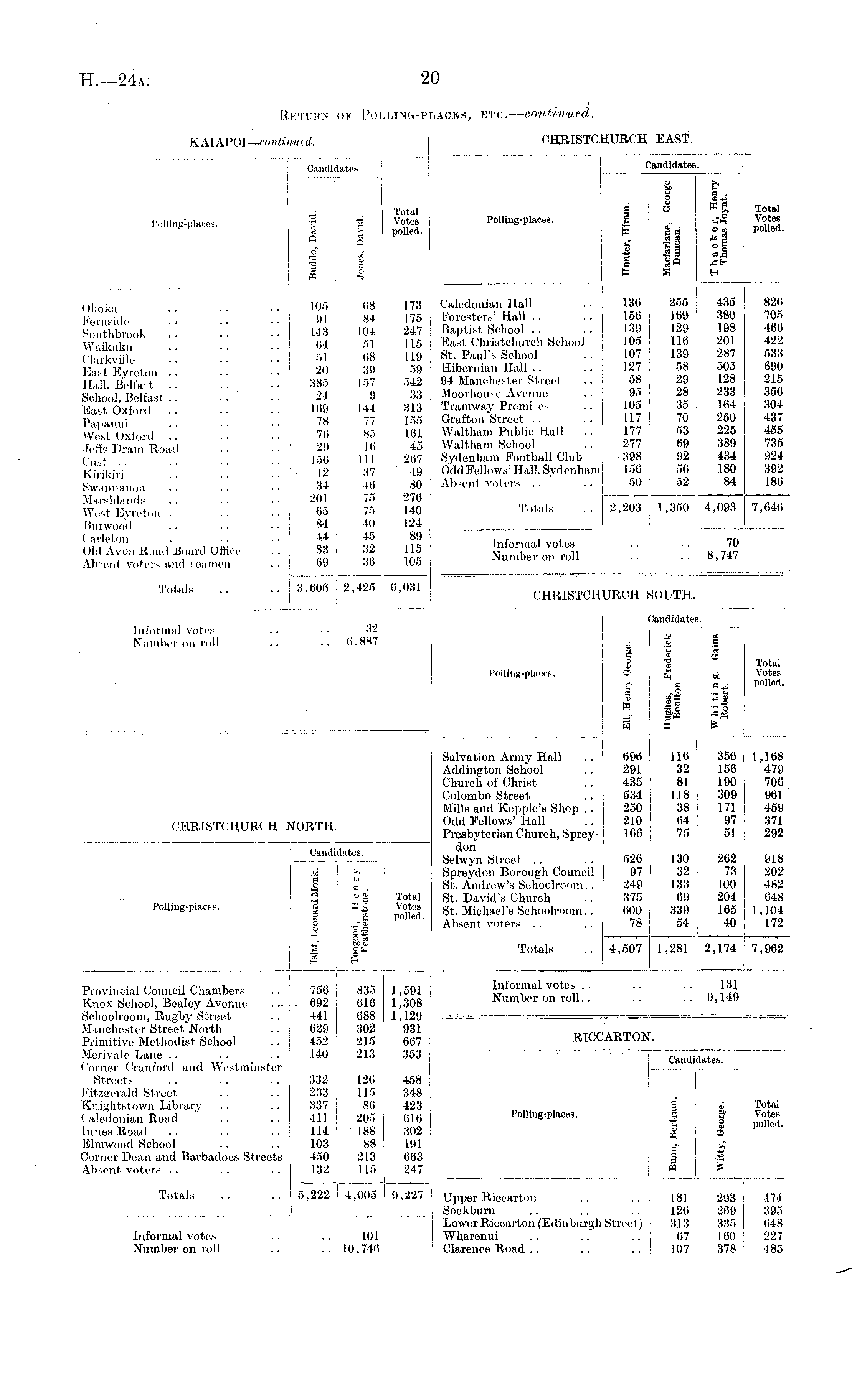 KAIAPOI — .continued. CHRISTCH1 ;URCH EAST. Candidates. id t ri.llinu-i.laees. £ 3 a -; c p I I* B i? T.ilul Votes Polling-places. polled. Candidate a Candidates. a » a S I I 1 § SB b a I r ani. W t. Total hTiS Votes a co polled. a 3 "I *S AtH H Ohoka .. - •• 105 08 Fernside 91 84 Southbrook .. .. -.1 143 104 Waikuku .. .. .. 04 51 Clarkville .. .. .. 51 08 East Eyroton .. .. .. 20 30 Hall. Belfast .. .. ..385 157 School, Belfast .. .. ' .... 24 9 East Oxford .. .. .. 109 144 Papanui . • • • • • 78 77 West Oxford .. .. .. , 70 85 Jeffs Drain Road .. .. 29 Hi Cus1 ; 150 Ml Kirikiri . . .. . . 12 37 Swannaiioa . . . • • • 34 46 Marshlands .. .. .. j 201 75 West Eyreton . ■ ■ ..66 75 Buiwoo'd .. .. ..I 84 Hi Carleton . .. . . 44 45 Old Avon Road .Board Officii ... 83 32 Ab -enl voters and seamen .. | 69 30 17:j Caledonian Hall 175 Foresters' Hall 247 Baptist School 115 , East Christchurch School 119 St. Paul's School 59 Hibernian Hall . . 542 94 Manchester Street :j;S Moorhou e Avenue 313 Tramway Prenii es 155 Grafton Street 101 Waltham Public Hall 45 Waltham School 207 Sydenham Football Club 40 Odd Fellows'Hall. Sydenham ,S0 Aluenl vol cis 276 - 140 Totals .. i 124 _ I, - Informal votes ,Q- Number on roll 130 : 255 156 : 169 139 129 105 110 107 139 127 58 58 29 95 28 105 35 117 70 177 53 277 ! 09 398 92 156 56 50 52 2,203 1,350 I 435 820 380 705 198 400 201 422 287 533 505 690 128 215 233 I 350 104 304 250 I 437 225 ! 455 389 735 434 924 180 392 84 180 4,093 7,646 70 8,747 2,203 1,350 4,093 7,646 I Informal votes Number on roll 70 8,747 Totals .. .. 3,000 2,425 ( '-°' !l CHR1STCHU CHRISTCH JRCH IRCH SOUTH. 80UTH. I Informal votes .. ■ ■ 32 Number on noil • • • • 8,887 ; Polling-places. Polling-places. So N © 3 B ri H Candidates. ii cj -a h. a | ' % ? £ . Candidates. ii a 'C a d ff fr? B i. a I Total b£ Votes a i as • r, H, I* Total Votes polled. & 9 a -£ hh it =1 ,a R a .. polled. Salvation Army Hall Addington School Salvation Army Hall Addington School Church of Christ Colombo Street Mills and Kepple's Shop . . Odd Fellows' Hall Presbyterian Church, Spreydon Selwyn Street Spreydon Borough Council St. Andrew's Schoolroom .. St. David's Church St. Michael's Schoolroom . . Absent voters 696 291 435 534 250 210 166 3 B 090 110 291 32 116 32 81 118 38 64 ! 75 I* 356 1,108 156 i 470 356 156 190 309 171 97 51 1,108 470 700 901 450 371 292 CHRISTCHURCH NORTH. Church of Christ Colombo Street Mills and Kepple's Shop . . Odd Fellows' Hall Presbyterian Church, Sprey435 81 534 118 250 38 210 64 166 75 190 , 706 309 961 171 459 97 371 51 ! 292 Candidates. Candii dates. j. resuy ici lan uaureii, opreydon Selwyn Street .. Sli,,.,.ir.l. m Kiivmirrli ( ruiimil 526 97 249 375 600 78 1UU ll» 526 130 0,7 'X9. 130 32 133 69 339 54 ! 262 918 73 ! 9.(19. 262 73 100 204 165 40 918 202 482 048 1,104 172 ii '-■ a h. 3 a . !../•-- r- a -r Hi Polling-places. i- X 9 I Ii - © (3 .OS Ho -a 1 © I H. a . COg w| E -H % o5 »co Ofc, Spreydon Borough Council St. Andrew's Schoolroom .. Iota) St. David's Church polled. St ' Miohael's Schoolroom'.'. Absent voters Total Votes polled. 97 62 249 133 375 69 600 339 78 54 i 73 j 202 100 ! 482 204 j 648 165 | 1,104 40 j 172 as Totals .. 4 i _ . Totals 4,507 4,507 1,281 1,281 2,174 2,174 7,962 7,962 Provincial Council Chambers .. I 756 835 Knox School, Bealey Avenue . . . - 692 616 Schoolroom, Rugby Street . . 441 | 688 Manchester Street North .. 1 629 I 302 Primitive Methodist School .. j 452 215 Merivale Lane .. .. .. 140 213 Corner Cranford and Westminster Streets .. . . .. 332 126 Fitzgerald Street .. .. 233 115 Knightstown Library .. .. 337 86 Caledonian Road .. .. 411 < 205 InnesRoad .. .. .. 114 188 Elmwood School .. .. 103 88 Corner Dean and Barbadoes Streets 450 213 Absent voters .. .. .. 132 1 15 750 . 092 441 029 452 140 835 010 088 302 215 213 I =g, Informal votes .. j 'oQg Number on roll. . 1' 129 - ... _—_ (j(t - t RICCA 353 458 348 423 (jiy Polling-plaoes. 302 191 663 247 : 1,591 1,308 1,129 931 667 353 1,591 1,308 1,129 931 667 353 Informal votes .. Number on roll.. VRTON. Candid 1 r» B B i 131 9,149 131 9,149 Iates. jj Total g> Votes 8 polled. CB | RIOOARTON. (.'audi idates. 332 233 337 411 114 103 450 132 120 115 80 205 188 88 213 115 458 348 423 616 302 191 003 247 458 348 423 610 302 191 003 247 Polling-places. H. B B v Total gf Votes 8 polled. CB i * . i i Totals .. .. 5,222 4,005 5,222 4,005 9,227 ; Upper Riooarton 9.227 Upper Riooarton .. ... 181 Soekburn . . .. .. 126 Lower Riooarton (Edinburgh Street) 313 Wharenui .. .. .. 67 Clarence Road .. .. .. 107 ... , 181 293 ' 474 269 j 395 335 i 648 160 227 378 485 293 ! 474 i.on onSoekburn I.nwcr R.ici-Mi'ton /Filin Itiiruli Si 120 iti ti :us 269 j 395 as« i (us Informal votes .. .. 101 Number on roll .. .. 10,746 101 .. 10.746 tjower mooarcon (lvt in ourgn o Wharenui ! Clarence Road .. Street) 318 07 107 ,iiSi> | 048 160 227 378 485