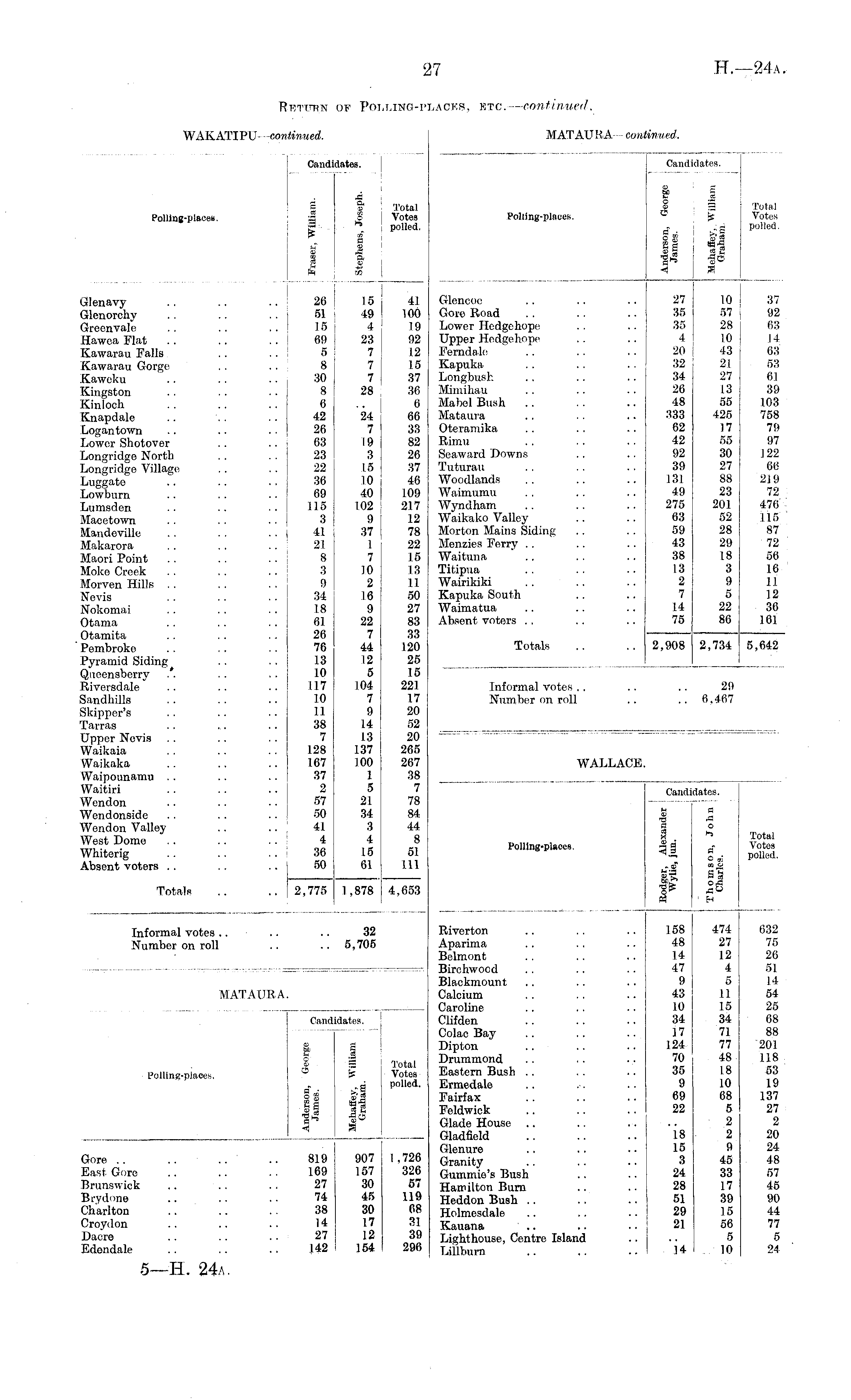 WAKATIPU continued. co: tinned. MATAURA cont tunned. Candidates. Candi idates. Candidates. . A » Total Polling-places. a ; Votes £'■ 1 polled. rt CO *s £ co 3 I" HH I i rC I a I 8 Polling-places. co a 00 H. CO O A I. Total Votes polled. Total Votes polled. 9 rd I & rH tO 1 ; 1 . i ! I Glenavy .. .. .. 26 i 15 j 41 Glenorchy .. .. .. 51 1 49 I 100 Greenvale .. .. .. 15 4 j 19 Hawea Flat . . . . . . 69 j 23 92 Kawarau Falls . . .. 5 7 \ 12 Kawarau Gorge . . . . I 8 j 7 1 15 Kaweku .. . . .. 30 7 | 37 Kingston . . . . .. 8 28 , 36 Kinloch .. .. .. 6 .. 6 Knapdale .. .. .. 42 24 1 66 Logantown .. .. .. 26 7 ! 33 Lower Shotover .. .. 63 19 82 Longridge North . . . . 23 3 26 Longridge Village . . .. 22 15 37 Luggate .. .. .. 36 10 j 46 Lowburn .. .. .. 69 40 | 109 Lumsden 115 102 ] 217 Maeetown . . . . .. 3 9 ! 12 Mandeville .. .. .. 41 37 I 78 Makarora . . . . .. 21 I 22 Maori Point .. .. .. 8 7 15 Moke Creek .. .. .. 3 10 13 Morven Hills . . . . .. 9 2 11 Nevis .. .. .. 34 16 50 Nokomai .. . . . . 18 9 27 Otama .. .. .. 61 22 83 Otamita .. .. .. 26 7 33 Pembroke .. .. .. 76 44 120 Pyramid Siding # .. .. 13 12 25 Queensberry .*. . . .. 10 5 15 Riversdale .. .. .. 117 1.04 221 Sandhills .. .. .. 10 7 17 Skipper's .. .. .. 11 9 20 Tarras .. .. .. 38 14 I 52 Upper Nevis .. . . .. 7 13 20 Waikaia .. .. .. 128 137 265 Waikaka .. .. .. 167 100 267 Waipounamu . . . . .. 37 I 38 Waitiri .. . . .. 2 5 7 Wendon .. .. .. 57 21 78 Wendonside . . . . .. 50 34 84 Wendon Valley .. .. 41 3 44 West Dome .. .. .. ! 4 4 8 Whiterig .. .. 36 15 51 Absent voters .. .. .. 50 61 111 26 51 15 69 5 8 30 8 6 42 26 63 23 22 36 69 115 3 41 21 8 3 9 34 18 61 26 76 13 10 117 10 11 38 7 128 167 37 2 57 50 41 4 36 50 15 49 4 23 7 7 7 28 24 7 19 3 15 10 40 102 9 37 I 7 10 2 16 9 22 7 44 12 5 104 7 9 14 13 137 100 1 5 21 34 3 4 15 61 41 100 19 92 12 15 37 36 6 66 33 82 26 37 46 109 217 12 78 22 15 13 11 50 27 83 33 120 25 15 221 17 20 52 20 265 267 38 7 78 84 44 8 51 111 Glencoe .. .. .. 27 10 37 Gore Road .. .. .. 35 57 92 Lower Hedgehope .. .. 35 28 63 Upper Hedgehope .. .. 4 10 14 Ferndale .. . . . . 20 43 [ 63 Kapuka . . . . . . 32 21 53 Longbush .. .. .. 34 27 6.1 Mimihau .. .. .. 26 13 39 Mabel Bush .. .. .. 48 55 103 Mataura .. .. .. 333 425 758 Oteramika .. .. .. 62 17 79 Rimu .. .. .. 42 55 97 Seaward Downs . . . . 92 30 .122 Tuturau . . . . .. 39 27 66 Woodlands .. .. .. 131 88 2J9 Waimumu . . .. .. 49 23 72 Wyndham . . . . .. 275 201 476 Waikako Valley .. .. 63 52 115 Morton Mains Siding .. .. 59 28 87 Menzies Ferry .. . . .. 43 29 72 Waituna .. .. .. 38 18 56 Titipua .. .. .. 13 3 16 Wairikiki .. .. .. 2 9 11 Kapuka South .. .. 7 5 12 Waimatua .. .. .. 14 22 36 Absent voters . . .. .. 75 86 161 27 35 35 4 20 32 34 26 48 333 62 42 92 39 131 49 275 63 59 43 38 13 2 7 14 75 10 57 28 10 43 21 27 13 55 425 17 55 30 27 88 23 201 52 28 29 18 3 9 5 22 86 37 92 63 14 63 53 6! 39 103 758 79 97 122 66 2J9 72 476 115 87 72 56 16 11 12 36 161 Totals .. .. 2,908 2,734 5,642 Informal votes .. .. .. 29 Number on roll .. .. 6.467 WALLACE. Candidates. hi a Candi H< S ! - B idates. a o Ho na — a ° 1 . Total Polling-plaoes. 3 g" _- Votes "'B. % A polled. &% 5 5 d o „; CO O SI ©.a Total Votes polled. Totals .. .. 2,775 1,878 4,653 r?fcr °A B ' H Informal votes.. .. .. 32 Number on roll .. .. 5,705 MATAURA. Candidates. J Total Polling-places. . 'f- ■ Votes „a polled. 11 si Total Votes polled. Riverton .. .. 158 474 632 Aparima .. . . .. 48 27 75 Belmont .. .. .. 14 12 26 Birohwood .. . . .. 47 4 5] Blackmount .. .. .. 9 5 14 Calcium .. .. .. 43 11 54 Caroline .. .. .. 10 15 25 Clifden 34 34 68 Colac Bay .. . . .. 17 71 88 Dipton ' .. .. .. 124 77 "201 Drummond .. .. • • 70 48 118 Eastern Bush .. .. .. 35 18 53 Ermedale .. ... .. 9 10 19 Fairfax .. .. .. 69 68 137 Feldwick .. .. .. 22 5 27 Glade House .. .. .. .. 2 2 Gladfield 18 2 20 Glenure .. . . .. 15 9 24 Granity .. .. .. 3 45 48 Gummie's Bush .. .. 24 33 57 Hamilton Burn .. .. 28 17 45 Heddon Bush .. .. .. 51 39 90 Holmesdale .. .. .. 29 15 44 Kauana .. .. .. 21 56 77 Lighthouse, Centre Island .. ■ ■ 5 5 Lillbum .. .. .. 14 . 10 24 158 48 14 47 9 43 10 34 17 124 70 35 9 69 22 474 27 12 4 5 11 15 34 71 77 48 18 10 68 5 2 2 9 45 33 17 39 15 56 5 10 632 75 26 51 14 54 25 68 88 201 118 53 19 137 27 2 20 24 48 57 45 90 44 77 5 24 Gore .. .. .. .. 819 907 1.726 East Gore .. .. .. 169 157 326 Brunswick .. .. 27 30 57 Brydone .. .. .. 74 45 119 Charlton .. .. 38 30 68 Croydon .. .. .. 14 17 31 Dacro .. .. . . 27 12 39 Edendale .. .. ..142 154 296 Gore .. East Gore Brunswick Brydone Charlton Croydon Dacro Edendale 819 169 27 74 38 14 27 142 1.726 326 57 119 68 31 39 296 18 15 3 24 28 51 29 21 14