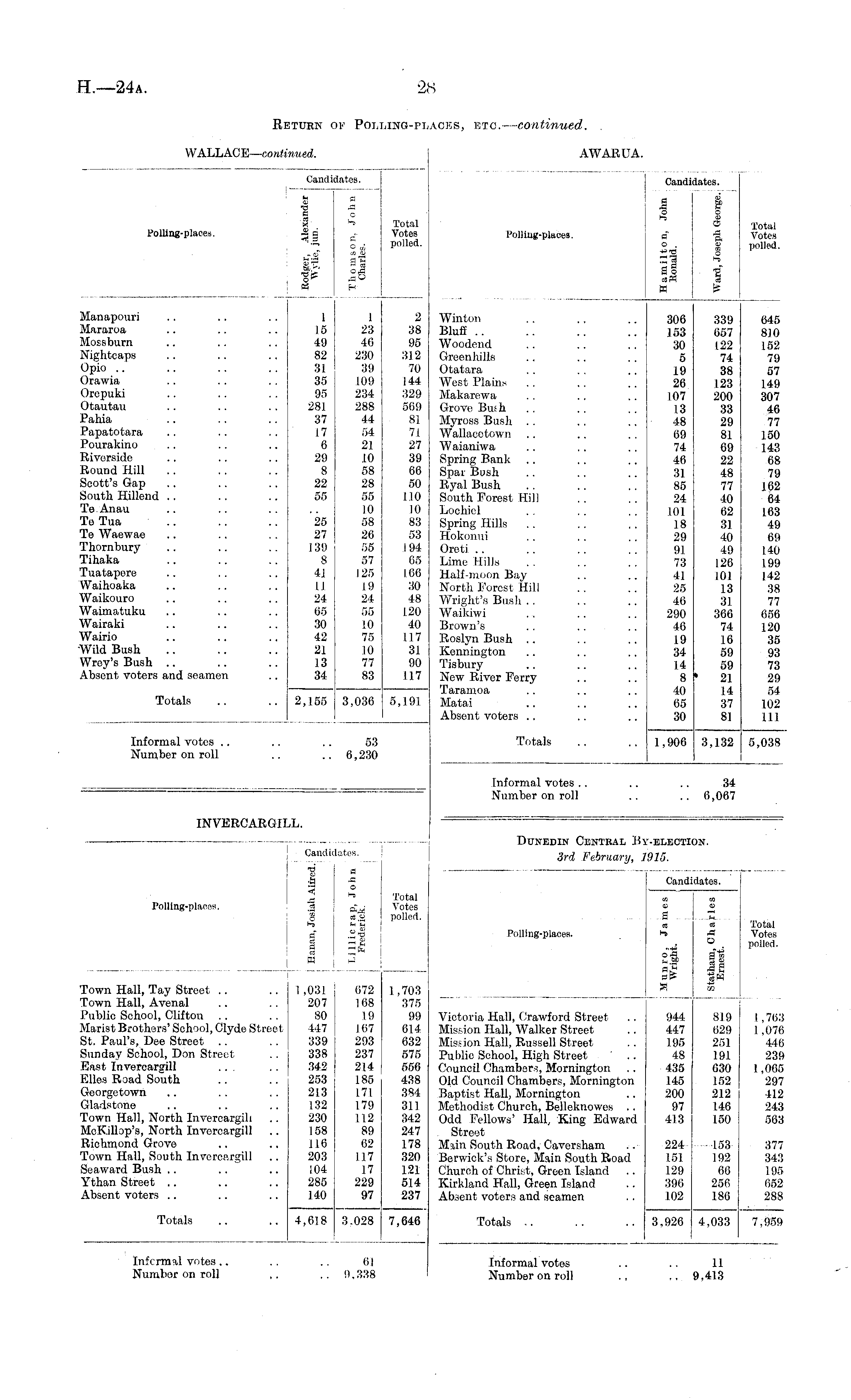 WALLACE— continued. AWARUA. Candii I y 3s 1 Polling-places. -2 g '"Z ; a id dates. a 0 V-C a co H Iates. a A o V-C o „; a S3 as H ! Total Votes polled. Total Votes polled. Polling-places. Candii a A 1 a o , a§ csB K Iates. co' I o 9 -a ft (B O 1-9 8 r« Total Votes [lolled. Manapouri .. .. .. 1 Mararoa .. .. .. 15 Mossburn .. .. .. 49 Nightcaps .. .. .. 82 Opio .. .. .. .. 31 Orawia .. .. . . 35 Orepuki .. .. . . 95 Otautau .. .. . . 281 Pahia .. .. . . 37 Papatotara .. .. . . 17 Pourakino .. .. .. 6 Riverside .. .. .. 29 Round Hill .. . . . . 8 Scott's Gap .. .. . . 22 South HiUend .. .. . . 55 Te Anau Te Tua .. .. .. 25 Te Waewae .. .. .. 27 Thornbury .. .. . . 139 Tihaka ' .. .. .. 8 Tuatapere .. . . .. 41 Waihoaka .. .. .. 11 Waikouro .. .. .. 24 Waimatuku .. .. .. 65 Wairaki .. .. .. 30 Wairio .. .. .. 42 Wild Bush .. .. .. 21 Wroy's Bush .. .. .. 13 Absent voters and seamen .. 34 1 23 46 230 39 109 234 288 44 54 21 10 58 28 55 10 58 26 55 57 125 19 24 55 10 75 10 77 83 1 23 46 230 39 109 234 288 44 54 21 10 58 28 55 10 58 26 55 57 125 19 24 55 10 75 10 77 83 2 38 95 312 70 144 329 569 81 71 27 39 66 50 110 10 83 53 194 65 166 30 48 120 40 117 31 90 117 2 38 95 312 70 144 329 569 81 71 27 39 66 50 110 10 83 53 194 65 166 30 48 120 40 117 31 90 117 Winton Bluff .. Woodend Greenhills Otatara West Plains . . Makarewa Grove Bush Myross Bush . . Wallacctown Waianiwa Spring Bank Spar Bush Ryal Bush South Forest Hill Lochiel Spring Hills Hokonui Oreti Lime Hills Half-moon Bay North Forest Hill Wright's Bush .. Waikiwi Brown's Roslyn Bush .. Kennington Tisbury New River Ferry Taramoa Matai Absent voters .. 306 153 30 5 19 26 107 13 48 09 74 40 31 85 24 101 18 29 91 73 41 25 40 290 40 19 34 14 8 40 05 30 339 657 122 74 38 123 200 33 29 81 69 22 48 77 40 62 3] 40 49 126 101 13 31 366 74 16 59 59 ' 21 14 37 81 645 810 152 79 57 149 307 46 77 150 143 68 79 162 64 163 49 69 140 199 142 38 77 656 120 35 93 73 29 54 102 111 Totals .. .. 2,155 3,036 5,191 I Informal votes Number on roll 53 6,230 Totals 1,906 3,132 5,038 Informal votes .. Number on roll 34 6,067 INVERCARGH An. Candidates. " t «~ <S — 1 a 1 2* DtJNEDIN CENTBAL Bj 3rd February, 1 ."-ELECTION. '915. Candidates. Polling-places. Total Votes polled. Polling-places. a O ...H... O 9 hU 3 o to Total Votes polled. Town Hall, Tay Street Town Hall, Avenal Public School, Clifton Marist Brothers' School, Clyde Street St. Paul's, Dee Street Sunday School, Don Street East Invereargill ... Ellos Road South Georgetown Gladstone Town Hall, North Invereargill McK.illop's, North Invereargill Richmond Grove Town Hall, South Invereargill Seaward Bush Ythan Street Absent voters 1,031 672 207 108 80 19 447 107 339 293 338 237 342 214 253 185 213 171 132 179 230 112 158 89 110 62 203 117 104 17 285 229 140 97 1,703 375 99 614 632 575 556 438 384 31.1 342 247 178 320 121 514 237 Victoria Hall, Crawford Street Mission Hall, Walker Street Mission Hall. Russell Street Public School, High Street Council Chambers, Mornington Old Council Chambers, Mornington Baptist Hall, Mornington Methodist Church, Belleknowes .. Odd Fellows' Hall, King Edward Street Main South Road, Caversham Berwick's Store, Main South Road Church of Christ, Green Island Kirkland Hall, Green Island Absent voters and seamen 944 447 195 48 435 145 200 97 413 819 629 251 191 630 152 212 146 150 I ,703 1 ,070 440 239 1,005 297 412 243 563 224 151 129 396 .102 453 192 60 256 .186 377 343 195 652 288 Totals Totals 4,618 3.028 7,646 3,920 4,033 7,959 Informal votes.. Numbor on roll 01 9.338 Informal votes Number on roll 11 9,413