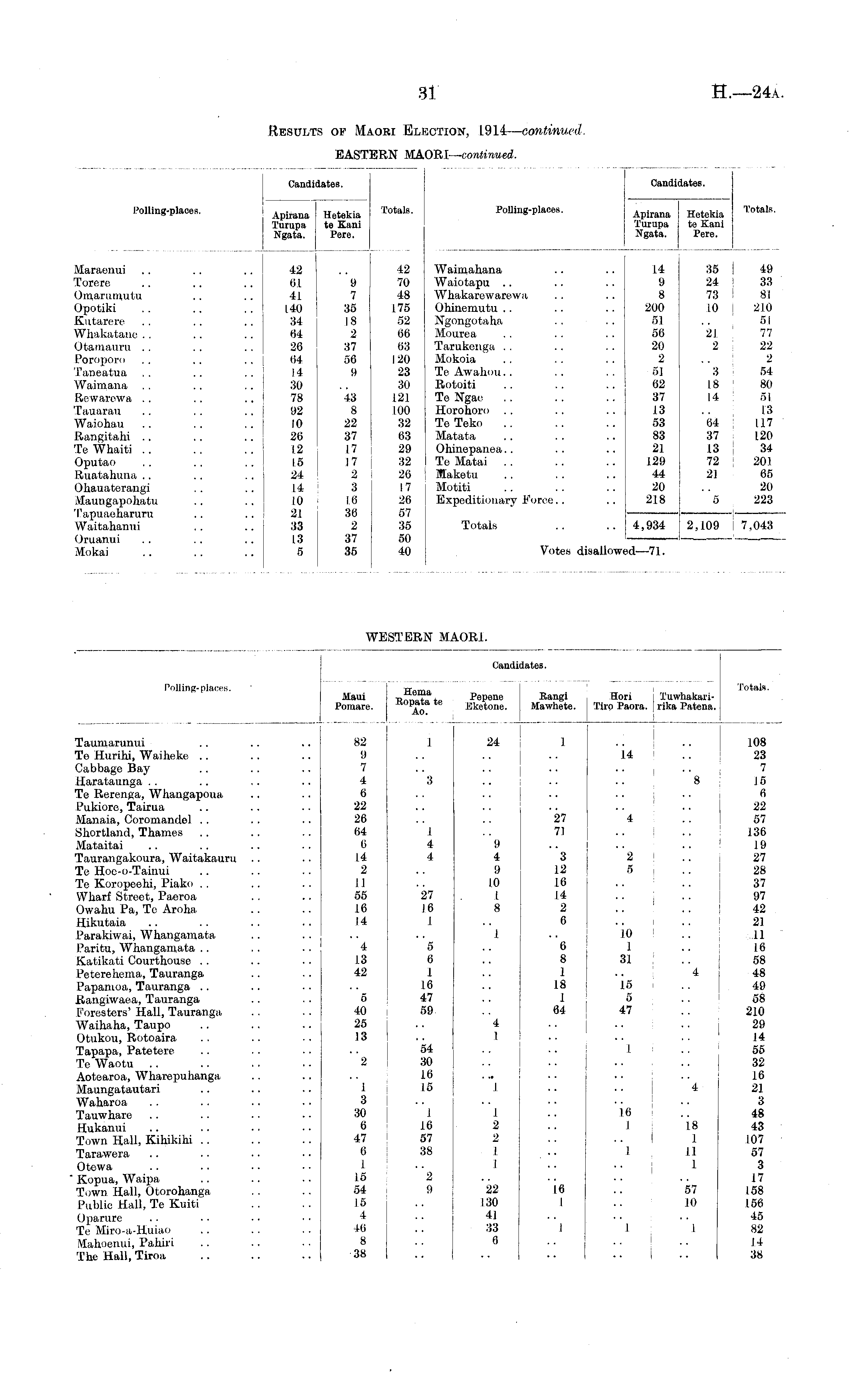 Candii Iates. Candidates. Polling-places. Totals. Polling-places. Apirana Turupa Ngata. Hetekia te Kani Pere. Totals. Apirana Turupa Ngata. Hetekia te Kani Pere. Maraenui Torere Omaruniutu Opotiki Kutarere Whakatane Otamauru Poroporo Tanoatua Waimana Rcwarcwa Tauarau Waiohau Rangitahi Te Whaiti Oputao Ruatahuna Ohauaterangi Maungapohatu Tapuaeharuru Waitahanui Oruanui Mokai 42 61 41 140 34 64 26 64 14 30 78 92 10 26 1,2 15 24 14 10 21 33 13 5 9 7 35 18 2 37 56 9 43 8 22 37 17 17 2 3 16 36 2 37 35 42 70 48 175 52 66 63 120 23 30 121 100 32 63 29 32 26 17 26 57 35 50 40 Waimahana Waiotapu Whakarowarewa Ohinemutu Ngongotaha Mourea Tarukonga Mokoia Te Awahou Rotoiti Te Ngae Horohoro Te Teko Matata Ohinepanea Te Matai .. Maketu Motiti Expeditionary Force 14 9 8 200 51 56 20 2 51 62 37 13 53 83 21 129 44 20 218 35 I 24 73 10 21 2 3 18 14 64 37 13 72 21 "5 I 49 33 81 210 51 77 22 2 54 80 51 13 117 120 34 201 65 20 223 Totals 4,934 2,109 7,043 Votes disallowi >d—71.