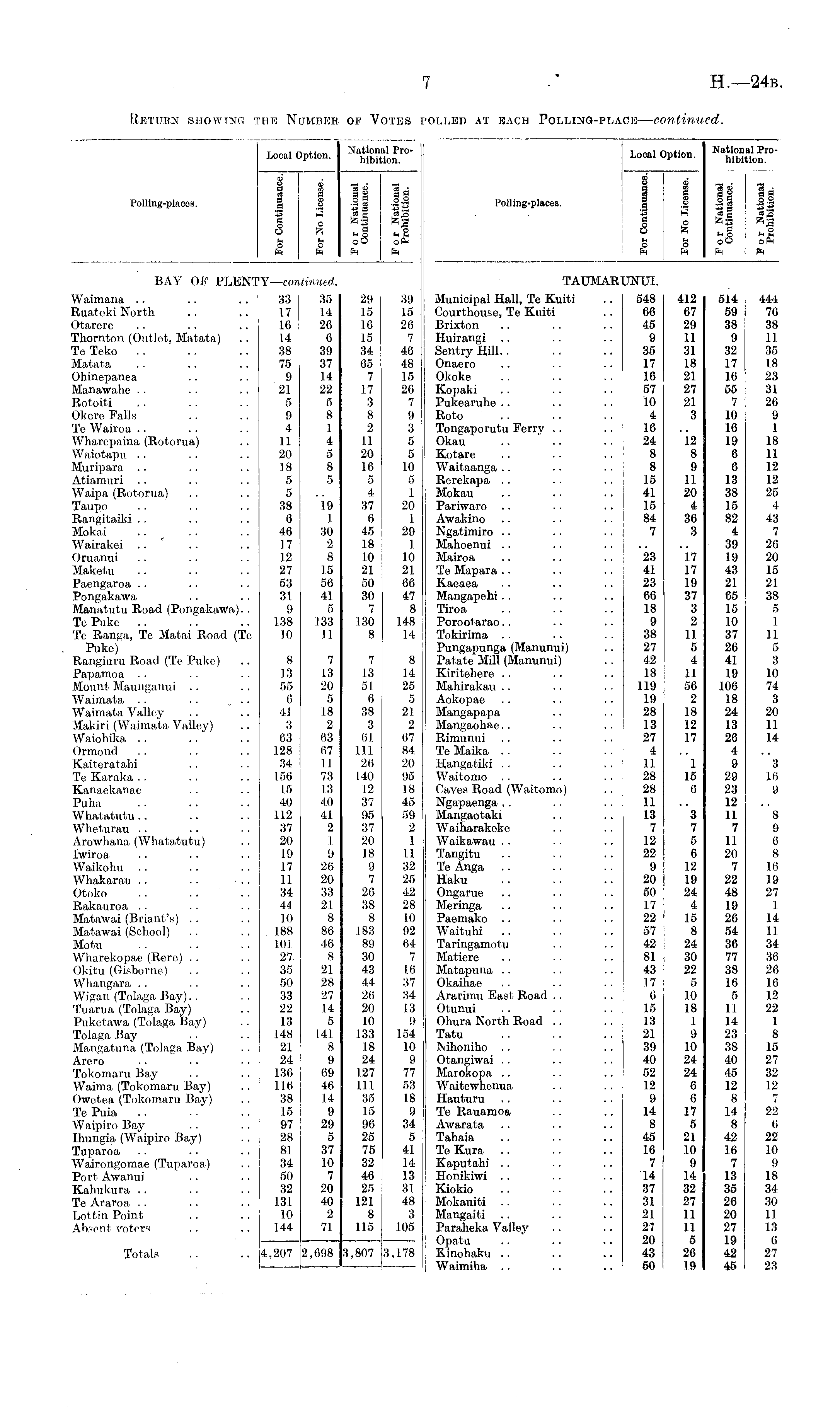 Local Option. Nation hibil al Proiion. Local Iption. Nationi hibil »1 I'm ;ion. Polling-places. j a 8 U pS I s 3 o R M O ft « 2> a 2 s S '■§§ t a *1 ss ft "3 a 9 §.2 [S-a 3 to Polling-places. Q § 6 I 6 a.: B <U co ft u o to 11 fag oO ft h If to BAY OF PLEN' 'Y — con dinued. TAUHAR JUL Waimana Ruatoki North Otarere Thornton (Outlet, Hatata) .. TeTeko .. Hatata Ohinepanea Hanawahe Rotoiti Okerc Falls Te Wairoa Wharepaina (Rotorua) Waiotapu Huripara Atiamuri Waipa (Rotorua) Taupo Rangitaiki Hokai Wairakei Oruanui Haketu Paengaroa Pongakawa Manatutu Road (Pongakawa).. TePuke .. To Ranga, Te Matai Road (To Puke) Rangiuru Road (Te Puke) Papamoa Hount Haungauui Waimata . . .. .... Waimata Valley Hakiri (Waimata Valley) Waiohika Ormond Kaiteratahi Te Karaka Kanaekanae Puha Whatatutu Wheturau Arowhana (Whatatutu) Iwiroa Waikohu Whakarau Otoko Rakauroa Matawai (Briant's) Matawai (School) Motu Wharekopae (Rere) Okitu (Gisborne) Whangara Wigan (Tolaga Bay) Tuarua (Tolaga Bay) Puketawa (Tolaga Bay) Tolaga Bay Hangatuna (Tolaga Bay) Arero Tokomaru Bay Waima (Tokomaru Bay) Owetea (Tokomaru Bay) Tc Puia Waipiro Bay Ihungia (Waipiro Bay) Tuparoa Wairongomae (Tuparoa) Port Awanui Kahukura Te Araroa Lottin Point Absent voters 33 17 16 14 38 75 9 21 5 9 4 11 20 18 5 5 38 6 46 17 12 27 53 31 9 138 10 35 14 26 6 39 37 14 22 5 8 1 4 5 8 5 29 15 16 15 34 65 7 17 3 8 2 11 20 16 5 4 37 6 45 18 10 21 50 30 7 130 8 39 15 26 7 46 48 15 26 7 9 3 5 5 10 5 1 20 1 29 1 10 21 66 47 8 148 14 Municipal Hall, Te Kuiti Courthouse, Te Kuiti Brixton Huirangi Sentry Hill.. Onaero Okoke Kopaki Pukearuhe Roto Tongaporutu Ferry Okau Kotare Waitaanga Rorekapa Mokau Pariwaro Awakino Ngatimiro Mahoenui Hairoa To Mapara Kaeaea Mangapehi Tiroa Porootarao.. Tokirima Pungapunga (Manunui) Patatc Hill (Manunui) Kiritehere Mahirakau Aokopae Hangapapa Hangaohae Rimunui Te Maika Hangatiki Waitomo Caves Road (Waitomo) Ngapaenga Hangaotaki Waiharakeke Waikawau Tangitu Te Anga Haku Ongarue Heringa Paemako Waituhi Taringamotu Matiere Matapuna Okaihae Ararimu East Road Otunui Ohura North Road Tatu JSihoniho Otangiwai Marokopa Waitowhcnua Hauturu Tc Rauamoa Awarata Tahaia Te Kura Kaputahi Honikiwi Kiokio Hokauiti Hangaiti Paraheka Valley Opatu Kinohaku Waimiha . . 548 66 45 9 35 17 16 57 10 4 16 24 8 8 15 41 15 84 7 412 67 29 11 31 18 21 27 21 3 514 59 38 9 32 17 16 55 7 10 16 19 6 6 13 38 15 82 4 39 19 43 21 65 15 10 37 26 41 19 106 18 24 13 26 4 9 29 23 12 11 7 11 20 7 22 48 19 26 54 36 77 38 16 5 II 14 23 38 40 45 12 8 14 8 42 16 7 13 35 26 20 27 19 42 45 444 76 38 11 35 18 23 31 26 9 1 18 11 12 12 25 4 43 7 26 20 15 21 38 5 1 11 5 3 10 74 3 20 11 14 12 8 9 11 20 4 36 3 19 1 30 2 8 15 56 41 5 133 II 23 41 23 66 18 9 38 27 42 18 119 19 28 13 27 4 11 28 28 11 13 7 12 22 9 20 50 17 22 57 42 81 43 17 6 15 13 21 39 40 52 12 9 14 8 45 16 7 14 37 31 21 27 20 43 50 17 17 19 37 3 2 11 6 4 11 56 2 18 12 1.7 8 13 55 0 4.1 3 63 128 34 156 15 40 112 37 20 19 17 11 34 44 10 188 101 27. 35 50 33 22 13 148 21 24 136 116 38 15 97 28 81 34 50 32 131 10 144 7 13 20 5 18 2 03 67 II 73 13 40 41. 2 I 9 26 20 33 21 8 86 46 8 21 28 27 14 5 141 8 9 69 46 14 9 29 5 37 10 7 20 40 2 71 7 13 51 6 38 3 61 111 26 140 12 37 95 37 20 18 9 7 26 38 8 183 89 30 43 44 26 20 10 133 18 24 127 111 35 15 96 25 75 32 46 25 121 8 115 8 14 25 5 21 2 67 84 20 95 18 45 59 2 1 11 32 25 42 28 10 92 64 7 1.6 37 34 13 9 154 10 9 77 53 18 9 34 5 41 14 13 31 48 3 105 1 15 6 3 7 5 6 12 19 24 4 15 8 24 30 22 5 10 18 1 9 10 24 24 6 6 17 5 21 10 9 14 32 27 11 11 5 26 19 3 10 9 8 9 8 8 16 19 27 1 14 11 34 36 26 16 12 22 1 8 15 27 32 12 22 6 22 10 9 18 34 30 .11 13 6 27 23 Totals 4,207 2,698 3,807 3,178