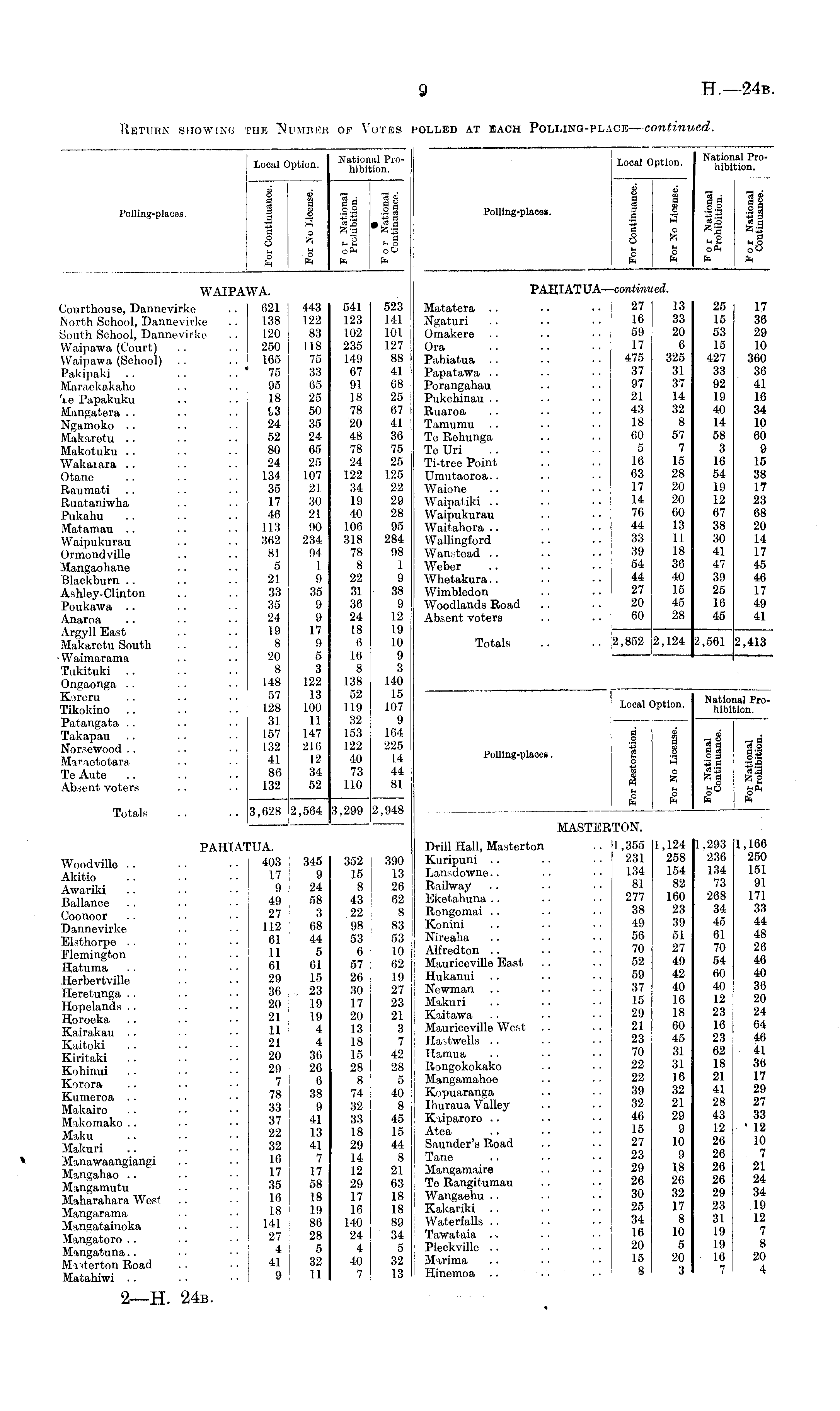 Local 3 3 a a 6 u O to iption. 6 £j © H o ft M c to Natioi hlbii la .2-2 |ig A S . o fa fa oto to ial Protion. IS si fag oo ft Polling-place*. Local 0) $ a a o 0 fa Iption. 9 O a o ft to o to Nation hibil 3 A a 9 .2-2 'AS faS oft ft al ProJon. a 2 2 i -fa a iS a Rffl a S3 to Polling-places. WAIPA' WA. PAHIATUA--continu '.ed. Courthouse, Dannevirke North School, Dannevirke South School, Dannevirke Waipawa (Court) Waipawa (School) Pakipaki Marackakaho 'ie Papakuku Mangatera Ngamoko Hakaretu Hakotuku Wakaiara Otane Raumati Ruataniwha Pukahu Hatamau Waipukurau Ormondville Hangaohane Blackburn Ashley-Clinton Poukawa Anaroa Argyll East Hakaretu South • Waimarama Tukituki Ongaonga .. K;reru Tikokino .. . . Patangata Takapau Norsewood .. Haraototara TeAute .. Absent voters 621 138 120 250 165 75 95 18 13 24 52 80 24 134 35 17 46 113 362 81 5 21 33 35 24 19 8 20 8 148 57 128 31 157 132 41 86 132 443 122 83 118 75 33 05 25 50 35 24 65 25 107 21 30 21 90 234 94 I 9 35 9 9 17 9 5 3 122 13 100 11 147 210 12 34 52 541 123 102 235 149 07 91 18 78 20 48 78 24 122 34 19 40 106 318 78 8 22 31 36 24 18 6 16 8 138 52 119 32 153 122 40 73 110 523 141 101 127 88 41 08 25 67 41 36 75 25 125 22 29 28 95 284 98 1 9 38 9 12 19 10 9 3 140 15 107 9 164 225 14 44 81 Matatera . • Ngaturi Omakere Ora Pahiatua . . Papatawa .. Porangahau Pukehinau . . Ruaroa Tamumu Te Rehunga To Uri Ti-tree Point Umutaoroa.. Waione Waipatiki .. Waipukurau Waitahora .. Wallingford Wanstead .. Weber Whotakura.. Wimbledon Woodlands Road Absent voters 27 16 59 17 475 37 97 21 43 18 60 5 16 63 17 14 76 44 33 39 54 44 27 20 60 13 33 20 0 325 31 37 14 32 8 57 7 15 28 20 20 60 13 11 18 36 40 15 45 28 25 15 53 15 427 33 92 19 40 14 58 3 16 54 19 12 67 38 30 41 47 39 25 16 45 17 36 29 10 360 36 41 16 34 10 60 9 15 38 17 23 68 20 14 17 45 46 17 49 41 Totals 2,852 2,124 2,561 2,413 Local ( Option. Natioi hibil ml Proslon. Polling-places. a o 1 o -fa HI & hi o to 0) | o A o ft a cs o 3 S a 2fl 'a a o S" ft -. a rt o A g faft ft Totals 3,628 2,564 3,299 2,948 HASTER' TON. PAHIA1 CUA. 403 17 9 49 27 112 61 11 61 29 36 20 21 11 21 20 29 7 78 33 37 22 32 16 17 35 16 18 141 27 4 41 9 345 9 24 58 3 68 44 5 61 15 23 19 19 4 4 36 26 0 38 9 41 13 41 7 17 58 18 19 86 28 5 32 11 352 15 8 43 22 98 53 6 57 26 30 17 20 13 18 15 28 8 74 32 33 18 29 14 12 29 17 16 140 24 4 40 7 390 13 26 62 8 83 53 10 62 19 27 23 21 3 7 42 28 5 40 8 45 15 44 8 21 63 18 18 89 34 5 32 13 Drill Hall, Hastorton Kuripuni Lansdowne Railway Eketahuna Rongomai Konini Nircaha Alfredton Mauriceville East Hukanui Newman Makuri Kaitawa Mauriceville West Hastwells Hamua Rongokokako Mangamahoo Knpuaranga Ihuraua Valley K liparoro Atea Saunder's Road Tane Mangamaire Te Rangitumau Wangaehu Kakariki Waterfalls Tawataia Pleckvillc Harima Hi nemo a . . 1,355 231 134 81 277 38 49 56 70 52 59 37 15 29 21 23 70 22 22 39 32 40 15 27 23 29 26 30 25 34 16 20 15 8 1,124 258 154 82 160 23 39 51 27 49 42 40 16 18 60 45 31 31 16 32 21 29 9 10 9 1.8 26 32 17 8 10 5 20 3 1,293 236 134 73 268 34 45 61 70 54 60 40 12 23 10 23 02 18 21 41 28 43 12 26 26 26 20 29 23 31 19 19 16 7 1,160 250 151 91 171 33 44 48 20 46 40 36 20 24 64 46 41 30 17 29 27 33 ' 12 10 7 21 24 34 19 12 7 8 20 4 Woodville Akitio Awariki Ballanoe Coonoor Dannevirke Elsthorpe Flemington Hatuma Herbertville Heretunga Hopelands Horoeka Kairakau Kaitoki Kiritaki Kohinui Korora Kumeroa Hakairo Hakomako Maku Makuri Manawaangiangi Mangahao Mangamutu Maharahara West Mangarama Mangatainoka Mangatoro Mangatuna Muterton Road Hatahiwi ..