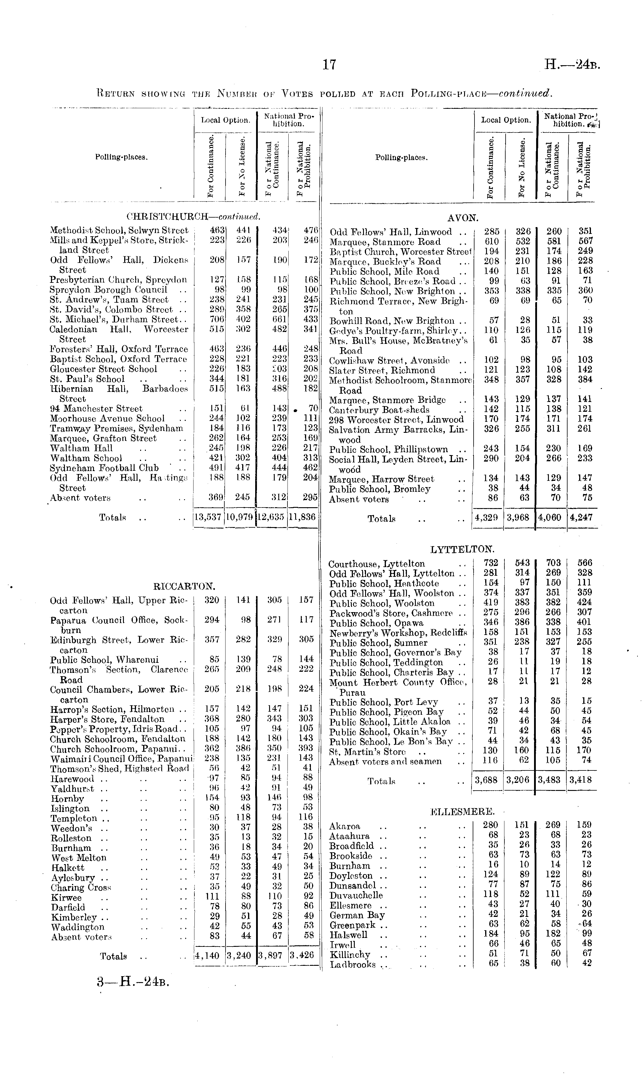 Local Option. Local C )ption. Nation hihii lal Pi'otion. Local iption. Nation hibil al Pro-1 ;ion. f-i. | 8 o I 1 Polling-places. ,3 a © § | _a *j a o o fa o ft o 1 o 3 o R fa o ft II IJ a fa o oO ft la o.2 '■3 is *3 "1 oft ft Polling-places. V e a B a !fa a o O fa o ft | © 3 o fa o ft If As fag oO ft "3 A a a 5.2 '•3 a ?! to © r< ° 2, ft ft m (! HRISTt IHURCH— contmuea ,CH—co mtinuet J 476 ■ | 246 AVON. i. Methodist School, Selwyn Street 463 441 Mills and Keppel's Store, Strick- , 223 226 land Street Odd Fellows' Hall, Dickens 208 157 Street Presbyterian Church, Sprcydon 127 158 Spreydon Borough Council .. 98 99 St. Andrew's, Tuam Street . . 238 241 St. David's, Colombo Street . . 289 358 St. Hichael's, Durham Street. . 700 402 Caledonian Hall. Worcester 515 302 Street Foresters' Hall, Oxford Terrace 463 236 Baptist School, Oxford Terrace 228 221 Gloucester Street School . . 220 183 St. Paul's School .. .. 344 181 Hibernian Hall, Barbadoes 515 163 Street 94 Manchester Street .. 151 61 Hoorhouse Avenue School . . 244 102 Tramway Promises, Sydenham 184 110 Harquee, Grafton Street .. 202 164 Waltham Hall .. .. 245 198 Waltham School .. .. 421 302 Sydneham Football Club ' .. I 491. 417 Odd Fellows' Hall, Ratings 188 188 Street Absent voters .. .. 369 245 463 223 441 226 434| 203 j Odd Fellows' Hall, Linwood .. 285 Harquee, Stanmore Road .. 610 Baptist Church, Worcester Street 194 Marquee, Buokley's Road ... 208 Public School, Mile Road .. 140 Public School, Br< ezo's Road .. 99 Public School, New Brighton .. 353 Richmond Terrace, New Brigh- 69 ton Bowhill Road, Now Brighton .. 57 Gedye's Poultry-farm, Shirley.. 110 Hrs. Bull's House, HcBratncy's 61 Road Cowlishaw Street, Avonside .. 102 Slater Street, Richmond .. 121 Methodist Schoolroom, Stanmore 348 Road Harquee, Stanmore Bridge .. 143 Canterbury Boat-sheds .. 142 298 Worcester Street, Linwood 170 Salvation Army Barracks, Lin- 326 wood Public School, Phillipstown .. 243 Social Hall, Leyden Street, Lin- 290 wood Marquee, Harrow Street .. 134 Public School, Bromley .. 38 Absent voters .. .. 86 326 532 231 210 151 63 338 69 260 581 174 186 128 91 335 65 351 567 249 228 163 71 360 70 208 157 190 172 127 98 238 289 706 515 158 99 241 358 402 302 115 98 231 265 661 482 108 100 245 375 433 341 28 126 35 51 115 57 33 119 38 463 228 226 344 515 236 221 183 181 163 446 223 £03 316 488 248 233 208 202 182 98 123 357 95 108 328 103 142 384 151 244 184 262 245 421 491 188 61 102 110 164 198 302 417 188 143 239 173 253 226 404 444 179 . 70 111 123 169 217 313 462 204 129 116 174 255 137 138 171 311 141 121 174 201 154 204 230 266 109 233 143 44 63 129 34 70 1.47 48 75 369 245 312 295 Totals .. .. 13,537 10,979 12,035 11,836 Totals .. .. 4,329 3,968 4,247 4,000 LYTTELTON. 543 314 97 337 383 296 386 151 238 17 II II 21 566 328 111 359 424 307 401 153 255 18 18 12 28 RICCARTON. Odd Fellows' Hall, Upper Ric- 320 141 carton Paparua Council Office, Sock- 294 98 burn Edinburgh Street, Lower Ric- I 357 282 carton Public School, Wharenui .. 85 139 Thomson's Section, Clarence 265 209 Road Council Chambers, Lower Ric- ; 205 218 carton Harrop's Section, Hilmorton .. : 157 142 Harper's Store, Fendalton .. 308 280 Pepper's Property, Idris Road.. 105 97 Church Schoolroom, Fendalton 188 142 Church Schoolroom, Papanui. . ! 302 380 Waimairi Council Office, Papanui, 238 135 Thomson's Shed, Highsted Road 56 42 Harowood .. .. . . I '97 85 Yaldhurst .. .. .. ! 96 42 Hornby .. .. 154 93 Islington .. .. .. 80 48 Templototi .. • • ■ • 95 118 Weedon's . . .. .. 30 37 Rolleston . . . . .. 35 13 Burnham . . . . .. 36 18 West Helton . . . . 49 53 Halkett .. .. ..58 33 Aylesbury .. . . .. | 37 22 Charing Cross . . .. 35 49 Kirwee . • ■ • • • 111 88 Darfield . . .. .. 78 80 Kimberley .. .. .. 29 51 Waddington . . . . 42 55 Absent voters . . . . 83 44 305 271 329 78 248 157 117 305 144 222 Courthouse, Lyttelton .. 732 Odd Fellows' Hall, Lyttelton . . 281 Public School, Heathcotc . . 154 Odd Fellows' Hall, Woolston .. 374 Public School, Woolston .. 419 Packwood's Store, Cashmere .. 275 Public School, Opawa .. 346 Newberry's Workshop, Rcdcliffs 158 Public School, Sumner . . 351 Public School, Governor's Bay 38 Public School, Toddington .. 26 Public School, Charteris Bay .. 17 Mount Herbert County Office. 28 Purau Public School, Port Levy .. 37 Public School, Pigeon Bay .. 52 Public School, Little Akaloa . . 39 Public School, Okain's Bay .. 71 Public School, Le Bon's Bay .. 44 St, Hartin's Store .. .. 130 Absent voters and seamen .. 11 6 703 269 150 351 382 266 338 153 327 37 19 17 21 198 224 1.47 343 94 180 ! 350 231 51 94 91 140 73 94 28 32 34 47 49 31 32 1 10 73 28 43 67 151 303 105 143 393 143 41 88 49 98 53 116 38 15 20 54 34 25 50 92 86 49 53 58 13 44 46 42 34 1 60 02 35 50 34 68 43 115 105 15 45 54 45 35 170 74 Totals .. .. 3,688 3,088 3,206 3,483 3,418 ELLESMERE. ERE. Akaroa .. .. ■ ■ 280 Ataahura .. .. . • 68 Broadficld .. .. •• 35 Brookside . . .. • • 63 Burnham . . . • • • 16 Doyleston .. .. . ■ 124 Dunsandcl .. . • • ■ 77 Duvauchclle .. •• 118 Ellesmere .. .. •. 43 German Bay .. .. 42 Grcenpark .. .. .. 63 Halswell .. ... •• 184 Irwell • • 66 Killinchy .. .. .. 51 Ladbrooks .. .. .. 65 280 151 68 23 35 26 63 73 16 10 124 89 77 87 118 52 43 27 42 21 03 62 184 95 66 46 51 71 65 38 209 08 33 63 14 122 75 111 40 34 58 182 65 50 60 159 23 26 73 12 89 86 59 30 20 04 99 48 67 42 Totals .. .. 4,140 3,240 3,897 3,426