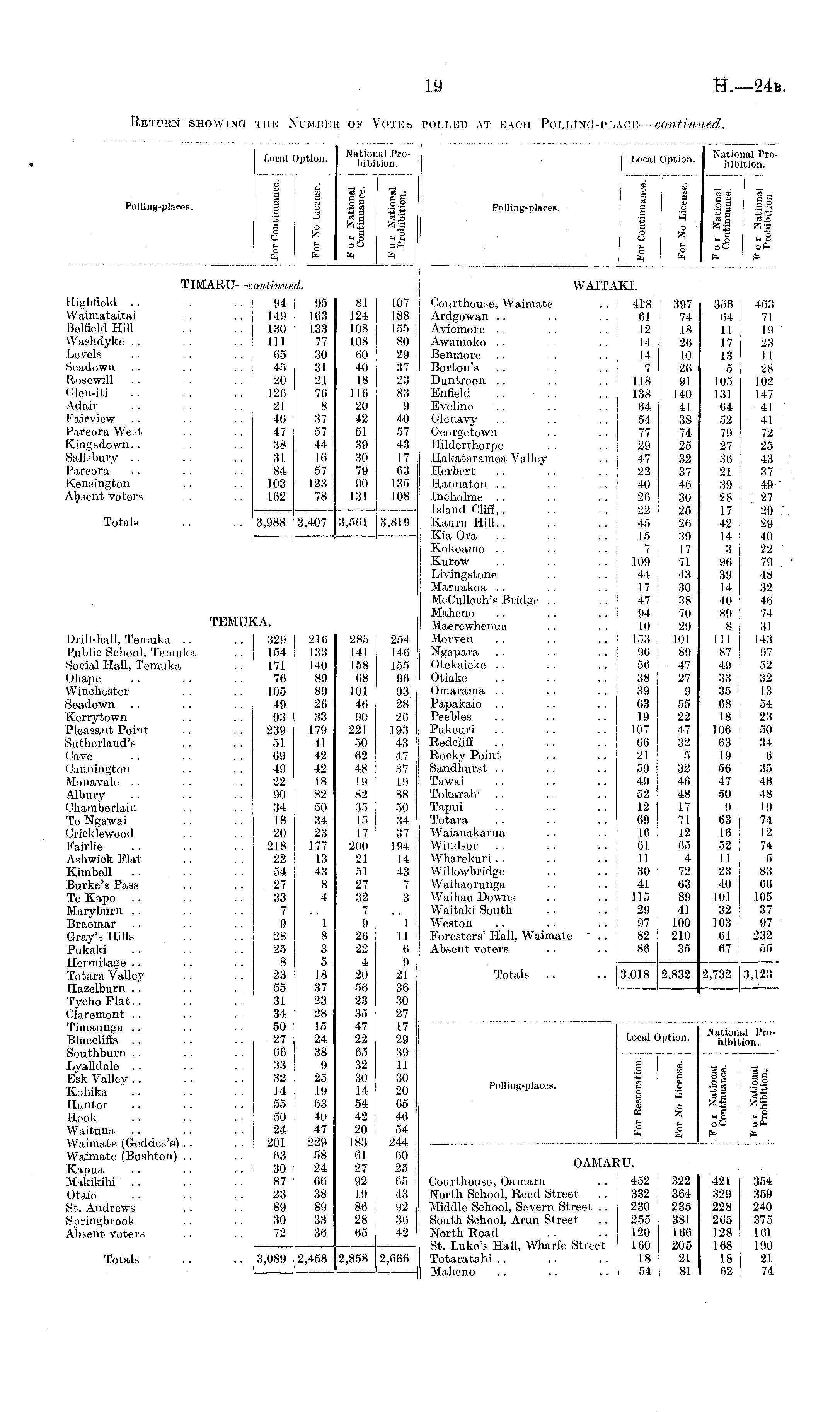 Local Option. Nation hibii ial Protion. Local Option. 8 i g | Polling-places, o 'I « fa a. o o ft ft iption. National Prohibition. Polling-places. § s .9 8 o to to a o 3 o R I li ■S a a a RJ3 sl ft « A a a 1,2 'j-»fa faS oft ft a OJ o 3 o R fa o ft ' „ , I k ai I id _■ .2 § .2 -2 fl I ft ft TIMARU— c, ■-ontinuet WAITAK1. ■a. Highfield .. VVaimataitai Holfield Hill Washdyke Levels Seadown Rosewill (Uen-iti Adair Pair view Pareora West ICingsdown.. Salisbury Pareora Kensington Absent voters 94 149 130 111 65 45 20 126 21 46 47 38 31 84 103 162 95 163 133 77 30 31 21 76 8 37 57 44 16 57 123 78 81 124 108 108 60 40 18 110 20 42 51 39 30 79 90 131 107 188 155 80 29 37 23 83 9 40 57 43 17 63 135 108 Courthouse, Waimate .. i 418 397 Ardgowan .. .. .. , 61 74 Aviomore .. . . . . \ 12 18 Awamoko .. . . .. 14 26 Benmoro . . .. .. 14 10 Borton's . . .. ,, I 7 26 Duntroon . . .. .. 118 I 91 Enfield .. .. . . 138 ; 140 Eveline .. . . . . 04 41 Glenavy .. . . . . j 54 38 Georgetown .. .. I 77 74 Hildcrthorpe .. .. 29 25 Hakataramea Valley . . I 47 32 Herbert . . . . ., 22 37 Hannaton . . . . .. 40 40 tncholme .. . . .. 26 30 Island Cliff.. . . 22 25 Kauru Hill. . . . 45 20 Kia Ora .. .. .. ! 15 39 Kokoamo . . . . .;. 7 17 Kurow .. .. ; 109 71 Livingstone . . .. 44 43 Maruakoa .. . . .. 17 30 HcCulloch's Bridge . . .. 47 38 Mahcno .. . . .. 94 70 Maerewhenua . . . . 10 29 Morven .. . . .. 153 101 Ngapara .. .. .. 90 89 Otekaieke . . .. .. j 56 47 Otiake . . . . .. 38 27 Omarama .. . . .. 39 9 Papakaio .. .. . . 63 55 Peebles .. .. .. 19 22 Pukeuri . . . . .. 107 47 Rodclifi . . . . .. 66 32 Rocky Point . . .. 21 5 Sandhurst .. . . .. 59 32 Tawai .. . . .. 49 46 Tokarahi .. .. .. 52 48 Tapui .. .. .. 12 17 Totara . . . . .. 69 71 Waianakarua . • .. 16 12 Windsor . . .. .. 61 65 Wharekuri . . .. .. 11 4 Willowbridge . . .. 30 72 Wailiaorunga . . .. 41 63 Waihao Downs .. .. 115 89 Waitaki South .. .. 29 41 Weston .. .. - .. 97 100 Foresters' Hall, Waimate ' .. 82 210 Absent voters .. .. 86 35 397 74 18 26 10 20 91 140 41 38 74 25 32 37 40 30 25 20 39 17 71 43 30 38 70 29 101 89 47 27 9 55 22 47 32 5 32 46 48 17 71 12 65 4 72 63 89 41 100 210 35 358 64 11 17 13 5 105 131 64 52 79 27 30 21 39 28 17 42 14 3 96 39 14 40 89 8 111 87 49 33 35 68 18 106 63 19 56 47 50 9 63 16 52 II 23 40 101 32 103 01. 07 [ 403 71 19 23 II 28 102 147 41 41 72 25 43 37 49 ■ 27 29 . 29 40 22 79 48 32 46 74 31 143 97 52 32 13 54 23 50 34 6 35 48 48 19 74 12 74 5 83 66 105 37 97 232 55 3,988 1 I Totals 3,407 3,561 3,819 £A. 21.0 133 140 89 89 20 33 179 41 42 42 18 82 50 34 23 177 13 43 8 4 285 141 158 68 101 40 90 221 50 62 48 19 82 35 15 17 200 21 51 27 32 7 9 20 22 4 20 50 23 35 47 22 65 32 30 14 54 42 20 183 61 27 92 19 86 28 65 TEHUE Drill-hall, Tomuka .. Public School, Tcmuka Social Hall, Temuka Ohape Winchester Seadown Kerrytown Pleasant Point Sutherland's Cave Cahnington - .. Honavale Albury Chamberlain Te Ngawai Cricklewood Fairlie Ashwick Flat Kimbell Burke's Pass Te Kapo Haryburn Braemar Gray's Hills Pukaki. Hermitage Totara Valley Hazelburn TychoFlat.. Claremont Timaunga Bluecliffs .. Southburn Lyalldale .. • .. Esk Valley Kohika Hunter Hook Wait una Waimate (Goddos's) Waimate (Bushton) Kapua Hakikihi Otaio St. Andrews Springbrook Alxent voters 329 154 171 76 105 49 93 239 51 69 49 22 90 34 18 20 218 22 54 27 33 7 9 28 25 8 23 55 31 34 50 27 66 33 32 14 55 50 24 201 03 30 87 23 89 30 72 I 8 3 5 18 37 23 28 1.5 24 38 9 25 19 03 40 47 229 58 24 66 38 89 33 36 254 140 155 90 93 28 20 193 43 47 37 19 88 50 34 37 194 14 43 7 3 I II 6 9 21 36 30 27 17 29 39 11 30 20 05 46 54 244 00 25 65 43 92 36 42 Totals .. .. 3,018 2,832 2,832 3,123 2,732 Nation hibil ial Protion. Local Option. a' a •2 S Polling-places. 1 3 fl 'A £_ £__ 3| fag oO ft ** A a a o.s ft OAMARU. U. Courthouse, Oamaru .. 452 322 North School, Rccd Street .. 332 364 Hiddlo School, Severn Street .. 230 235 South School, Arun Street .. 255 381 North Road .. .. 120 166 St. Luke's Hall, Whari'e Street 160 205 Totaratahi .. .. .. 18 21 Haheno .. .. .. 54 81 452 322 332 364 230 235 255 381 120 166 160 205 18 21 54 81 421 329 228 265 128 108 18 62 354 359 240 375 161 190 21 74 Totals 3,089 2,458 2,858 2,666