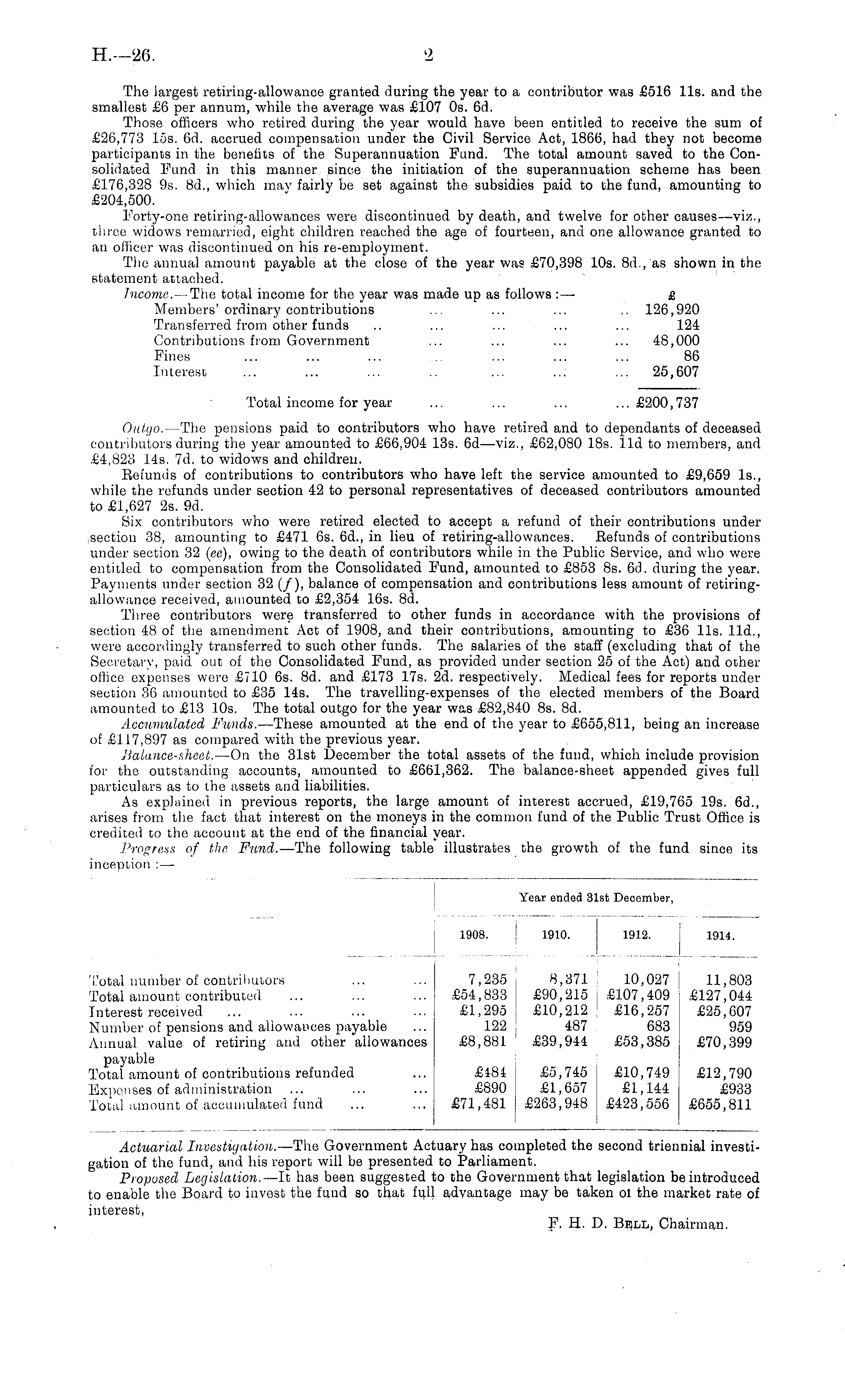 Year endod 31st December, 1908. 1910. 1912. 1914. i Total number of contributors Total amount contributed Interest received Number of pensions and allowances payable Annual value of retiring and other allowances payable Total amount of contributions refunded Expenses of administration Total amount of accumulated fund 7,285 | 8,371 10,027 I 11,803 £54,833 I £90,215 £107,409 £127,044 £1,295 ! £10,212 £16,257 £25,607 122 ; 487 683 959 £8,881 £39,944 £,53,385 £70,399 £484 £5,745 £10,749 £12,790 £890 £1,657 £1,144 £933 £71,481 £263,948 £423,556 £655,811