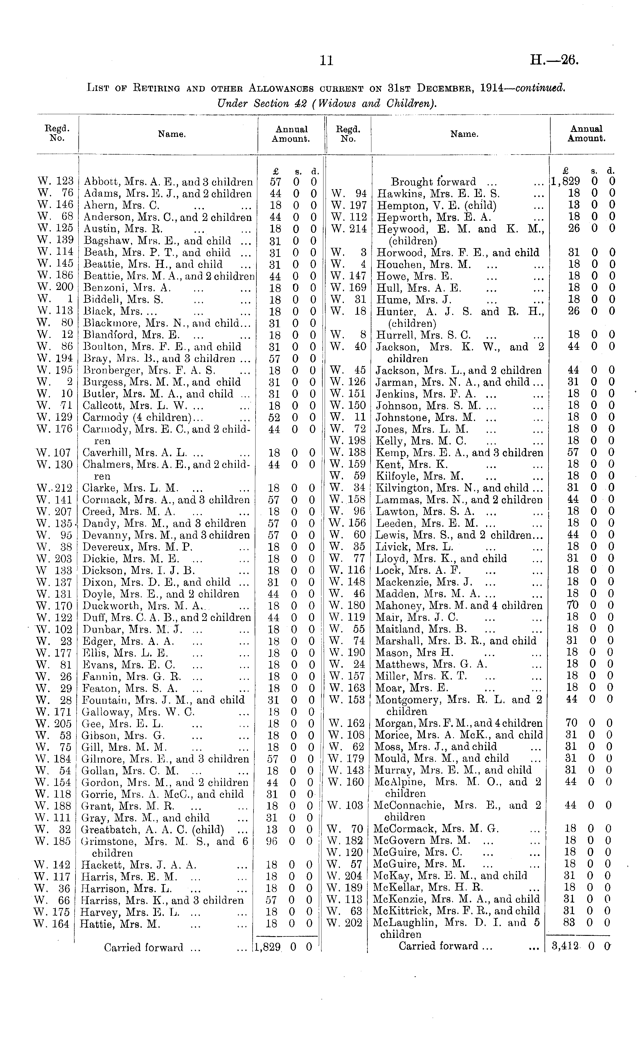 List of Retiring and other Allowances current on 31st December, 1914 — continued. Under Section 42 (Widows and Children).