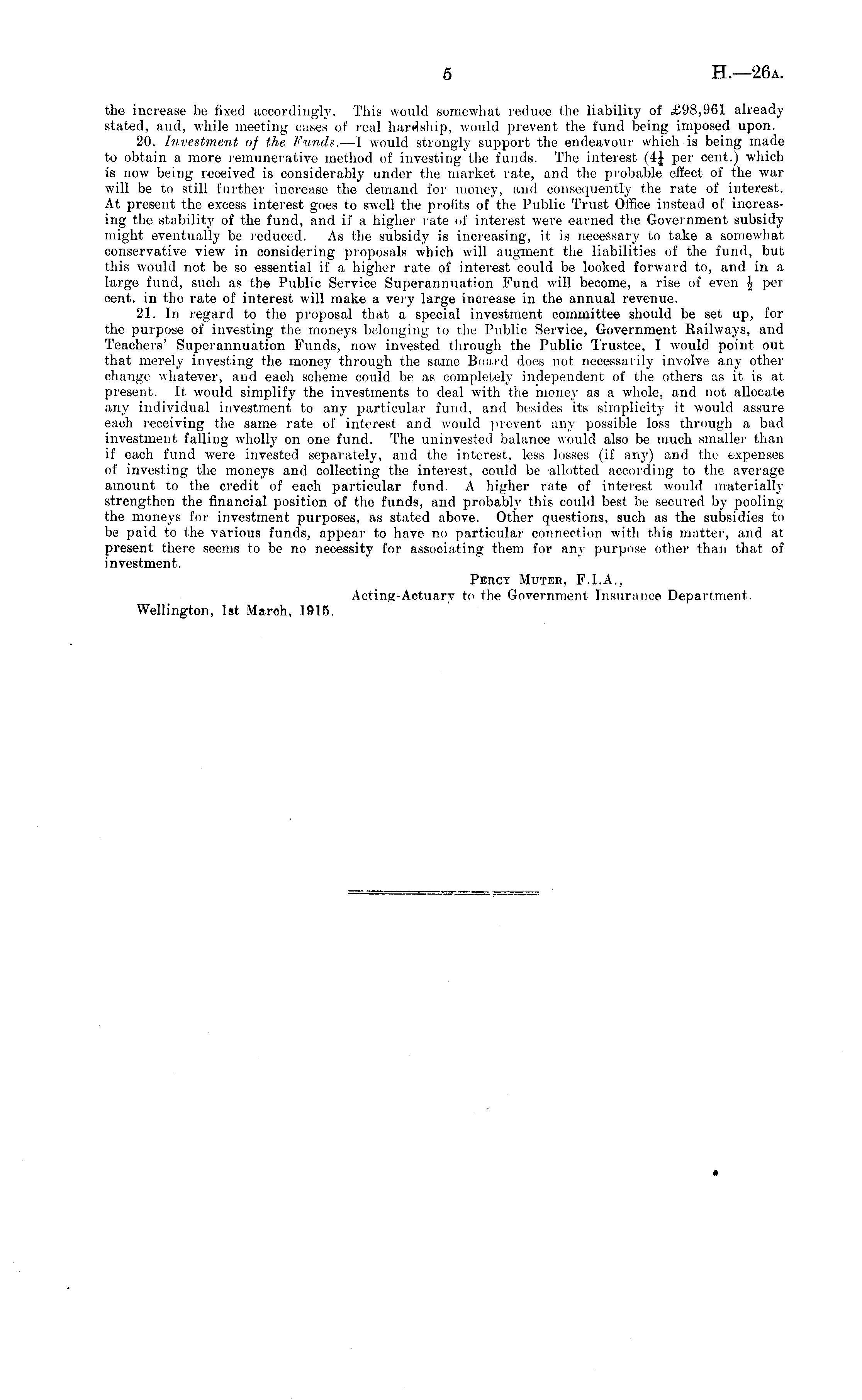 the increase be fixed accordingly. This would somewhat reduce the liability of £98,961 already stated, and, while meeting cases of real hardship, would prevent the fund being imposed upon. 20. Investment of the Funds. —l would strongly support the endeavour which is being made to obtain a more remunerative method of investing the funds. The interest (4| per cent.) which is now being received is considerably under the market rate, and the probable effect of the war will be to still further increase the demand for money, and consequently the rate of interest. At present the excess interest goes to swell the profits of the Public Trust Office instead of increasing the stability of the fund, and if a higher rate of interest were earned the Government subsidy might eventually be reduced. As the subsidy is increasing, it is necessary to take a somewhat conservative view in considering proposals which will augment the liabilities of the fund, but this would not be so essential if a higher rate of interest could be looked forward to, and in a large fund, such as the Public Service Superannuation Fund will become, a rise of even \ per cent, in the rate of interest will make a very large increase in the annual revenue. 21. In regard to the proposal that a special investment committee should be set up, for the purpose of investing the moneys belonging to the Public Service, Government Railways, and Teachers' Superannuation Funds, now invested through the Public Trustee, I would point out that merely investing the money through the same Board does not necessarily involve any other change whatever, and each scheme could be as completely independent of the others as it is at present. It would simplify the investments to deal with the money as a whole, and not allocate any individual investment to any particular fund, and besides its simplicity it would assure each receiving the same rate of interest and would prevent any possible loss through a bad investment falling wholly on one fund. The uninvested balance would also be much smaller than if each fund were invested separately, and the interest, less losses (if any) and the expenses of investing the moneys and collecting the interest, could be allotted according to the average amount to the credit of each particular fund. A higher rate of interest would materially strengthen the financial position of the funds, and probably this could best be secured by pooling the moneys for investment purposes, as stated above. Other questions, such as the subsidies to be paid to the various funds, appear to have no particular connection with this matter, and at present there seems to be no necessity for associating them for any purpose other than that of investment. Percy Muter, F.1.A., Acting-Actuary to the Government Insurance Department. Wellington, Ist March, 1915.