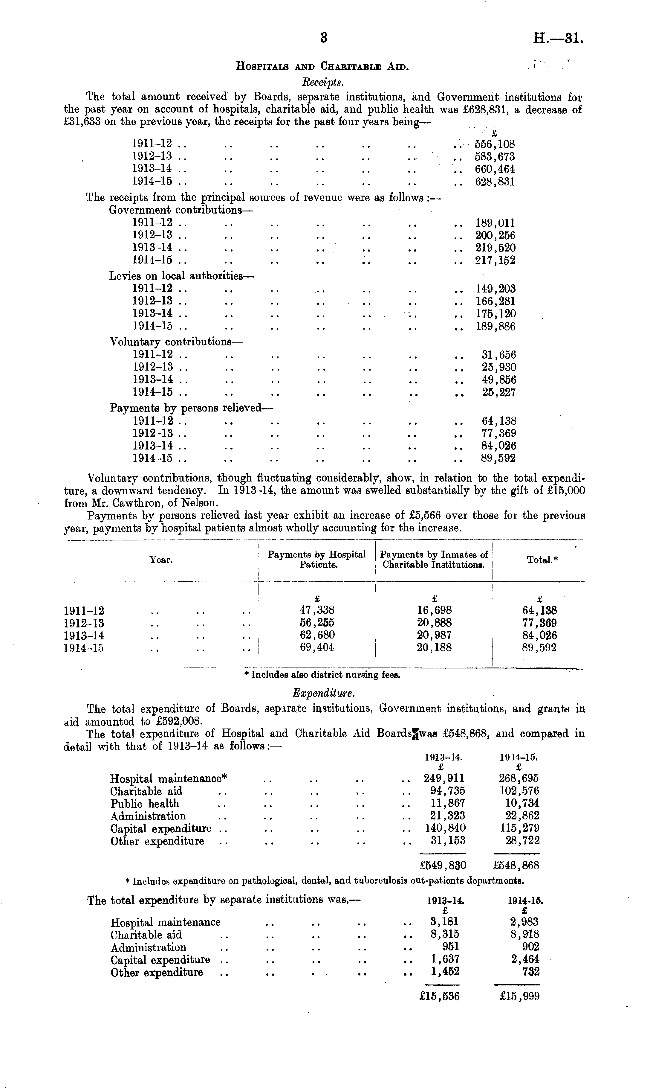 Hospitals and Charitable Aid. .11 Receipts. The total amount received by Boards, separate institutions, and Government institutions for the past year on account of hospitals, charitable aid, and public health was £628,831, a decrease of £31,633 on the previous year, the receipts for the past four years being— £ 1911-12 .. .. 556,108 1912-13 .. .. .. .. .. .. .. 583,673 1913-14 .. .. .. .. .. .. .. 660,464 1914-15 .. .. .. .. .. .. .. 628,831 The receipts from the principal sources of revenue were as follows :— Government contributions— 1911-12 .. .. 189,011 1912-13 .. .. .. .. .. .. .. 200,256 1913-14 .. .. .. .. .. .. .. 219,520 1914-15 .. .. .. .. .. .. .. 217,152 Levies on local authorities— 1911-12 .. .. .. ... .. .. .. 149,203 1912-13 .. .. .. .. .. .. .. 166,281 1913-14 .. .. .. .. .. .. .. 175,120 1914-15 .. .. .. .. .. .. .. 189,886 Voluntary contributions— 1911-12 .. .. .. .. .. .. .. 31,656 1912-13 .. .. .. .. .. .. .. 25,930 1913-14 .. .. .. .. .. .. .. 49,856 1914-15 .. .. .. .. .. .. .. 25,227 Payments by persons relieved— 1911-12 .. .. .. .. .. ~ .. 64,138 1912-13 .. .. .. .. .. .. .. 77,369 1913-14.. .. .. .. .. .. .. 84,026 1914-15 .. .. .. .. .. .. .. 89,592 Voluntary contributions, though fluctuating considerably, show, in relation to the total expenditure, a downward tendency. In 1913-14, the amount was swelled substantially by the gift of £15,000 from Mr. Cawthron, of Nelson. Payments by persons relieved last year exhibit an increase of £5,566 over those for the previous year, payments by hospital patients almost wholly accounting for the increase.