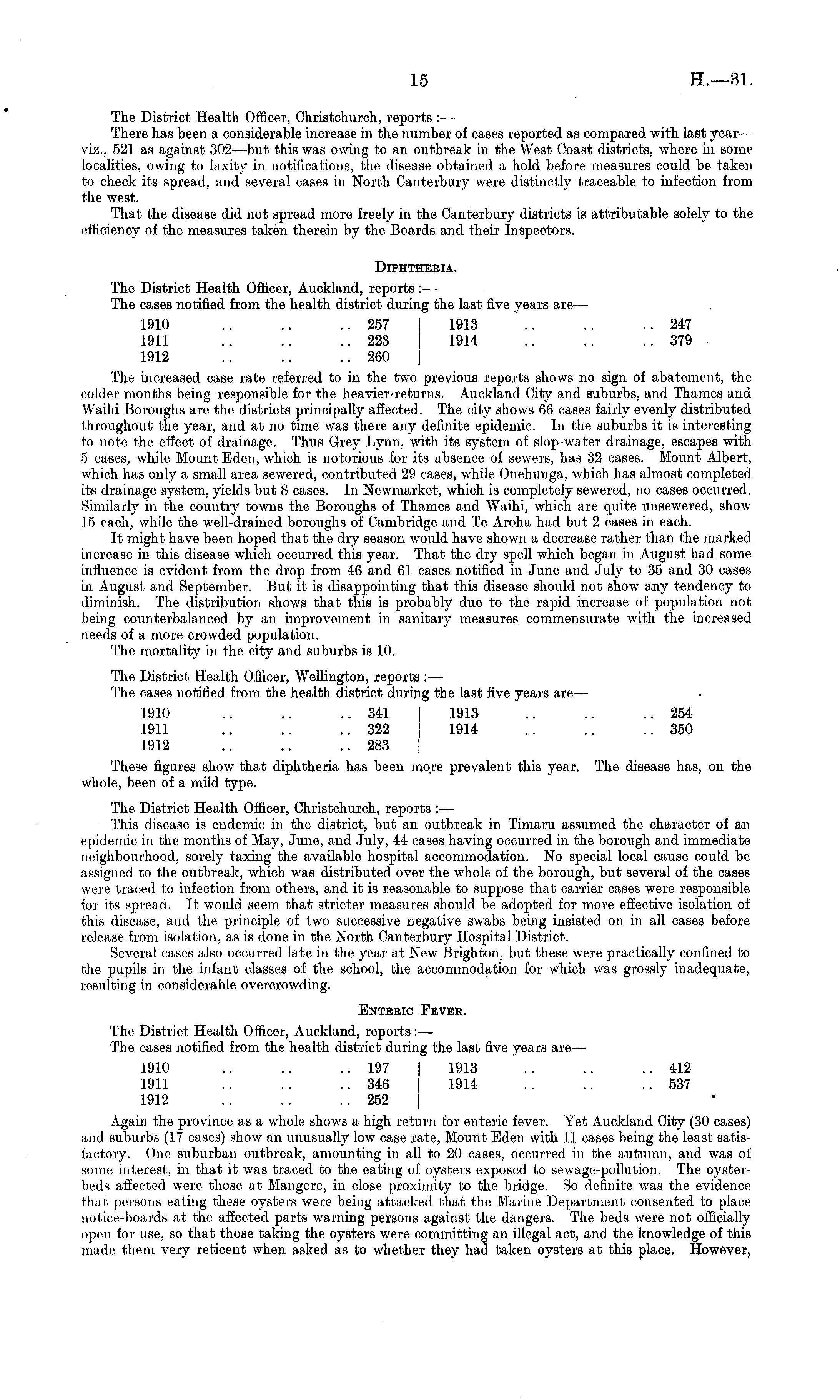 The District Health Officer, Christchurch, reports : — There has been a considerable increase in the number of cases reported as compared with last year — viz., 521 as against 302—but this was owing to an. outbreak in the West Coast districts, where in some localities, owing to laxity in notifications, the disease obtained a hold before measures could be taken to check its spread, and several cases in North Canterbury were distinctly traceable to infection from the west. That the disease did not spread more freely in the Canterbury districts is attributable solely to the efficiency of the measures taken therein by the Boards and their Inspectors. Diphtheria. The District Health Officer, Auckland, reports: — The cases notified from the health district during the last five years are — 1910 .. .. ..257 1913 .. .. ..247 1911 .. .. ..223 1914 .. .. ..379 1912 .. .. ..260 The increased case rate referred to in the two previous reports shows no sign of abatement, the colder months being responsible for the heavier-returns. Auckland City and suburbs, and Thames and Waihi Boroughs are the districts principally affected. The city shows 66 cases fairly evenly distributed throughout the year, and at no time was there any definite epidemic. In the suburbs it is interesting to note the effect of drainage. Thus Grey Lynn, with its system of slop-water drainage, escapes with 5 cases, while Mount Eden, which is notorious for its absence of sewers, has 32 cases. Mount Albert, which has only a small area sewered, contributed 29 cases, while, Onehunga, which has almost completed its drainage system, yields but 8 cases. In Newmarket, which is completely sewered, no cases occurred. Similarly in the country towns the Boroughs of Thames and Waihi, which are quite unsewered, show 15 each, while the well-drained boroughs of Cambridge and Te Aroha had but 2 cases in. each. It might have been hoped that the dry season would have shown a decrease rather than the marked increase in this disease which occurred this year. That the dry spell which began in August had some influence is evident from the drop from 46 and 61 cases notified in June and July to 35 and 30 cases in August and September. But it is disappointing that this disease should not show any tendency to diminish. The distribution shows that this is probably due to the rapid increase of population not being counterbalanced by an improvement in sanitary measures commensurate with the increased needs of a more crowded population. The mortality in the city and suburbs is 10. The District Health Officer, Wellington, reports :— The cases notified from the health district during the last five years are — 1910 .. .. ..341 | 1913 .. .. ..254 1911 .. .. ..322 | 1914 .. .. ..350 1912 .. .. ..283 These figures show that diphtheria has been more prevalent this year. The disease has, on the whole, been of a mild type. The District Health Officer, Christchurch, reports : — This disease is endemic in the district, but an outbreak in Timaru assumed the character of an epidemic in the months of May, June, and July, 44 cases having occurred in the borough and immediate neighbourhood, sorely taxing the available hospital accommodation. No special local cause could be assigned to the outbreak, which was distributed over the whole of the borough, but several of the cases were traced to infection from others, and it is reasonable to suppose that carrier cases were responsible for its spread. It would seem that stricter measures should be adopted for more effective isolation of this disease, and the principle of two successive negative swabs being insisted on in all cases before release from isolation, as is done in the North Canterbury Hospital District. Several cases also occurred late in the yea]' at New Brighton, but these were practically confined to the pupils in the infant classes of the school, the accommodation for which was grossly inadequate, resulting in considerable overcrowding. Enteric Fever. The District Health Officer, Auckland, reports : — The cases notified from the health district during the last five years are- - 1910 .. .. ..197 | 1913 .. .. ..412 1911 .. .. ..346 1914 .. .. ..537 1912 ...... 252 | Again the province as a whole shows a high return for enteric fever. Yet Auckland City (30 cases) and suburbs (17 cases) show an unusually low case rate, Mount Eden with II cases being the least satisfactory. One suburban outbreak, amounting in all to 20 cases, occurred in the autumn, and was of some interest, in that it was traced to the eating of oysters exposed to sewage-pollution. The oysterbeds affected were those at Mangere, in close proximity to the bridge. So definite was the evidence that persons eating these oysters were being attacked that the Marine Department consented to place notice-boards at the affected parts warning persons against the dangers. The beds were not officially open for use, so that those taking the oysters were committing an illegal act, and the knowledge of this made them very reticent when asked as to whether they had taken oysters at this place. However,