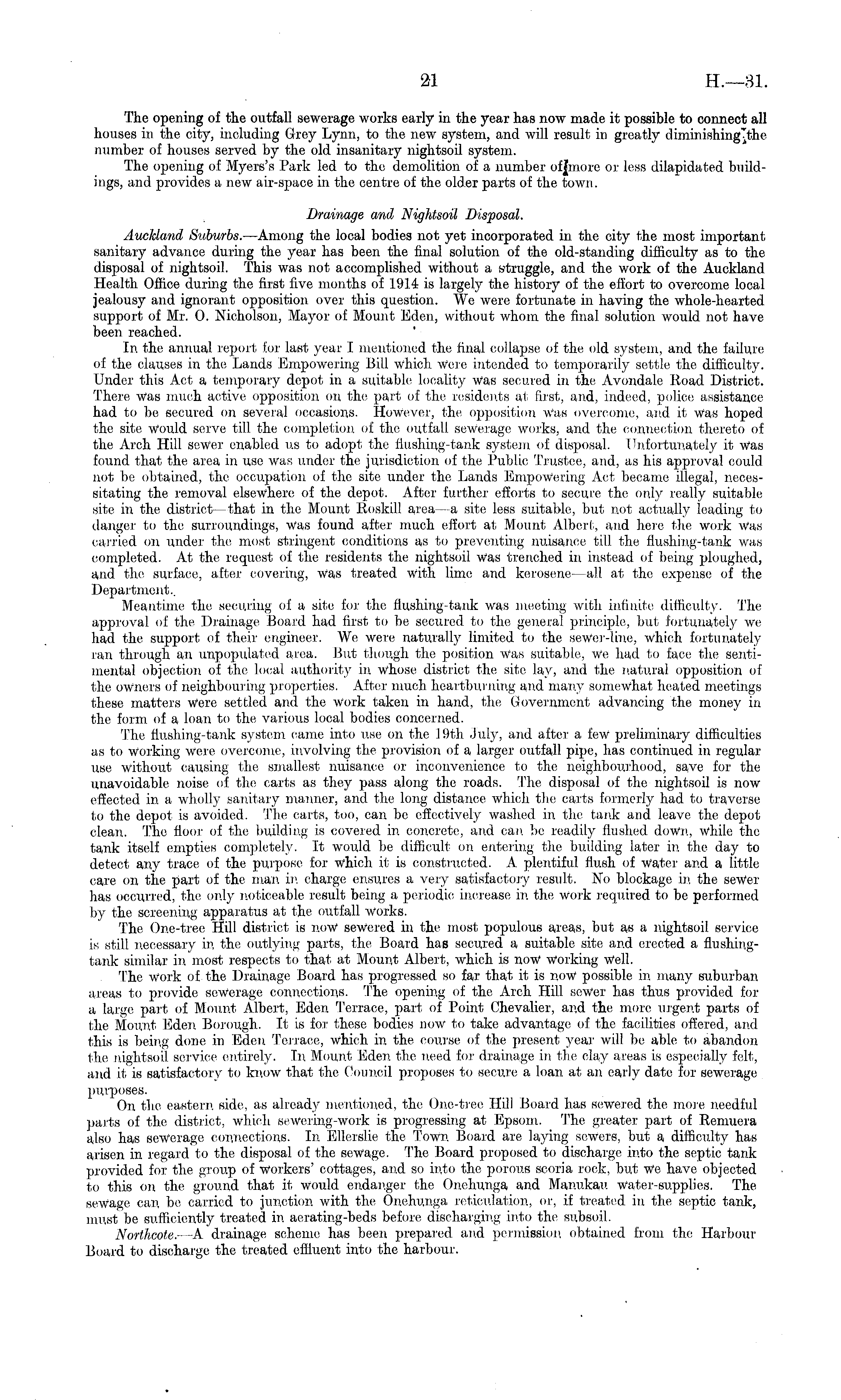 The opening of the outfall sewerage works early in the year has now made it possible to connect all houses in the city, including Grey Lynn, to the new system, and will result in greatly number of houses served by the old insanitary nightsoil system. The opening of Myers's Park led to the demolition of a number of|more or less dilapidated buildings, and provides a new air-space in the centre of the older parts of the town. Drainage and Nightsoil Disposal. Auclcland Suburbs. —Among the local bodies not yet incorporated in the city the most important sanitary advance during the year has been the final solution of the old-standing difficulty as to the disposal of nightsoil. This was not accomplished without a struggle, and the work of the Auckland Health Office during the first five months of 1914 is largely the history of the effort to overcome local jealousy and ignorant opposition over this question. We were fortunate in having the whole-hearted support of Mr. 0. Nicholson, Mayor of Mount Eden, without whom the final solution would not have been reached. In the annual report for last year I mentioned the final collapse of the old system, and the failure of the clauses in the Lands Empowering Bill which Were intended to temporarily settle the difficulty. Under this Act a temporary depot in a suitable; locality was secured in the Avondale Road District. There was much active opposition on the part of the residents at first, and, indeed, police assistance had to be secured on several occasions. However, the opposition was overcome, and it was hoped the site Would serve till the completion of the outfall, sewerage works, and the connection thereto of the Arch Hill sewer enabled us to adopt the flushing-tank system of disposal. Unfortunately it was found that the area in use was under the jurisdiction of the Public Trustee, and, as his approval could not be obtained, the occupation of the site under the Lands Empowering Act became illegal, necessitating the removal elsewhere of the depot. After further efforts to secure the only really suitable site in the that in the Mount Roskill area —a site less suitable, but not actually loading to danger to the surroundings, was found after much effort at Mount Albert, and here the work Was carried on under the most stringent conditions as to preventing nuisance till the flushing-tank was completed. At the request of the residents the nightsoil was trenched in instead of being ploughed, and the surface, after covering, was treated with lime and kerosene —all at the expense! of the Department.. Meantime! the securing of a site for the Hushing-tank was meeting with infinite difficult) - . The approval of the Drainage Board had first to be secured to the genera] principle, but fortunately we had the support of their engineer. We were naturally limited to the sewer-line, which fortunately ran through an unpopulated area. lint though the position, was suitable, we had to face the sentimental objection of the local authority in whose district the site lay, and the natural opposition of the owners of neighbouring properties. After much heartburning and many somewhat heated meetings these matters Were settled and the work taken in hand, the Government advancing the money in the form of a loan to the various local bodies concerned. The flushing-tank system came into use on the 19th July, and after a few 1 preliminary difficulties as to working were overcome, involving the provision of a larger outfall pipe, has continued in regular use without causing the smallest nuisance or inconvenience to the neighbourhood, save for the unavoidable noise of the carts as they pass along the roads. The disposal of the nightsoil is now effected in. a wholly sanitary manner, and the long distance which the carts formerly had to traverse to the depot is avoided. The carts, too, can be effectively washed in the tank and leave the depot clean. The floor of the building is covered in concrete, and can be readily flushed down, while the tank itself empties completely. It would be difficult on entering the building later in the day to detect any trace of the purpose for which it is constructed. A plentiful flush of water and a little care on the part of the man. in charge ensures a very satisfactory result. No blockage in the seWer has occurred, the only noticeable result being a periodic increase in the work required to be performed by the screening apparatus at the outfall Works. The One-tree Hill district is now sewered in the most populous areas, but as a nightsoil service is still necessary in the outlying parts, the Board has secured a suitable site and erected a flushingtank similar in most respects to that at Mount Albert, which is now working Well. The Work of the Drainage Board has progressed so far that it is now possible in. many suburban areas to provide sewerage connections. The opening of the Arch Hill sower has thus provided for a large part of Mount Albert, Eden Terrace, part of Point Chevalier, and the more urgent parts of the Mount Eden Borough. It is for these bodies now to take advantage of the facilities offered, and this is being done in Eden Terrace, which in the course of the present year will be able to abandon the nightsoil service entirely. In Mount Eden the need for drainage in the clay areas is especially felt, and it is satisfactory to know that the Council proposes to secure a loan at an early date for sewerage purposes. On the eastern side, as already mentioned, the One-tree Hill Board has sewered the more needful parts of the district, which sewering-work is progressing at Epsom. The greater part of Remuera also has sewerage connections. In Ellerslie the Town Board are laying sewers, but a difficulty has arisen in regard to the disposal of the sewage. The Board proposed to discharge into the septic tank provided for the group of workers' cottages, and so into the porous scoria rock, but we have objected to this on the ground that it would endang
