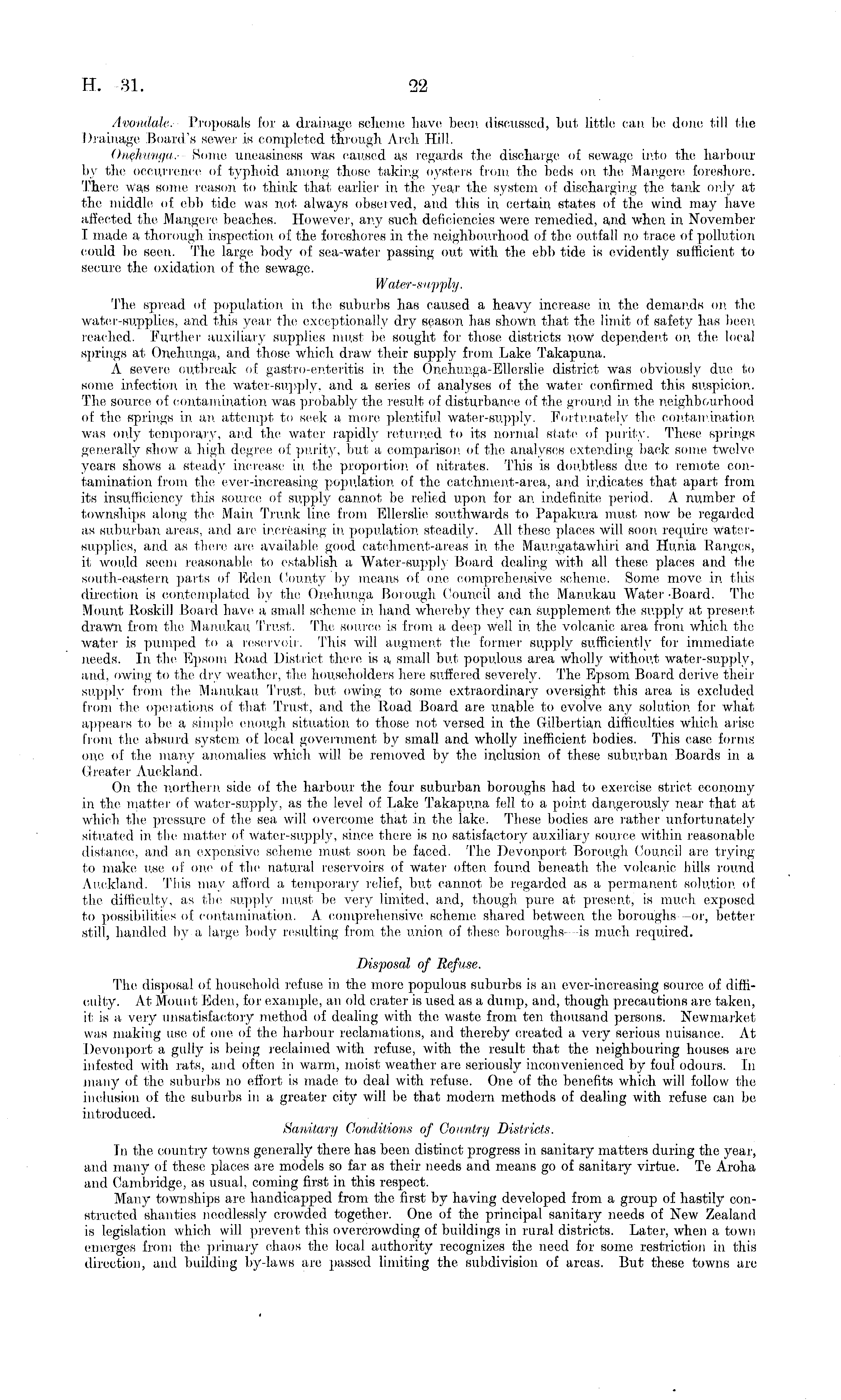 Avondale. Proposals for a drainage scheme have been discussed, but little can. be done till the Drainage Board's sower is completed through Arch Hill. Onehunga.- Some uneasiness Was caused as regards the discharge of sewage into the harbour by the occurrence! eif typherid among those taking oysters from the beds on the Mangere foreshore. There was se>me reason to thirds: that earlier in the year the system of discharging the tank only at the middle eif ebb tide was not always observed, and this in certain states of the wind may have affected the Mangere beae!hcs. However, any such deficiencies Were remedied, and when in November I made a thorough inspection of the foreshores in the neighbourhood of the outfall no trrace of pollution e;ould be seen. The large body of sea-water passing out with the ebb tide is evidently sufficient te> secure the oxidatiem of the sewage. Water-supply. The spread e>f peculation, in the suburbs has caused a heavy increase in the demands on the Water-supplies, and this year the exceptionally dry seasem has shewn that the limit of safety has been reached. Further auxiliary supplies must be sought for those districts new dependent on the local springs at Onehunga, and those which draw their supply from Lake Takapuna. A severe outbreak eif gastro-enteritis in the Onehunga-Ellerslie district was eibviously due' to some infection in the water-supply, and a series of analyses of the water confirmed this suspicion. The source of contamination was probably the result of disturbance of the ground in the neighbourhoeiei of the springs in an attempt te> seek a more plentiful water-supply. Fortunately the contamination was only temporary, and the- water rapidly returned to its normal state of purity. These' springs generally shew a high degree of purity, but a comparison of the analyses extending back seiine twelve years shows a steady increase in. the proportion of nitrates. This is doubtless due to remote contamination from the ever-increasing population e>f the catchment-area, and indicates that apart from its insufficiency this source of supply cannot be relied upon for an indefinite period. A number of townships along the Main Trunk line from Ellerslie southwards to Papakura must new be regarded as suburban areas, and are increasing in population steadily. All these places will soon require Watersupplies, and as there arc available goe>d catchment-areas in. the Maungatawhiri and Hunia Ranges, it would seem reasonable to establish a Water-supply Board dealing with all these plains and the south-eastern parts of Eden County by means of one comprehensive scheme. Some move in this direction is contemplated by the Onehunga Borough Council and the Manukau Water 'Board. The Mount Roskill Board have! a small scheme in, hand whereby they can supplement the supply at present drawn from the Manukau Trust. The; source is from a deep well in. the volcanic area from which the water is pumped to a reservoir. This will augment the former supply sufficiently for immediate needs. In the Epsom Road District there is a small but populous area wholly without water-supply, and, owing to the dry weather, the householders here suffered severely. The Epsom Board derive their supply from the Manukau Trust, but owing to some extraordinary oversight this aiea is excluded from the operations of that Trust, and the Road Board are unable to evolve any solution fe>r what appears to be a simple enough situation to those not versed in the, Gilbertian difficulties Which arise; from the absurd system of local government by small and wholly inefficient bodies. This case forms one of the many anomalies which will be removed by the inclusion e>f these suburban Boards in a Greater Auckland. On the northern side e>f the harbour the four suburban boroughs had to exercise strict economy in the matter of water-supply, as the level of Lake Takapuna fell to a point dangerously near that at which the pressure of the sea will overcome that in the lake. These bodies are rather unfortunately situated in the matter e>f water-supply, since there is no satisfactory auxiliary source within reasemable distance, and an expensive scheme must soon be faced. The Devonpe>rt Borough Council are trying to make! use eif one of the natural reservoirs e>f Water often, found beneath the volcanic hills round Auckland. This may affeird a temporary relief, but cannot be regarded as a permanent solution of the difficulty, as the supply must be very limited, and, though pure at present, is much exposed to possibilities of contamination. A. comprehensive scheme shared between the boroughs or, better still, handleel by a large body resulting from the union of these boroughs—is much required. Disposal of Refuse. The disposal of household refuse in the more populous suburbs is an ever-increasing source of difficulty. At Mount Eden, for example, an old crater is used as a dump, and, though precautions arc taken, it is a very unsatisfactory method e>f dealing with the waste from ten themsanel persons. Newmarket was making use of one eif the harbour reclamations, and thereby creatcel a very serious nuisance. At Devonport a gully is being reclaimed with refuse, with the result that the neighbouring heiuses arc infested with rats, and often in warm, moist weather are seriously inconvenienced by foul odours. In many of the suburbs no effort is made te> deal with refuse. One of the benefits whie;h will follow the! inclusion of the suburbs in a greater city will be that modern methods eif dealing with refuse can be introduced. Sanitary Conditions of Country Districts. In the country towns generally there has been distinct progress in sanitary matters during the year, and many of these places are models so far as their needs and means go of sanitary virtue. Te Aretha and Cambridge, as usual, coming first in this respect. Many town ships are handicapped from the first by having developed from a group of hastily constructed shanties needlessly crowd