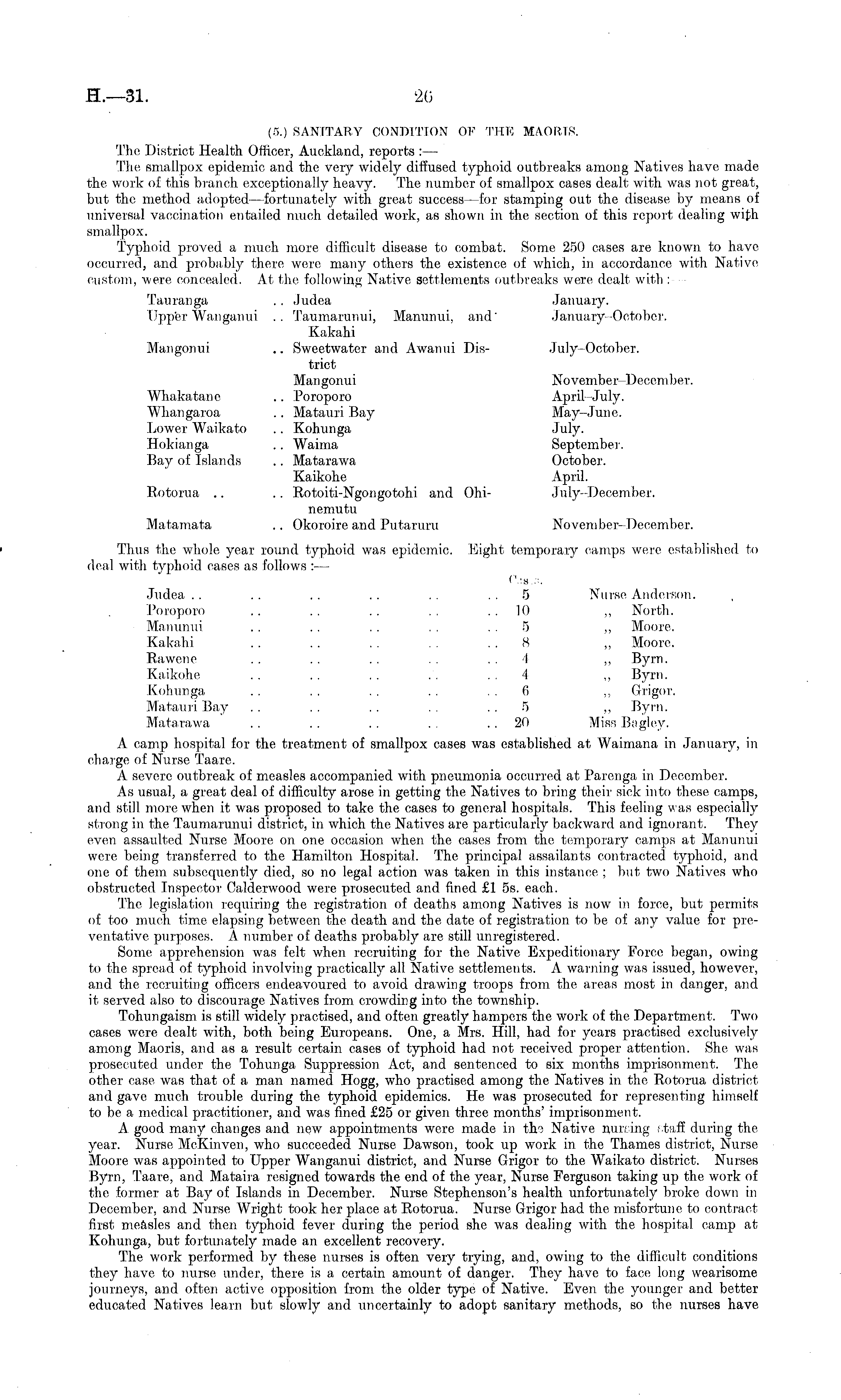 (8.) SANITARY CONDITION OF THE MAORIS. The District Health Officer, Auckland, reports : — The smallpox epidemic and the very widely diffused typhoiel outbreaks among Natives have made the work of this branch exceptionally heavy. The number of smallpox cases dealt with was not great, but the method adopted —fortunately with great success —for stamping out the disease by means of universal vaccination entailed much detailed work, as shown in the section of this report elealing with smallpox. Typhoid proved a much more difficult disease to combat. Some 250 cases are known to have occurred, and probably there were many others the existence of which, in accordance with Native! custom, were concealed. At the following Native settlements outbreaks were dealt with : — Tauranga . . Judea January. Upper Wanganui .. Taumarunui, Manunui, and' January-October. Kakahi Mangonui .. Sweetwater and Awanui Dis- July-October, trict Mangonui November-December. Whakatane .. Poroporo April July. Whangaroa .. Matauri Bay May-June. Lower Waikato .. Keihunga July. Hokianga .. Waima September. Bay of Islands .. Matarawa October. Kaikohe April. Rotorua .. .. Rotoiti-Ngongotohi and Ohi- July-December. nemutu Matamata .. Okoroire and Putaruru November-December. Thus the whole year round typhoid was epidemic. Eight temporary camps were established to deal with typhoid cases as follows : — C.-.a n. Judea .. .. .. .. .. . . 5 Nurse Anderson. Poroporo .. .. ~ .. ..10 ~ North. Manunui .. .. .. .. ~ 5 ~ Moore. Kakahi . . . . . . . . . . 8 ~ Moore. Rawene . . . . . . . . . . I ~ Byrn. Kaikeihe . . . . . . .'. 4 ~ Byrn. Keihunga . . . . . . . . 6 ~ Grigor. Matauri Bay .. . . ~ , . .. 5 ~ Byrn. Matarawa .. .. .. .. .. 20 Miss Bagley. A camp hospital for the treatment of smallpox cases was established at Waimana in January, in charge of Nurse Taare. A severe outbreak of measles accompanied with pneumonia occurred at Parenga in December. As usual, a great deal of difficulty arose in getting the Natives to bring their sick intei these camps, and still more when it was proposed to take the cases to general hospitals. This feeling was especially strong in the Taumarunui district, in which the Natives are particularly backward and ignorant. They even assaulted Nurse, Moore on one occasion when the cases from the temporary camps at Manunui were being transferreel to the Hamilton Hospital. The principal assailants contracted typhoid, and one of them subsequently died, so no legal action was taken in this instance,; but two Natives who obstructed Inspector Calderwood were prosecuted and fined £1 ss. each. The legislation requiring the registration of deaths among Natives is now in force, but permits of too much time elapsing between the death and the, date of registration to lie of any value for preventative purposes. A number of deaths probably are still unregistered. Some apprehension was felt when recruiting for the Native Expeditionary Force began, owing to the spread of typhoiel involving practically all Native settlements. A warning was issued, however, and the, recruiting officers endeavoured to avoid drawing troops from the areas most in danger, and it served also to discourage Natives from crowding into the township. Tohungaism is still widely practised, and often greatly hampers the work of the Department. Two cases were dealt with, both being Europeans. One, a Mrs. Hill, had for years practised exclusively among Maoris, and as a result certain cases of typhoid had not received proper attention. She was prosecuted under the Tohunga Suppression Act, and sentenced to six months imprisonment. The other case was that of a man named Hogg, who practised among the Natives in the Rotorua district and gave much trouble during the typhoid epidemics. He was prosecuted for representing himself to be a medical practitioner, and was fined £25 or given three months' imprisonment. A good many changes and new appointments were made in tha Native nurting staff during the year. Nurse McKinven, who succeeded Nurse Dawson, took up work in the Thames district, Nurse Moore was appointed to Upper Wanganui district, and Nurse Grigor to the Waikato district. Nurses Byrn, Taare, and Mataira resigned towards the end of the year, Nurse Ferguson taking up the work of the former at Bay of Islands in December. Nurse Stephenson's health unfortunately broke down in December, and Nurse Wright took her place at Rotorua. Nurse Grigor had the misfortune tei contract first measles and then typhoid fever during the period she was dealing with the hospital, camp at Kohunga, but fortunately made an excellent recovery. The work performed by these nurses is often very trying, and, owing to the difficult conditions they have to nurse under, there is a certain amount of danger. They have to face long wearisome journeys, and often active opposition from the older type of Native. Even the younger and better educated Natives learn but slowly and uncertainly to adopt sanitary methods, so the nurses have