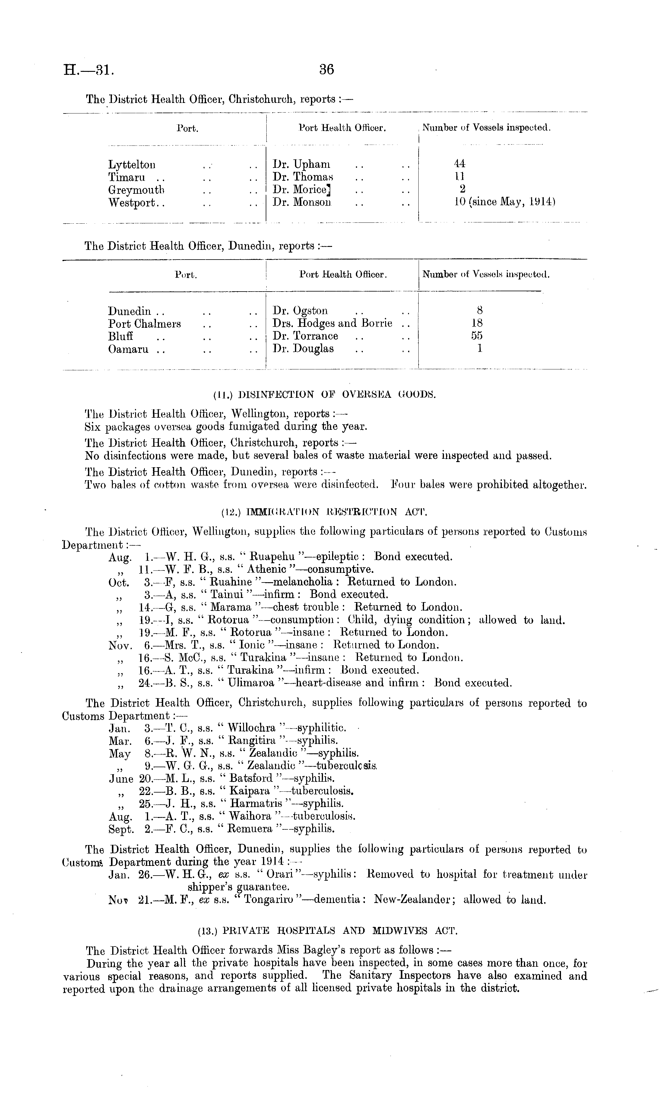 Port. Lytteltoo Timaru Greymouth Westport.. Port Health Officer. Dr. Upham Dr. Thomas .. Dr. MorioeJ Dr. Monson Number of Vessels inspected. I 44 11 2 10 (since May, 1914)
