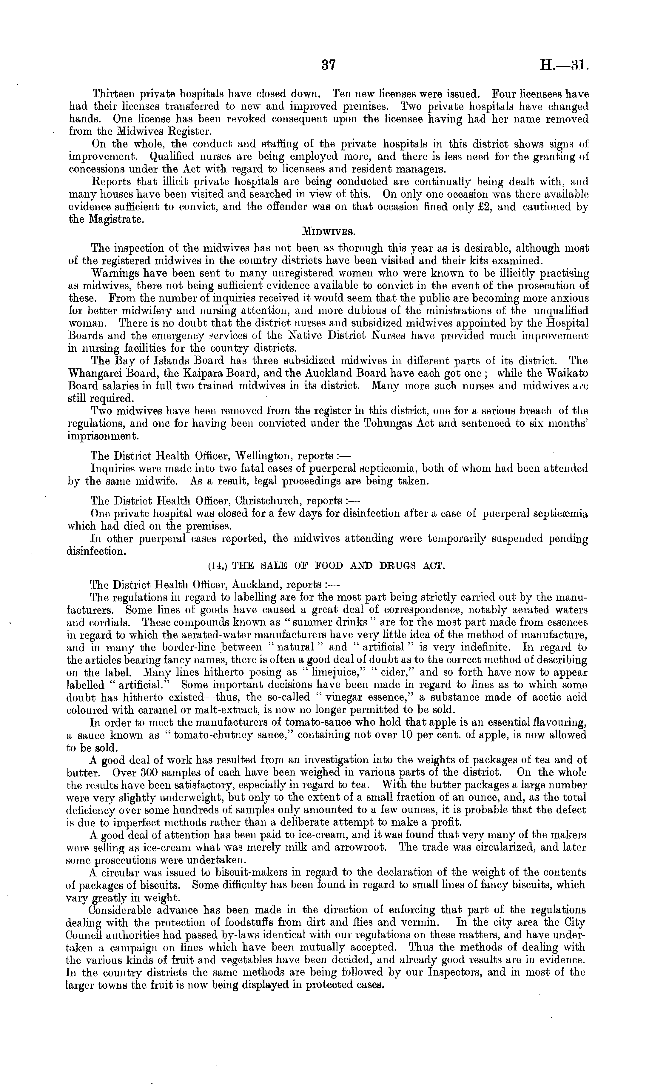Thirteen private hospitals have closed down. Ten new licenses were issued. Four licensees have had their licenses transferred to new and improved premises. Two private hospitals have changed hands. One license has been revoked consequent upon the licensee having had her name removed from the Midwives Register. On the whole, the conduct and staffing of the private hospitals in this district shows signs of improvement. Qualified nurses are being employed more, and there is less need for the, granting of concessions under the Act with regard to licensees and resident managers. Reports that illicit private hospitals are being conducted, are continually being dealt with, and many houses have been visited and searched in view of this. On only one occasion was there available evidence sufficient to convict, and the offender was on that occasion fined only £2, and cautioned by the Magistrate. Midwives. The inspection of the midwives has not been as thorough this year as is desirable, although most of the registered midwives in the country districts have been visited and their kits examined. Warnings have been sent to many unregistered women who were known to be illicitly practising as midwives, there not being sufficient evidence available to convict in the event of the prosecution of these. From the number of inquiries received it would seem that the public are becoming more anxious for better midwifery and nursing attention, and more dubious of the ministrations of the unqualified woman. There is no doubt that the district nurses and subsidized midwives appointed by the Hospital Boards and the emergency services of the Native District Nurses have provided much improvement in nursing facilities for the country districts. The Bay of Islands Board has three subsidized midwives in different parts of its district. The Whangarei Board, the Kaipara Board, and the Auckland Board have each got one ; while the Waikato Board salaries in full two trained midwives in its district. Many more such nurses and midwives are still required. Two midwives have been removed from the register in this district, one for a serious breach of the regulations, and one for having been convicted under the Tohungas Act and sentenced to six months' imprisonment. The District Health Officer, Wellington, reports : — Inquiries were made into two fatal cases of puerperal septicaemia, both of whom had been attended by the same midwife. As a result, legal proceedings are being taken. The District Health Officer, Christchurch, reports :— One private hospital was closed for a few days for disinfection after a case of puerperal septicaemia which had died on the premises. In other puerperal cases reported, the midwives attending were temporarily suspended pending disinfection. (14.) THE SALE OP POOD AND DRUGS ACT. The District Health Officer, Auckland, reports : — The regulations in regard to labelling are for the most part being strictly carried out by the manufacturers. Some lines of goods have caused a great deal of correspondence, notably aerated waters and cordials. These compounds known as " summer drinks " are for the most part made from essences in regard to which the aerated-water manufacturers have very little idea of the method of manufacture, and in many the border-line between " natural" and " artificial "is very indefinite. In regard to the articles bearing fancy names, there is often a good deal of doubt as to the correct method of describing on the label. Many lines hitherto posing as " limejuice," " cider," and so forth have now to appear labelled " artificial." Some important decisions have been made in regard to lines as to which some doubt has hitherto existed —thus, the so-called " vinegar essence," a substance made of acetic acid coloured with caramel or malt-extract, is now no longer permitted to be sold. In order to meet the manufacturers of tomato-sauce who hold that apple is an essential flavouring, a sauce known as " tomato-chutney sauce," containing not over 10 per cent, of apple, is now allowed to be sold. A good deal of work has resulted from an investigation into the weights of packages of tea and of butter. Over 300 samples of each have been weighed in various parts of the district. On the whole the results have been satisfactory, especially in. regard to tea. With the butter packages a large number were very slightly underweight, but only to the extent of a small fraction of an ounce, and, as the total deficiency over some hundreds of samples only amounted to a few ounces, it is probable that the defect is due to imperfect methods rather than a deliberate attempt to make a profit. A good deal of attention has been paid to ice-cream, and it was found that very many of the makers were selling as ice-cream what was merely milk and arrowroot. The trade was circularized, and later some prosecutions were undertaken. A circular was issued to biscuit-makers in regard to the declaration of the weight of the contents of packages of biscuits. Some difficulty has been found in regard to small lines of fancy biscuits, which vary greatly in weight. Considerable advance has been made in the direction of enforcing that part of the regulations dealing with the protection of foodstuffs from dirt and flies and vermin. In the city area the City Council authorities had passed by-laws identical with our regulations on these matters, and have undertaken a campaign on lines which have been mutually accepted. Thus the methods of dealing with the various kinds of fruit and vegetables have been decided, and already good results are in evidence. In the country districts the same methods are being followed by our Inspectors, and in most of the larger towns the fruit is now being displayed in protected cases.