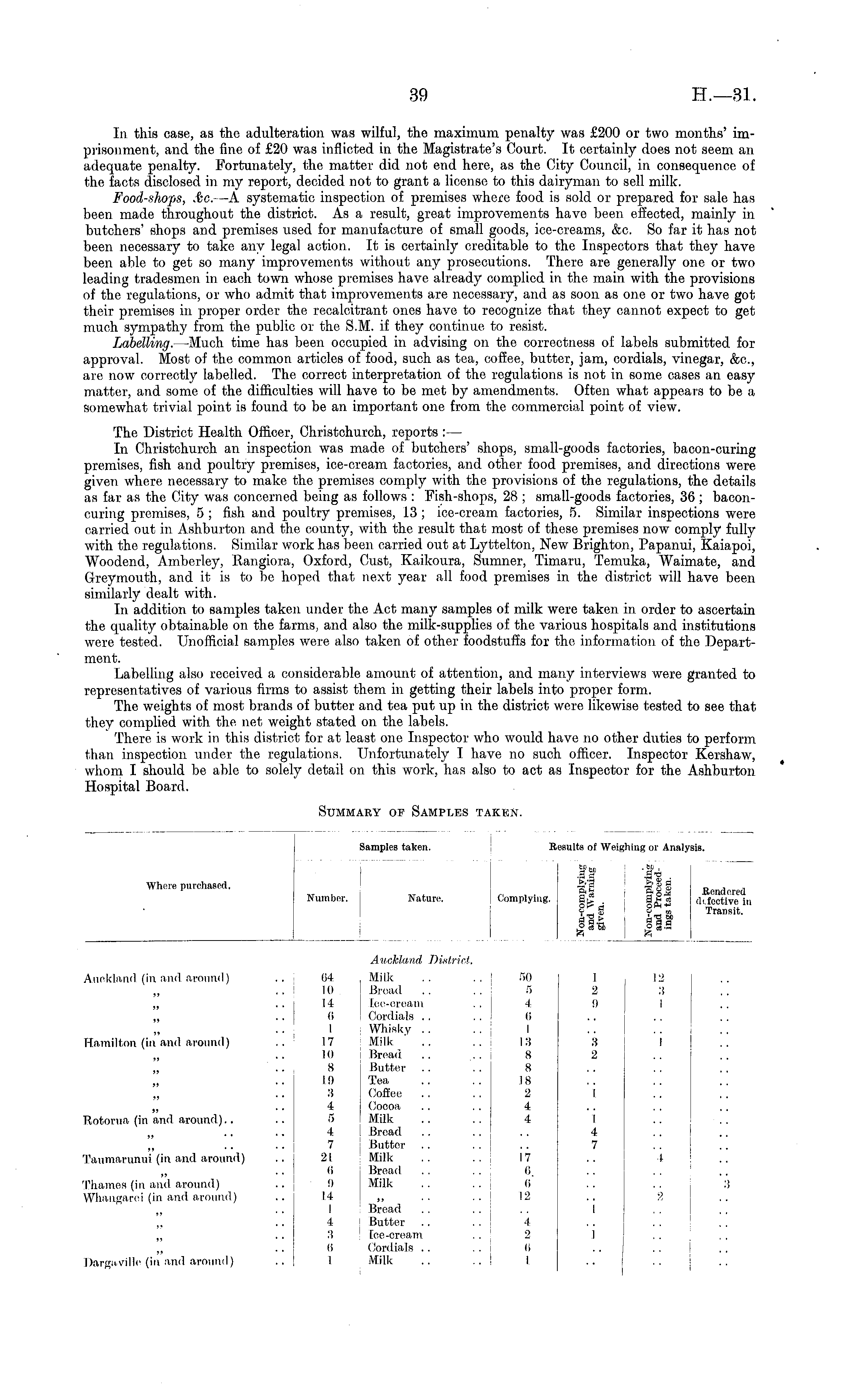 In this case, as the adulteration was wilful, the maximum penalty was £200 or two months' imprisonment, and the fine of £20 was inflicted in the Magistrate's Court. It certainly does not seem an adequate penalty. Fortunately, the matter did not end here, as the City Council, in consequence of the facts disclosed in my report, decided, not to grant a license to this dairyman to sell milk. Food-shops, &c. —A systematic inspection of premises where food is sold or prepared for sale has been made throughout the district. As a result, great improvements have been effected, mainly in butchers' shops and premises used for manufacture of small goods, ice-creams, &c. So far it has not been necessary to take any legal action. It is certainly creditable to the Inspectors that they have been able to get so many improvements without any prosecutions. There are generally one or two leading tradesmen in each town whose premises have already complied in the main with the provisions of the regulations, or who admit that improvements are necessary, and as soon as one or two have got their premises in proper order the recalcitrant ones have to recognize that they cannot expect to get much sympathy from the public or the S.M. if they continue, to resist. Labelling. —Much time has been occupied in. advising on the correctness of labels submitted for approval. Most of the common articles of food, such as tea, coffee, butter, jam, cordials, vinegar, &c, arc now correctly labelled. The correct interpretation of the regulations is not in some cases an easy matter, and some of the difficulties will have to be met by amendments. Often what appears to be a somewhat trivial point is found to be an important one from the commercial point of view. The District Health Officer, Christchurch, reports : — In Christchurch an inspection was made of butchers' shops, small-goods factories, bacon-curing premises, fish and poultry premises, ice-cream factories, and other food premises, and directions were given where necessary to make the premises comply with the provisions of the regulations, the details as far as the City was concerned being as follows : Fish-shops, 28 ; small-goods factories, 36 ; baconcuring premises, 5 ; fish and poultry premises, 13 ; ice-cream factories, 5. Similar inspections were carried out in Ashburton and the county, with the result that most of these premises now comply fully with the regulations. Similar work has been carried out at Lyttelton, New Brighton, Papanui, Kaiapoi, Woodend, Amberley, Rangiora, Oxford, Cust, Kaikoura, Sumner, Timaru, Temuka, Waimate, and Greymouth, and it is to be hoped that next year all food premises in the district will have been similarly dealt with. In addition to samples taken under the Act many samples of milk were taken in order to ascertain the quality obtainable on the farms, and also the milk-supplies of the various hospitals and institutions were tested. Unofficial samples were also taken of other foodstuffs for the, information of the Department. Labelling also received a considerable amount of attention, and many interviews were granted to representatives of various firms to assist them in getting their labels into proper form. The weights of most brands of butter and tea put up in the district were likewise tested to see that they complied with the net weight stated on the labels. There is work in this district for at least one Inspector who would have no other duties to perform than inspection, under the regulations. Unfortunately I have no such officer. Inspector Kershaw, whom I should be able to solely detail on this work, has also to act as Inspector for the Ashburton. Hospital Board.