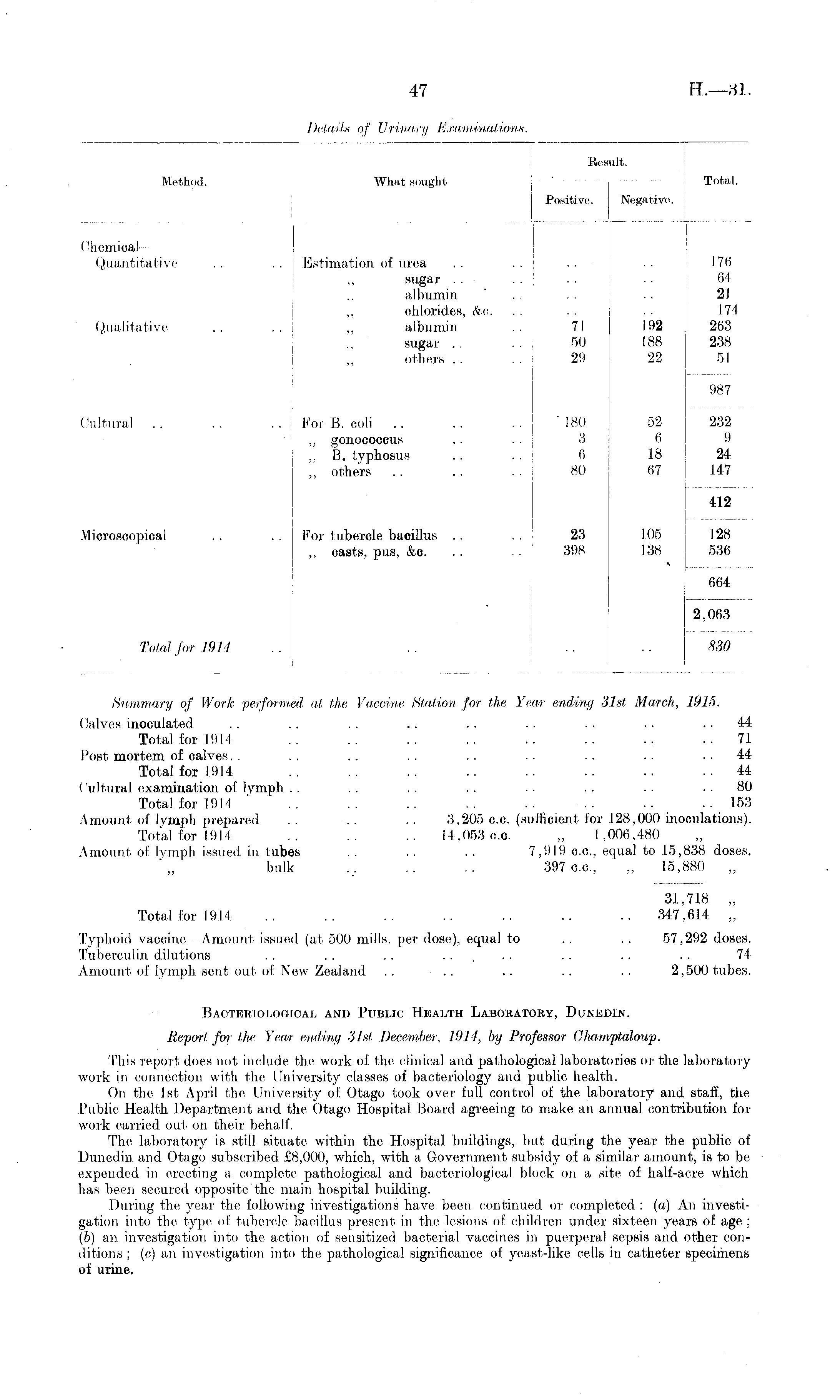 Summary of Work performed at the Vaccine Station for the Year ending 31st March, 1915. Calves inoculated . . .. . . . . . . . . .. • • 44 Total for 1914 .. .. .. .. .. .. .. ..71 Post mortem of calves. . . . .. . . . . . . . . . . .. 44 Total for 1914 .. .. .. .. .. ..44 Cultural examination of lymph . . .. . . . . . . . . . . 80 Total for 1914 .. .. .. .. .. .. .. ..153 Amount of lymph prepared .. .. 3,205 0.0. (sufficient for 128,000 inoculations). Total for 1914 .. .. .. 14,053 0.0. „ 1.006.480 Amount of lymph issued in tubes .. .. .. 7,919 0.0., equal to 15,838 doses. bulk ... .. .. 3970.0., „ 1.5,880 „ 31,718 „ Total for 1914 .. .. .. .. .. .. .. 347,614 „ Typhoid vaccine-Amount issued (at 500 mills, per dose), equal to .. . . 57,292 doses. Tuberculin dilutions . . . . . . ..... . . . . . . 74 Amount of lymph sent out of New Zealand .. .. .. .. .. 2,500 tubes. Bacteriological and Public Health Laboratory, Dunedin. Report, for the Year ending 31st December, 1911, by Professor Champtaloup. This report does not include the work of the clinical and pathological laboratories or the laboratory work in connection with the University classes of bacteriology and public health. On the Ist April the University of Otago took over full control of the laboratory and staff, the Public Health Department and the Otago Hospital Board agreeing to make an annual contribution for work carried out on their behalf. The laboratory is still situate within the Hospital buildings, but during the year the public of Dunedin and Otago subscribed £8,000, which, with a Government subsidy of a similar amount, is to be expended in erecting a complete pathological and bacteriological block on a site of half-acre which has been secured opposite the main hospital building. During the year the following investigations have been continued or completed : (a) An investigation into the type of tubercle bacillus present in the lesions of children under sixteen years of age ; (6) an investigation into the action of sensitized bacterial, vaccines in puerperal sepsis and other conditions ; (c) an investigation into the pathological significance of yeast-like cells in catheter specirhens of urine.