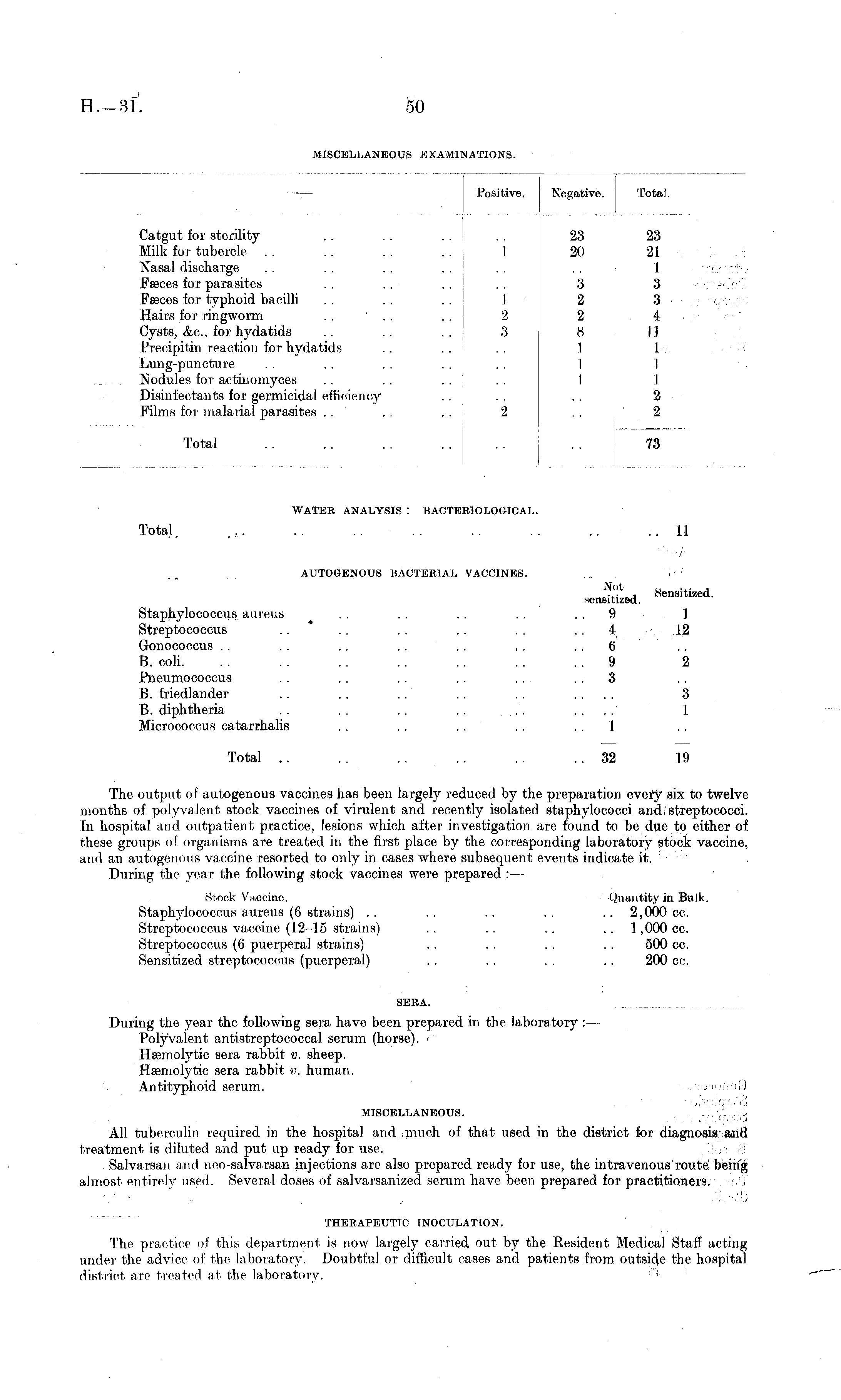 WATER ANALYSIS : BACTERIOLOGICAL. Total, ... .. .. .. .. .. .. ~ 11 AUTOGENOUS BACTERIAL VACCINES. Not ~ ... . ... , Sensitized, sensitized. Staphylococcus aureus . . . . . . .. .. 9 1 Streptococcus .. .. .. .. . . .. 4 12 Gonococcus .. .. .. .. .. 6 B. coli. .. .. .. .. .. .. 9 2 Pneumococcus .. .. .. .. .. .. 3 B. friedlander .. .. .. .. .. .... 3 B. diphtheria .. .. .. .. .. .... 1 Micrococcus catarrhalis .. .. . . . . . . I Total .. .. .. .. .. ..32 19 The output of autogenous vaccines has been largely reduced by the preparation every six to twelve months of polyvalent stock vaccines of virulent and recently isolated staphylococci and streptococci. In hospital and outpatient practice, lesions which after investigation are found to be due to either of these groups of organisms are treated in the first place by the corresponding laboratory stock vaccine, and an autogenous vaccine resorted to only in cases where subsequent events indicate it. •' During the year the following stock vaccines were prepared : — .Stock Vaccine. Quantity in Bulk. Staphylococcus aureus (6 strains) . . . . . . .. .. 2,000 cc. Streptococcus vaccine (12-15 strains) .. .. .. .. 1,000 cc. Streptococcus (6 puerperal strains) .. .. .. .. 500 cc. Sensitized streptococcus (puerperal) .. .. . . .. 200 cc. sera. _ During the year the following sera have been prepared in the laboratory : — Polyvalent antistreptococcal serum (horse). Hsemolytic sera rabbit v. sheep. Hsemolytic sera rabbit v. human. Antityphoid serum. ~/<)! J MISCELLANEOUS. . - I ,'- ;; All tuberculin required in the hospital and much of that used in the district for diagnosis and treatment is diluted and put up ready for use. , -. 8 Salvarsan and nco-salvarsan injections are also prepared ready for use, the intravenous route being almost entirely used. Several doses of salvarsanized serum have been prepared for practitioners. . ■■:■']' THERAPEUTIC INOCULATION. The practice of this department is now largely carried out by the Resident Medical Staff acting under the advice of the laboratory. Doubtful or difficult cases and patients from outside the hospital district are treated at the laboratory, '