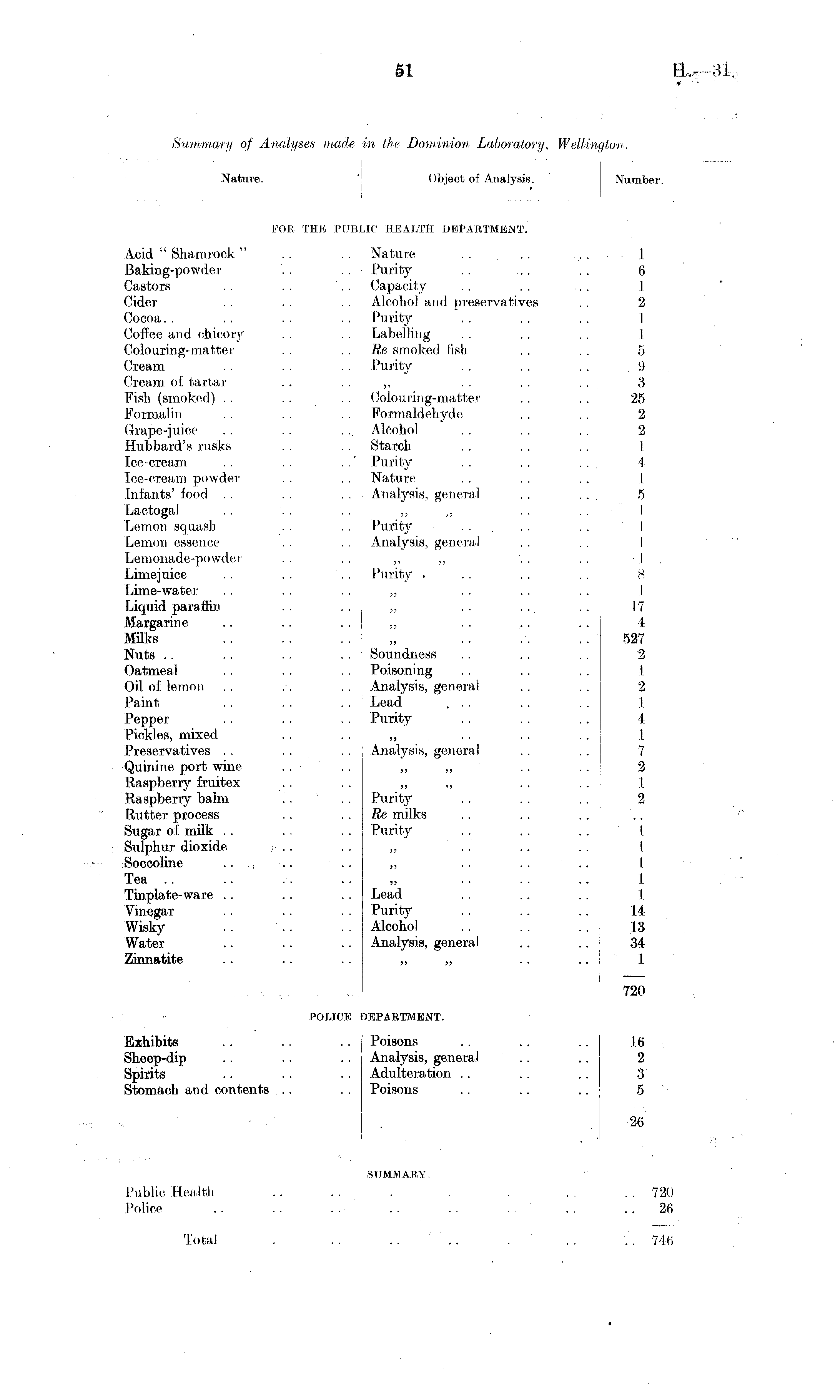 Nature. Object of Analysis. Number. FOR THE I'tJBI L1C HEALTH DEPARTMENT. Acid " Shamrock" . . ... I Baking-powder . . Castors CiderCocoa Coffee and chicory Colouring-matter Cream Cream of tartar Fish (smoked) Formalin Crape-juice Hubbard's rusks Ice-cream Ice-cream powder .. Infants' food .. .. Laotogal . . '.. Lemon squash .. Lemon essence .. Lemonade-powder . . Lime juice Lime-water Liquid paraffin Margarine Milks Nuts Oatmeal Oil of lemon Paint Pepper Pickles, mixed Preservatives Quinine port wine Raspberry fruitex Raspberry balm Butter process Sugar ol: milk Sulphur dioxide ; Soccoline .. -;j .. Tea .. Tinplate-ware Vinegar Wisky Water Zinnatite Nature i Purity Capacity Alcohol and preservatives Purity Labelling Re smoked fish Purity Colouring-matter Formaldehyde Alcohol Starch Purity Nature Analysis, general I! iS , . . | Purity Analysis, general Purity . I. • • • • i? • ■ ,. ■ ?i Soundness Poisoning Analysis, general Lead ... Purity ,, Analysis, general I, ii I, ., Purity Re milks Purity .. .. ,, . . ,, Lead Purity Alcohol Analysis, general ,, ,, ■ f • j ■ ■ 1 6 1 2 1 I 5 9 3 25 2 2 1 4 1 5 1 1 I 1 8 I 17 4 527 2 1 2 1 4 1 7 2 1 2 I I I 1 1 14 13 34 1 720 POLICE I DEPARTMENT. Exhibits Sheep-dip Spirits Stomach and contents Poisons Analysis, general Adulteration Poisons 16 2 3 5 26 SUMMARY. Public Health Police .. 720 .. 26 Total :. 746